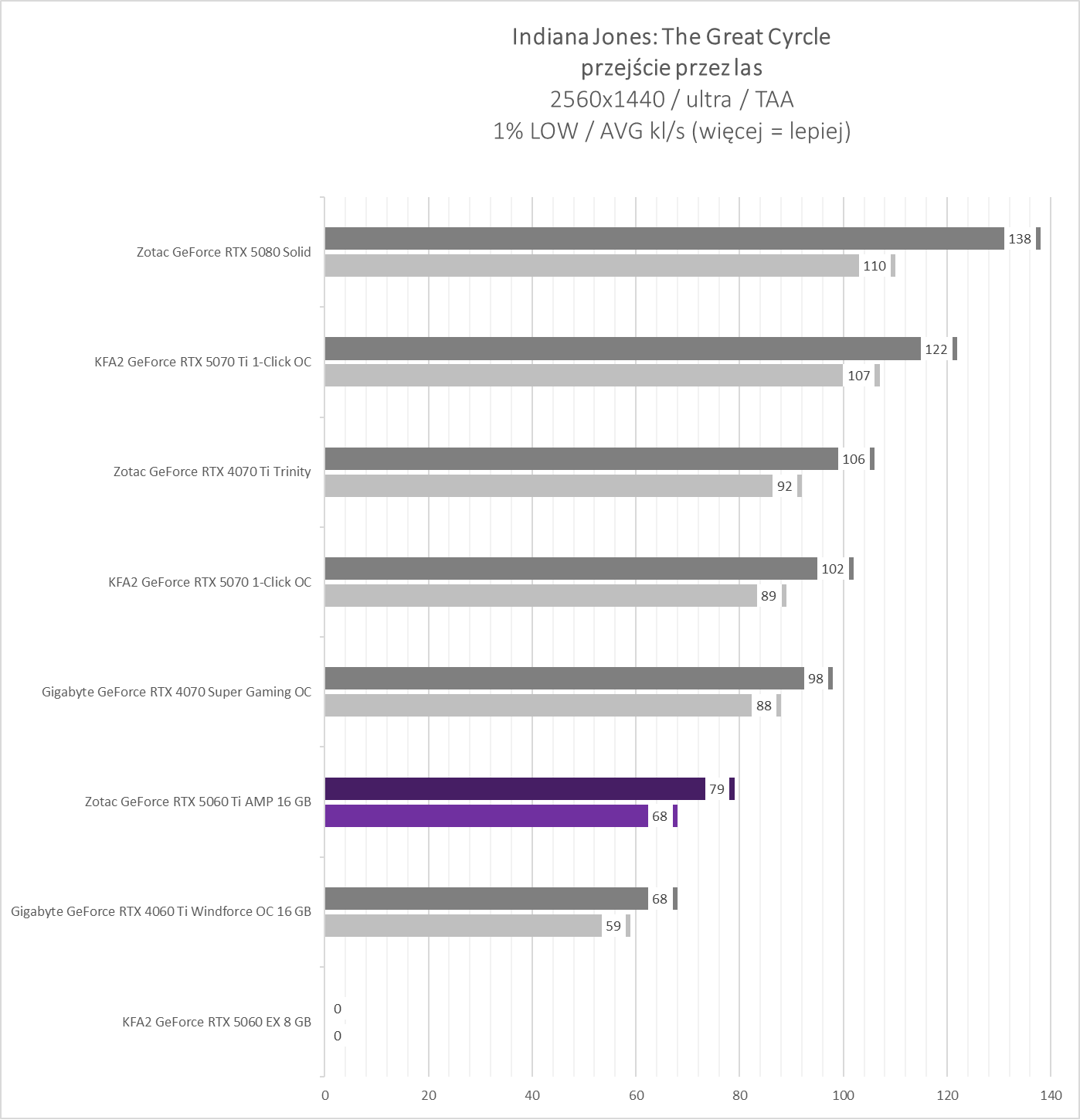 Ok, mamy wsparcie dla DLSS 4 i Multi Frame Generatora. Ale to też kwestia dyskusyjna, bowiem technologie te czerpią z pamięci VRAM a tej jest mało w standardzie. 8 GB VRAM to zdecydowanie za mała ilość w wielu grach w bazowej rozdzielczości 1920×1080 i detalach/teksturach ultra już teraz (najnowszy Indiana Jones np.), a co dopiero w przyszłości.