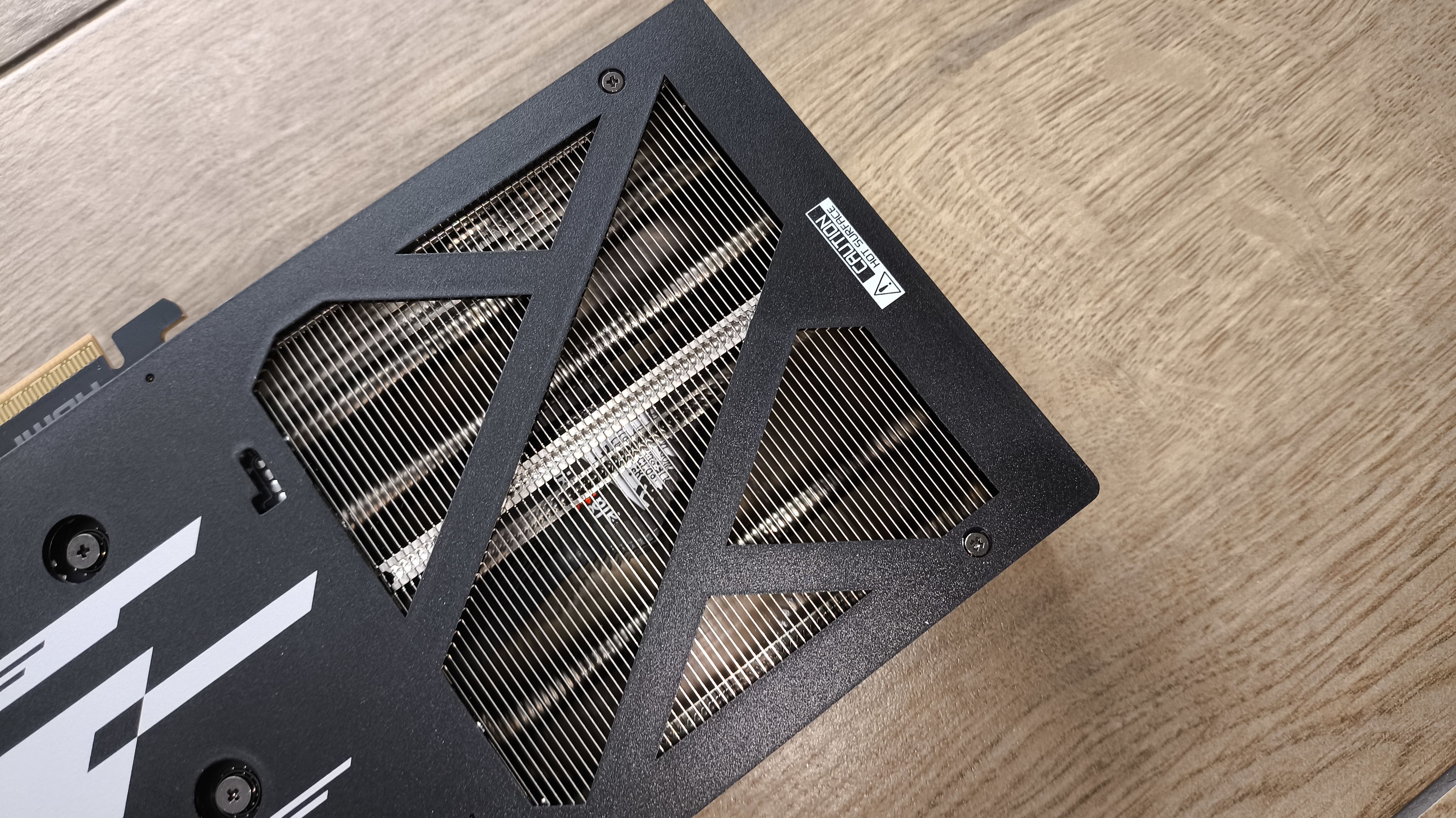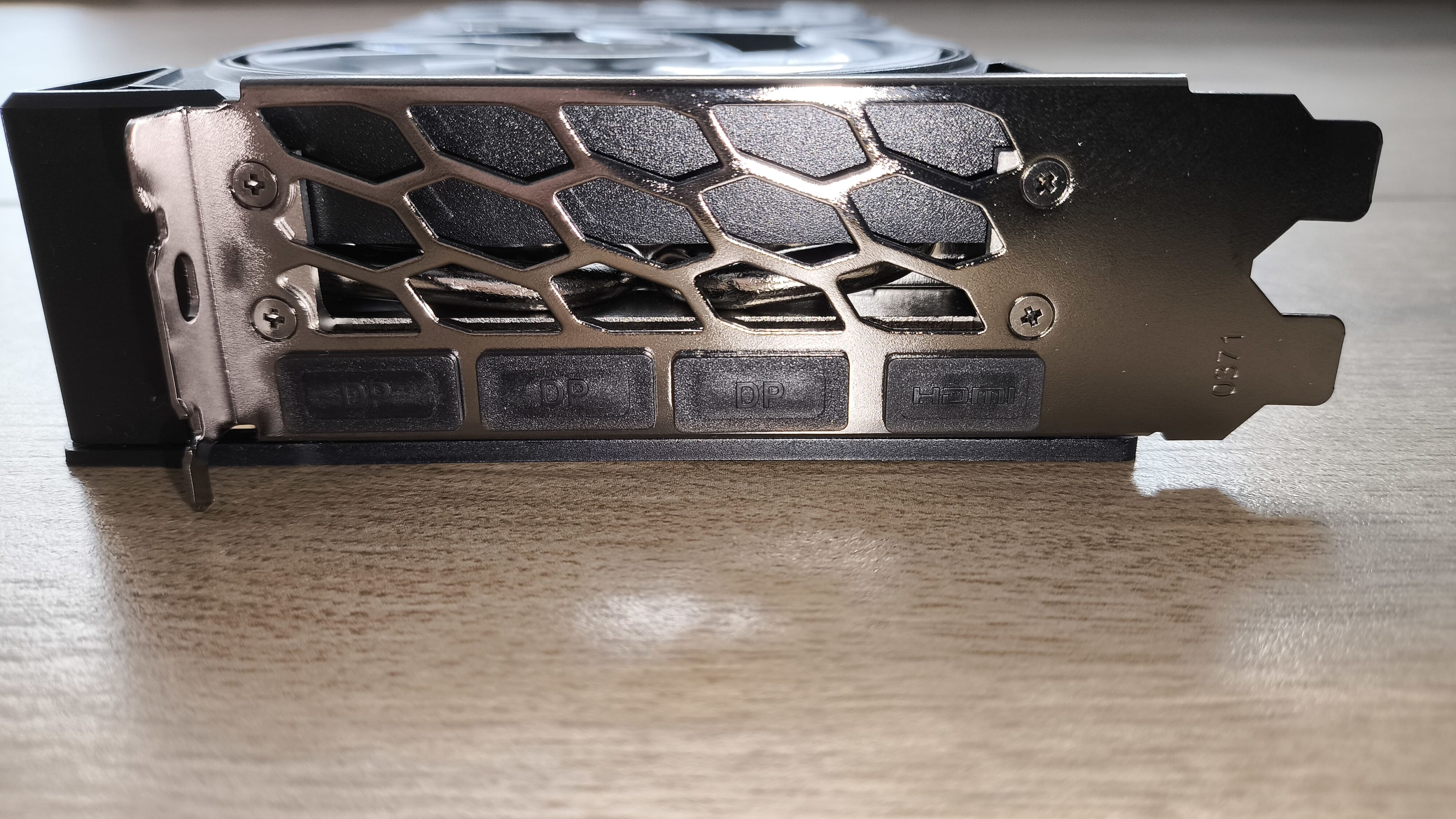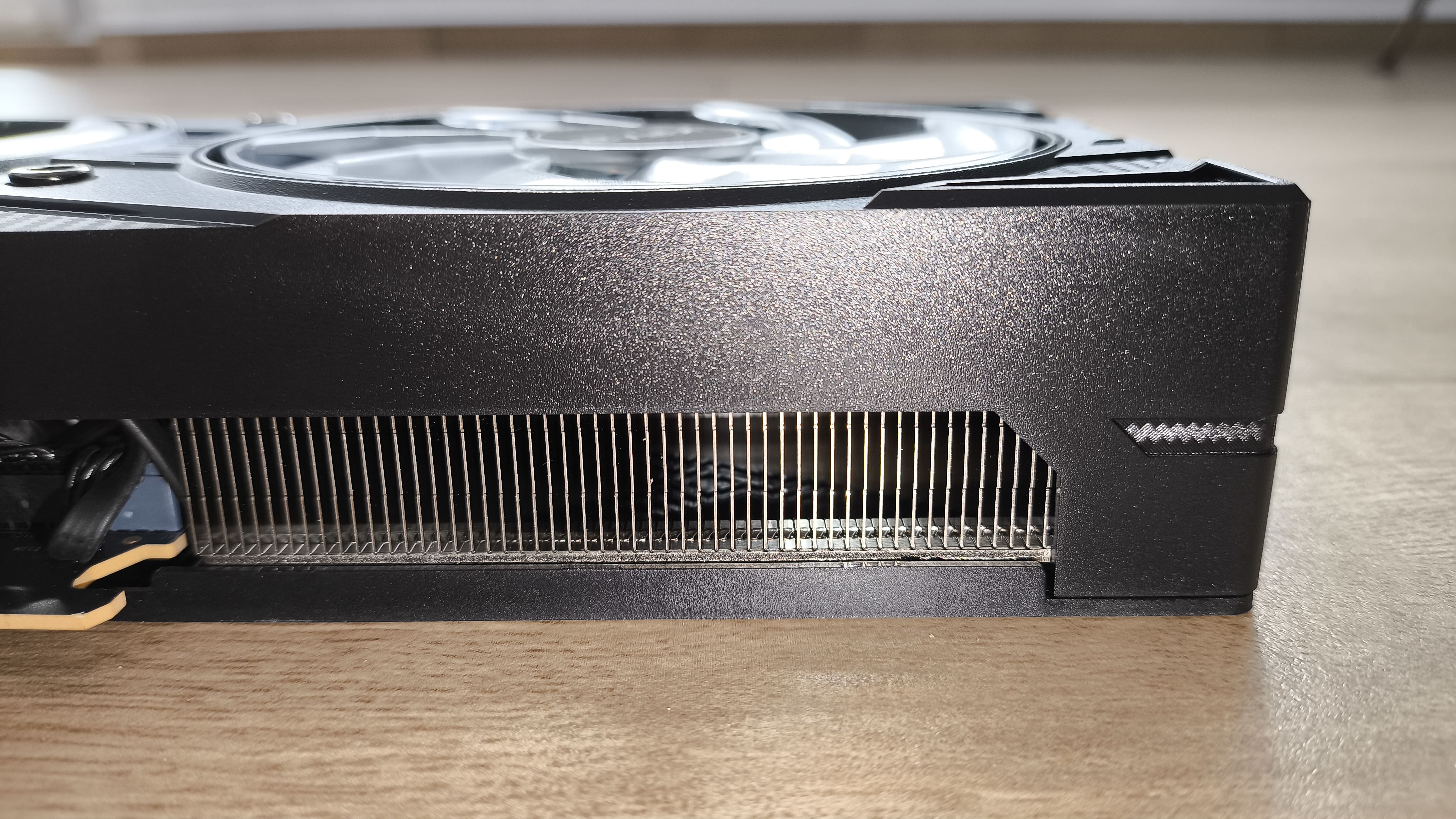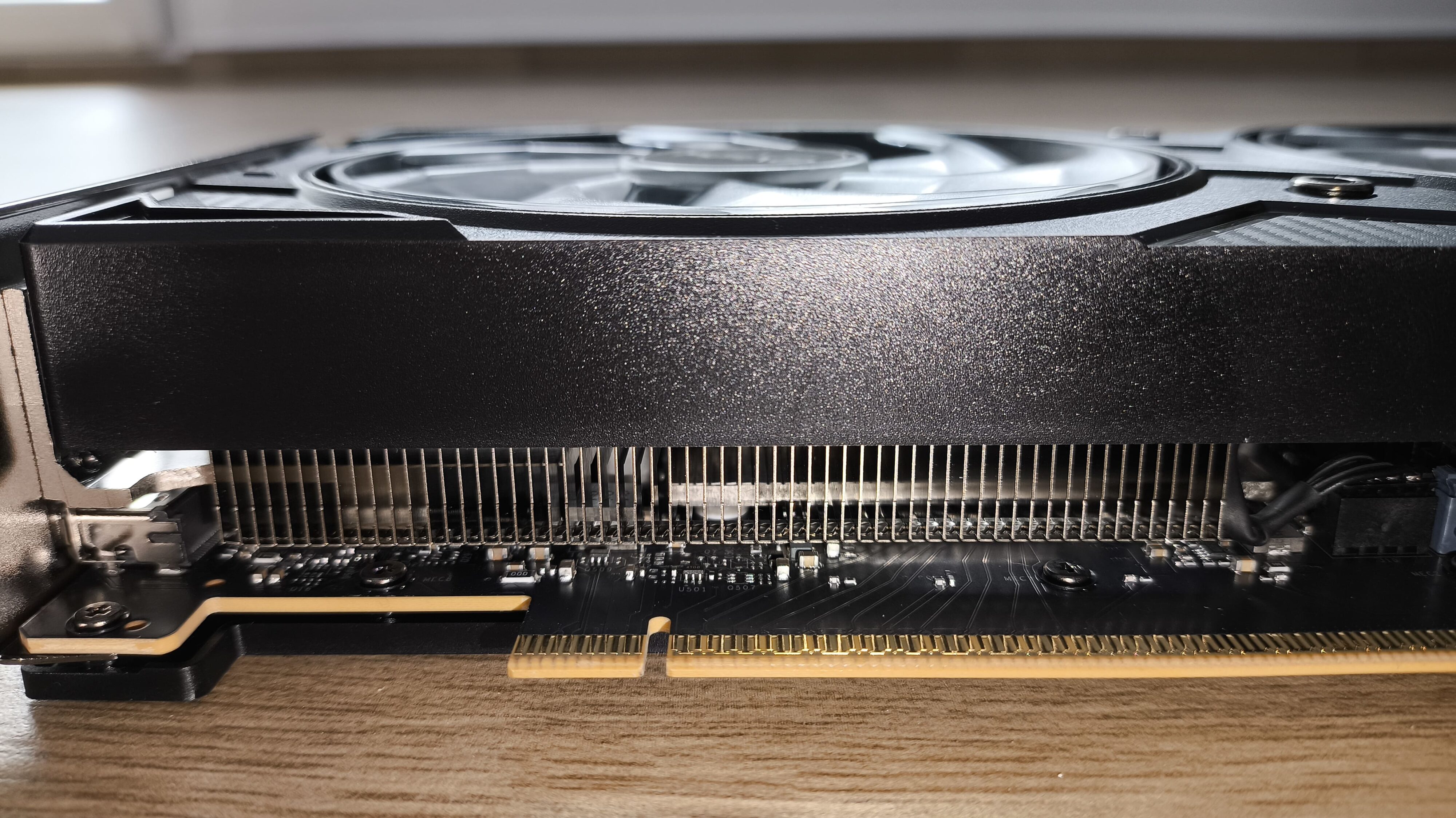 Na rewersie zamontowano plastikowy backplate, który pełni zarówno funkcję estetyczną, jak i wzmacnia całą strukturę karty. W tylnej części backplate’u umieszczono duży otwór wentylacyjny, poprawiający przepływ powietrza i wspomagający odprowadzanie ciepła z rejonu radiatora.