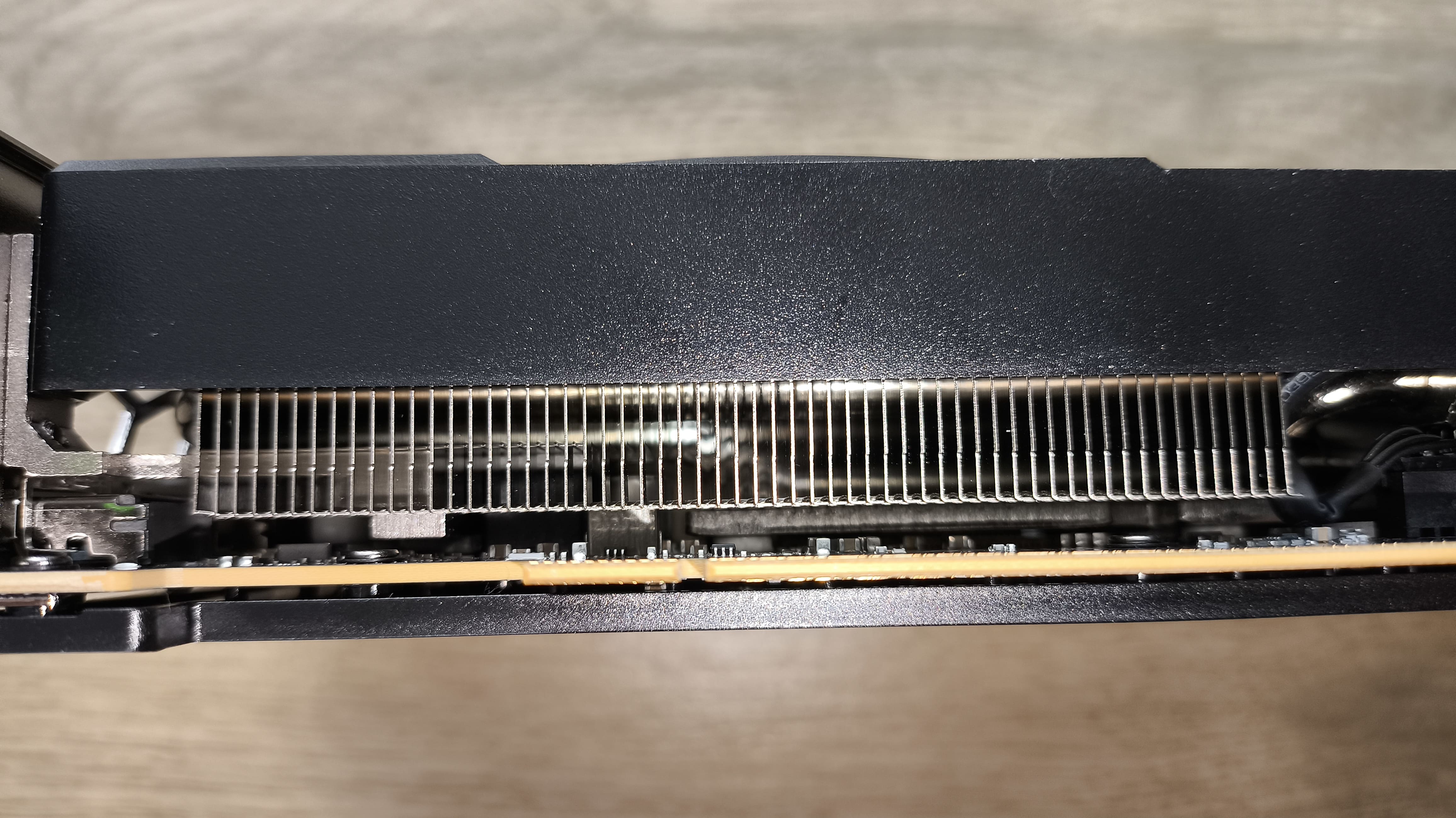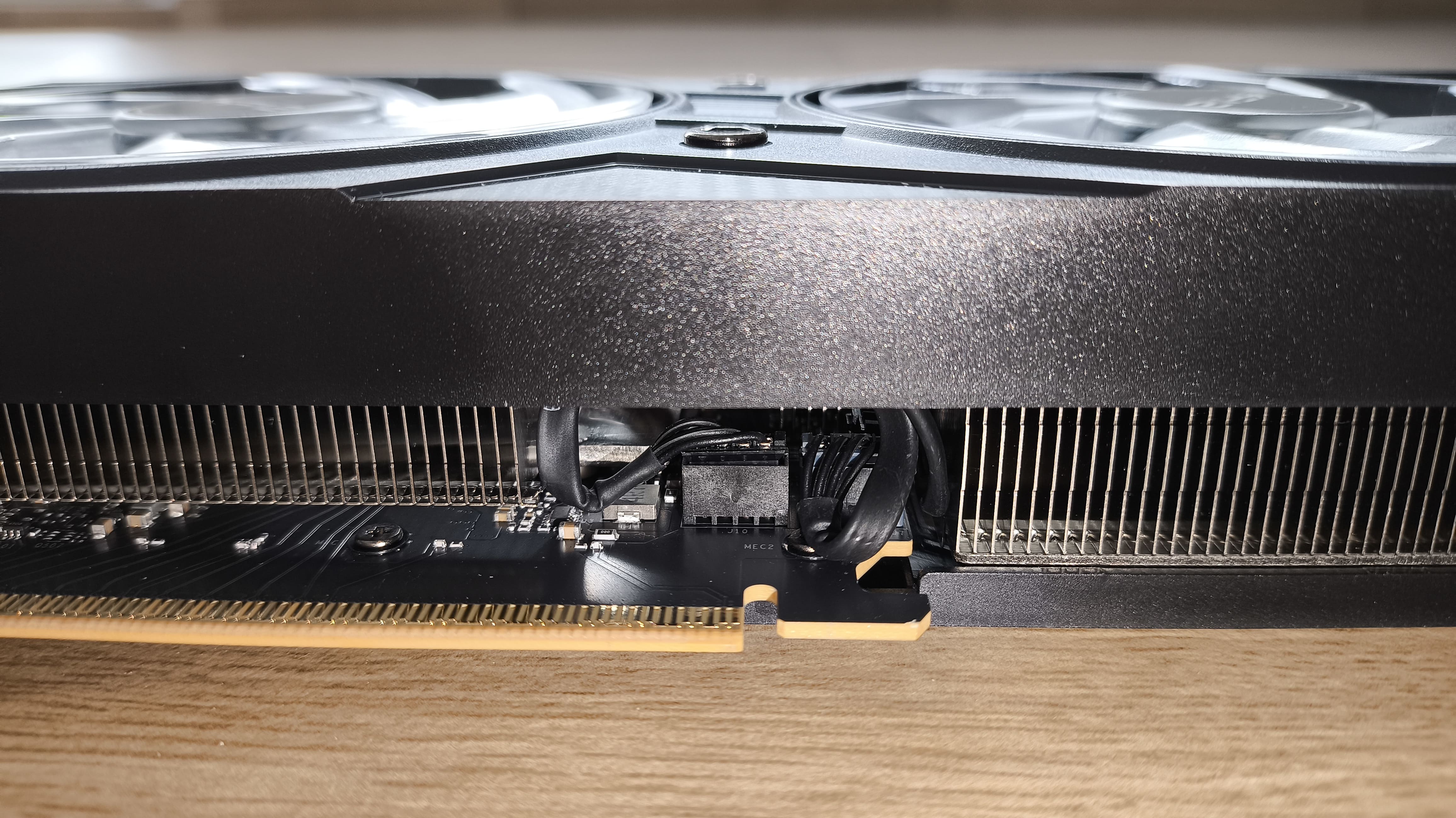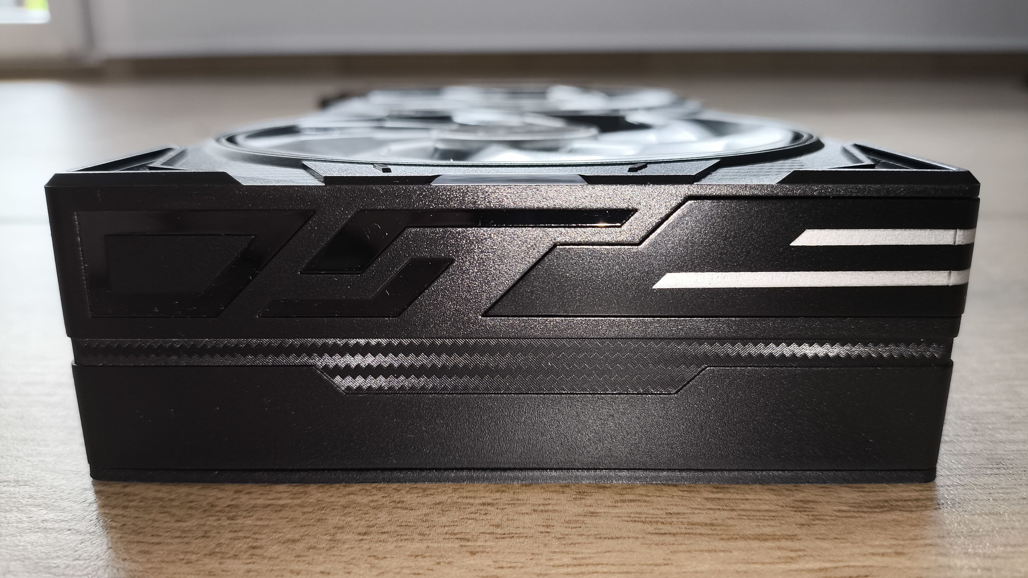 Na rewersie zamontowano plastikowy backplate, który pełni zarówno funkcję estetyczną, jak i wzmacnia całą strukturę karty. W tylnej części backplate’u umieszczono duży otwór wentylacyjny, poprawiający przepływ powietrza i wspomagający odprowadzanie ciepła z rejonu radiatora.