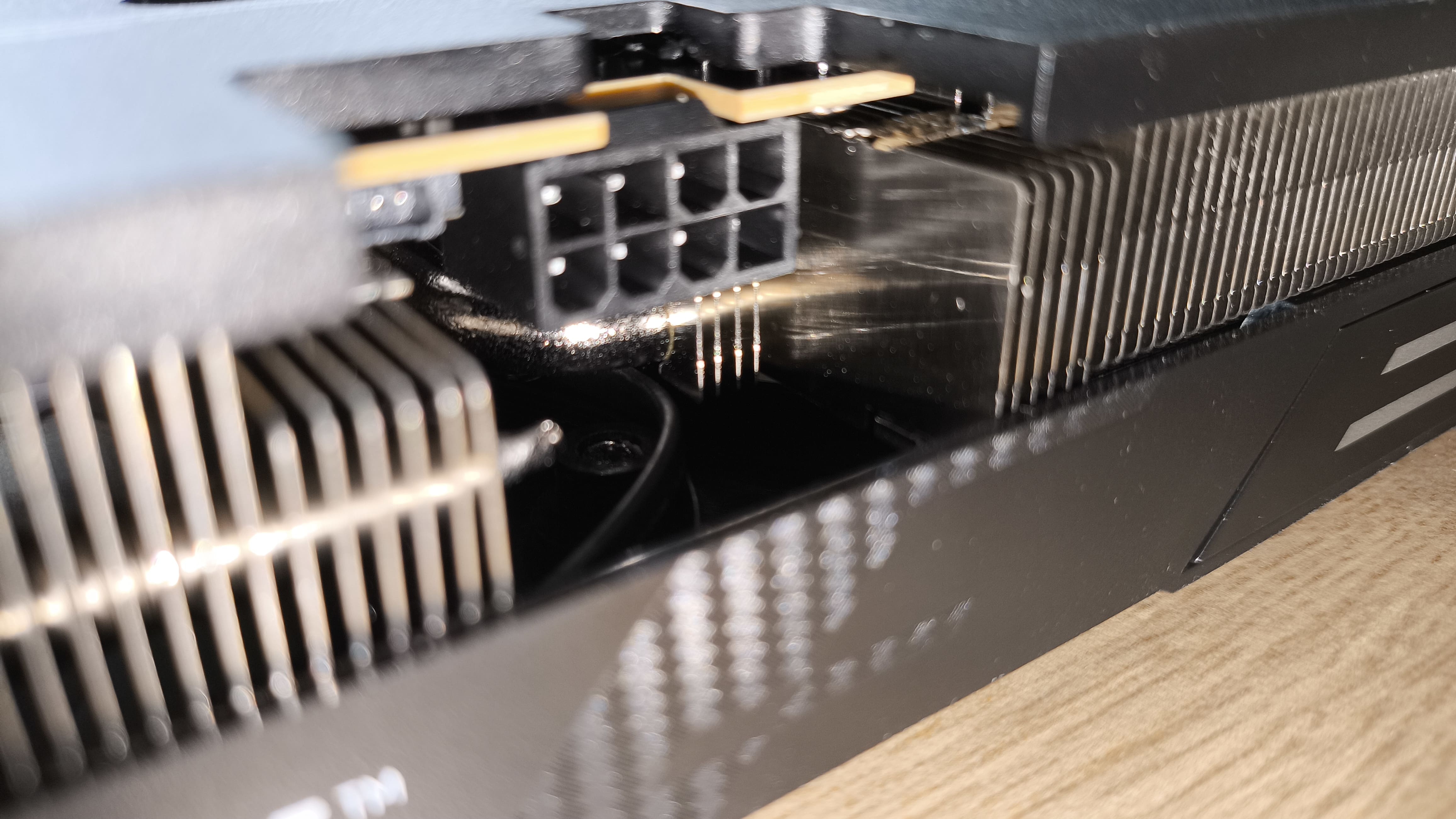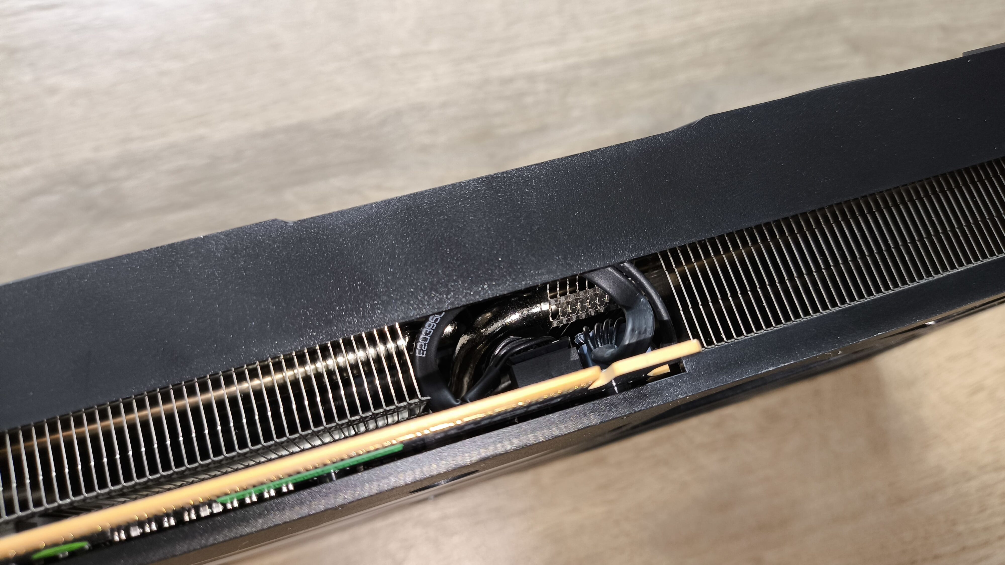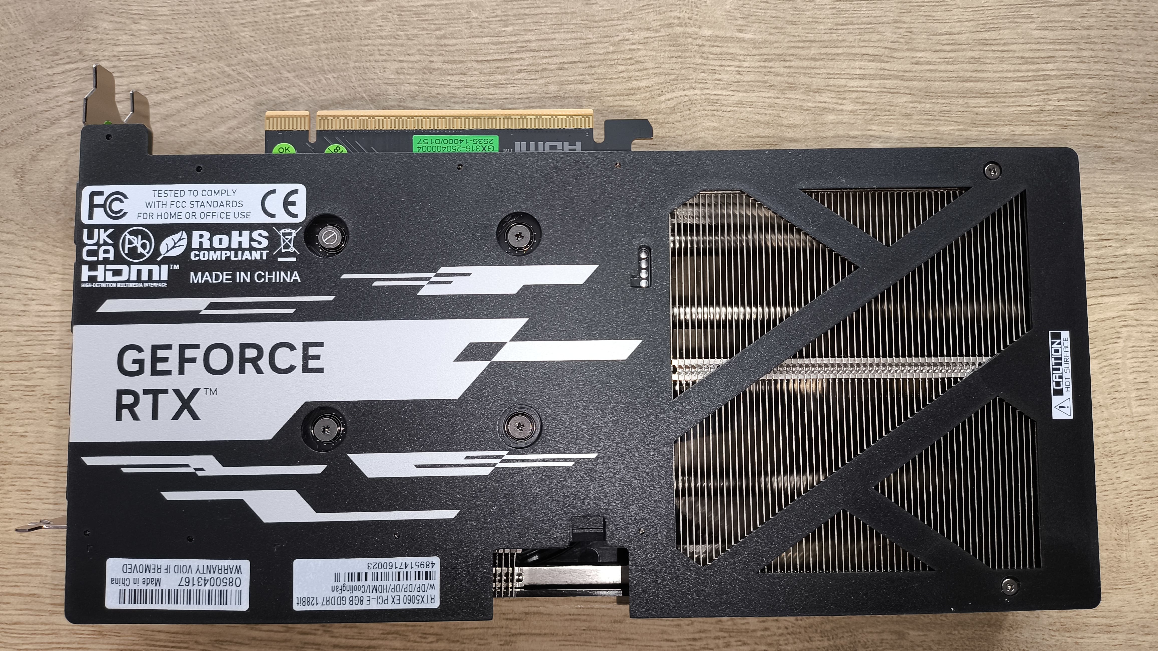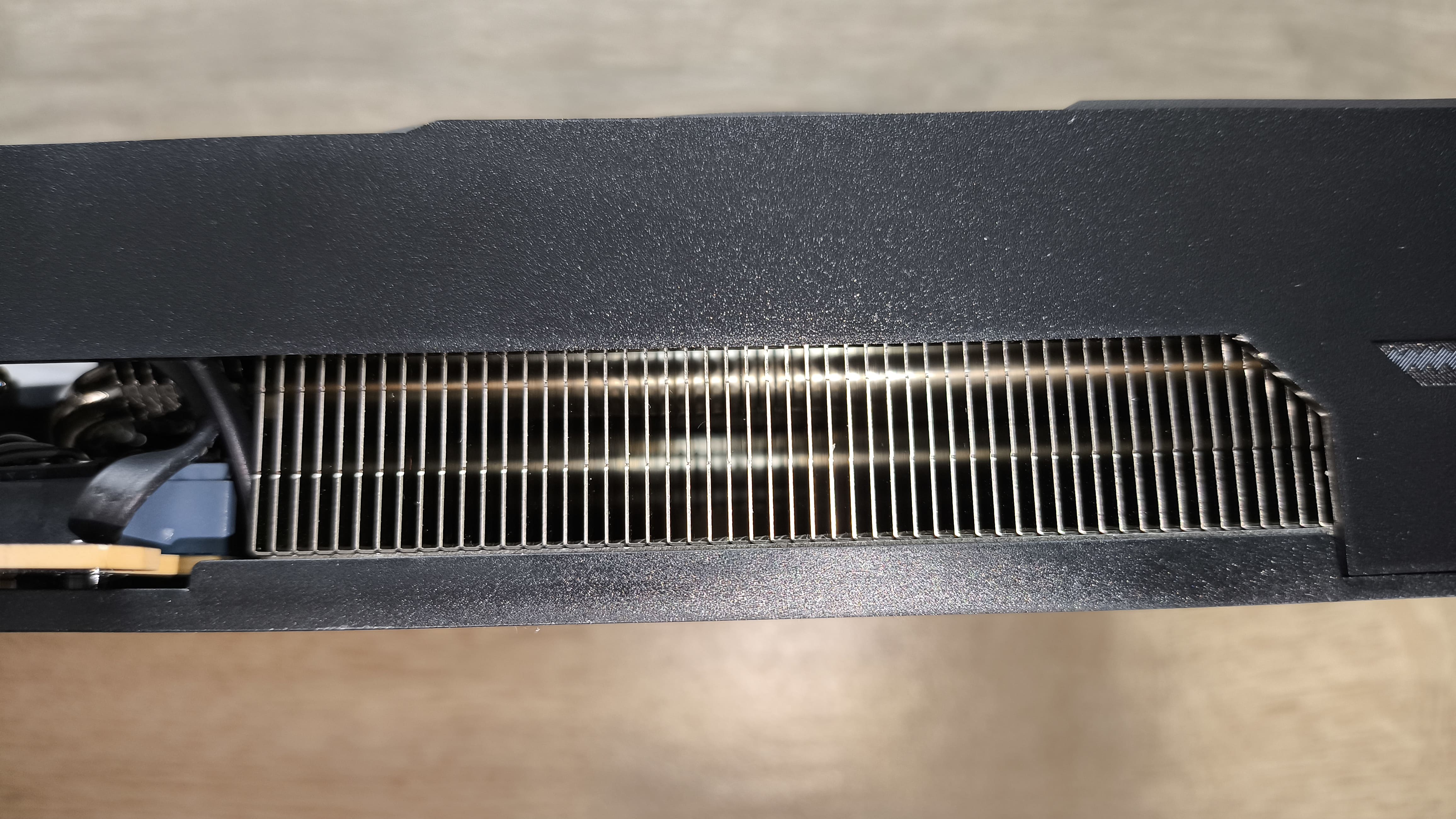 Na rewersie zamontowano plastikowy backplate, który pełni zarówno funkcję estetyczną, jak i wzmacnia całą strukturę karty. W tylnej części backplate’u umieszczono duży otwór wentylacyjny, poprawiający przepływ powietrza i wspomagający odprowadzanie ciepła z rejonu radiatora.