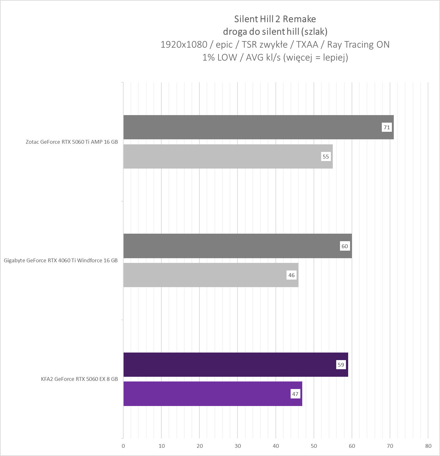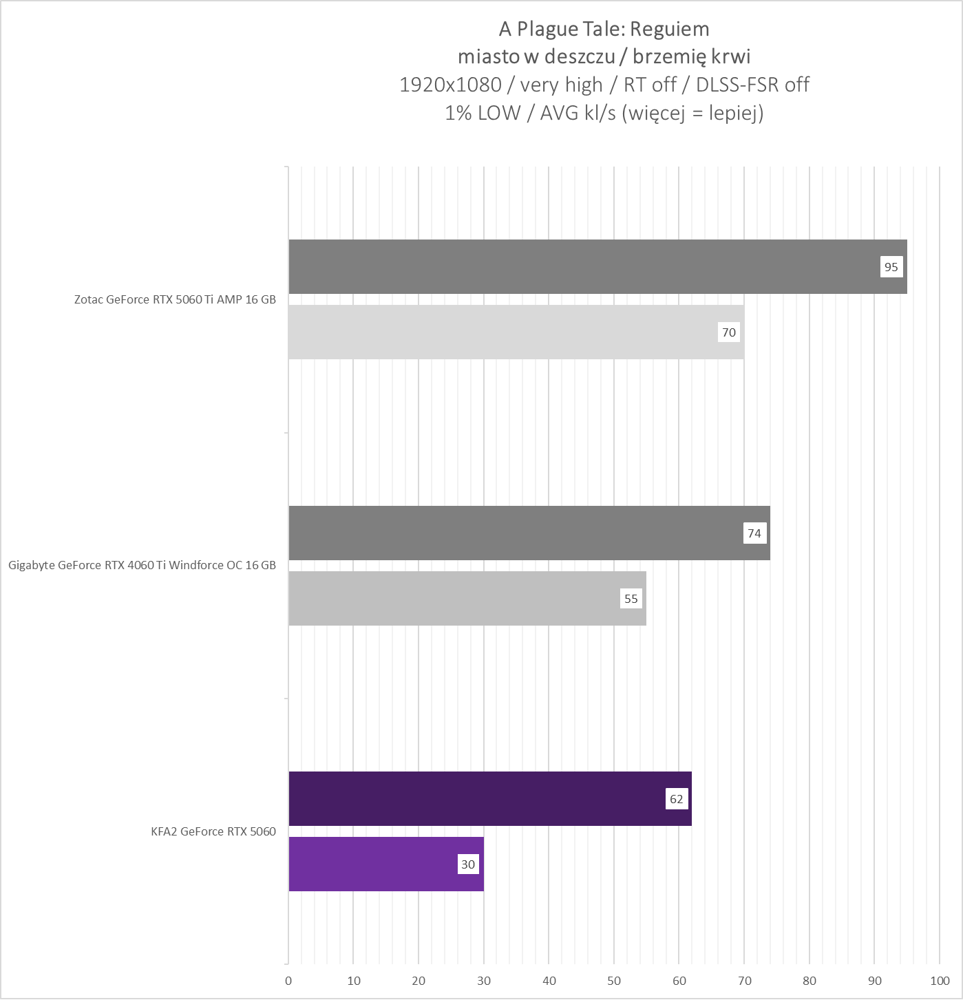 Cena zakupu karty też nie będzie jakoś wybitnie atrakcyjna. Karta (ogólnie typoszereg RTX 5060) nie ma na tę chwilę bezpośredniego rywala w obozie AMD (tj. zwykły RX 9060). Można wybierać w starszych konstrukcjach takich jak głównie RX 7700 XT. Plusem jest to, że ma on więcej VRAM, ale z kolei z drugiej strony jest dużo słabszy w Ray Tracing’u. Tylko czy tego typu karty są stworzone aby grać w tym trybie? No tak średnio bym powiedział.