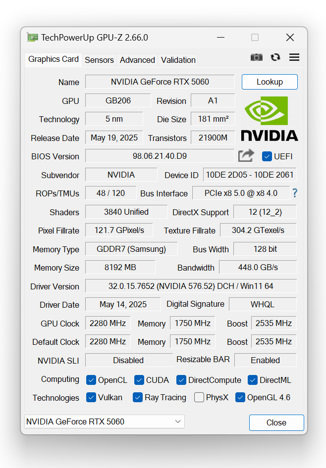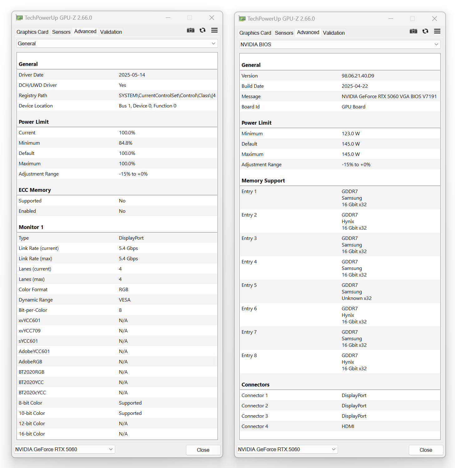 Konfiguracja pamięci jest identyczna jak w modelu RTX 5060 Ti 8 GB – otrzymujemy pamięć GDDR7 o przepustowości 28 Gbps podłączoną przez 128-bitowy interfejs, co daje 448 GB/s przepustowości pamięci. Taktowanie GPU jest znacząco obniżone, z częstotliwością boost wynoszącą 2497 MHz w porównaniu do 2572 MHz w RTX 5060 Ti, ale przy znacząco obniżonym całkowitym poborze mocy graficznej (TGP) wynoszącym 145 W (wobec 180 W). To wpływa na stabilność utrzymywania taktowania boost.