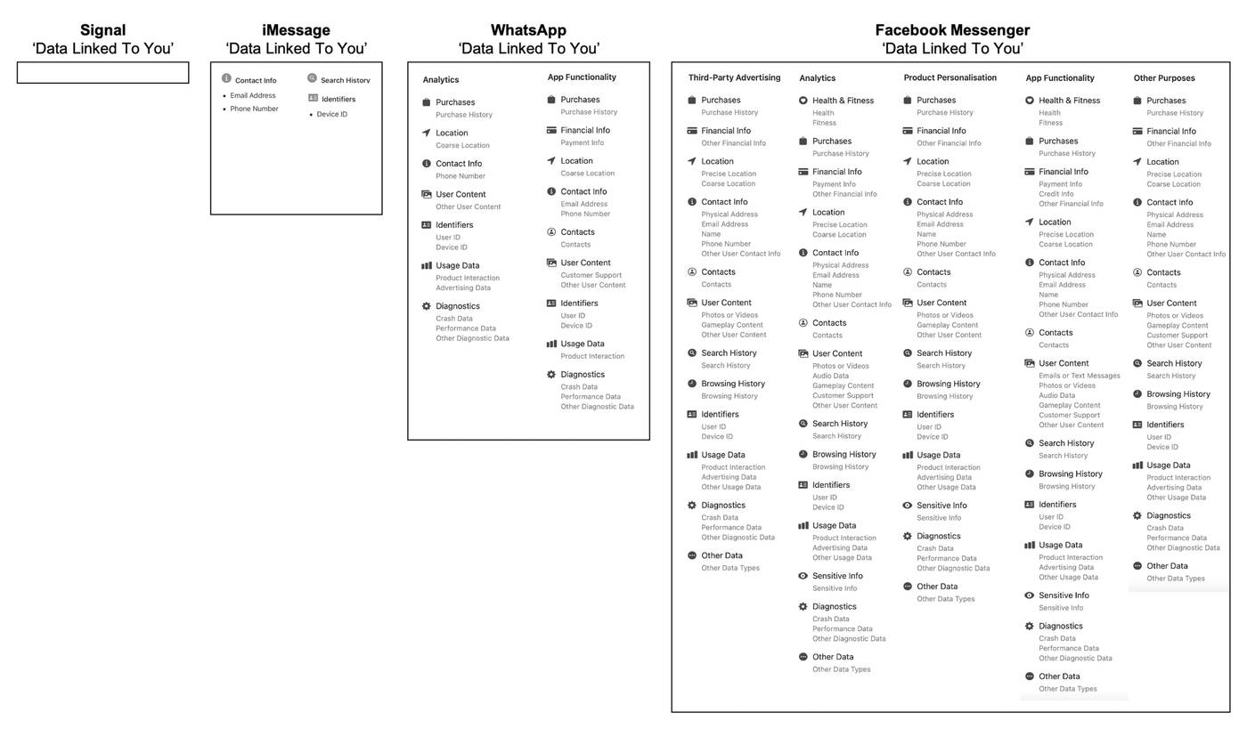 Powyżej widzicie zestawienie czterech popularnych komunikatorów bazujące na etykietach wprowadzonych przez Apple. Niechlubne pierwsze miejsce zajmuje… Messenger, choć to raczej nikogo nie powinno dziwić. Jednak kiedy pewne dane udostępniamy raz na jakiś czas nie widzimy jak wiele ich jest. Teraz można zobaczyć jakie informacje gromadzi o nas ten komunikator. Widzimy, że oprócz historii wyszukiwania czy informacji o kontaktach Messenger zbiera informacje o historii płatności, a nawet ma dostęp do posiadanych na smartfonie materiałów wideo i zdjęć. Trochę niepokojące, prawda?