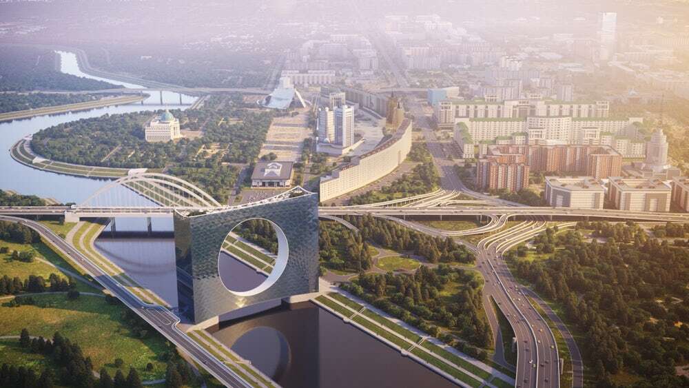 Jeśli zostanie zbudowany – i nie, nie ma natychmiastowych planów – wieżowiec o różnym przeznaczeniu osiągnąłby wysokość 121 metrów i połączył brzegi rzeki Ishim w Kazachstanie. Jego 75 000 m² powierzchni zajmowałyby powierzchnie mieszkalne, biurowe, hotelowe i typowo komercyjne. Jako że mowa o mieście w Kazachstanie, to nie zabrakło istotnych inspiracji, o których Fundamental Architects mówi następująco: