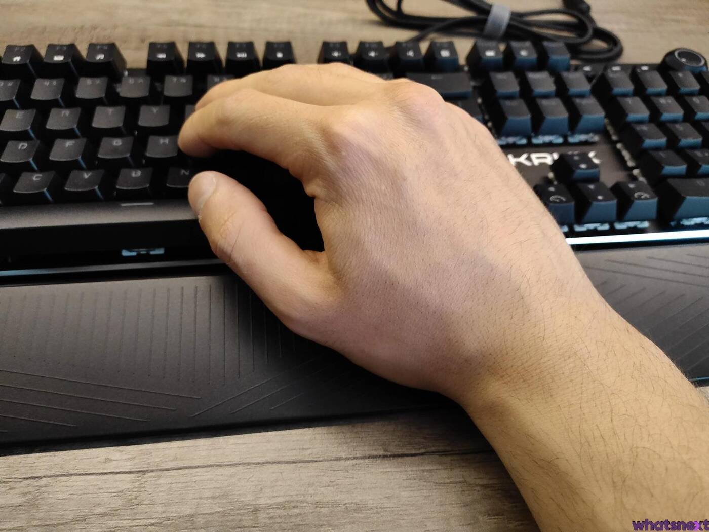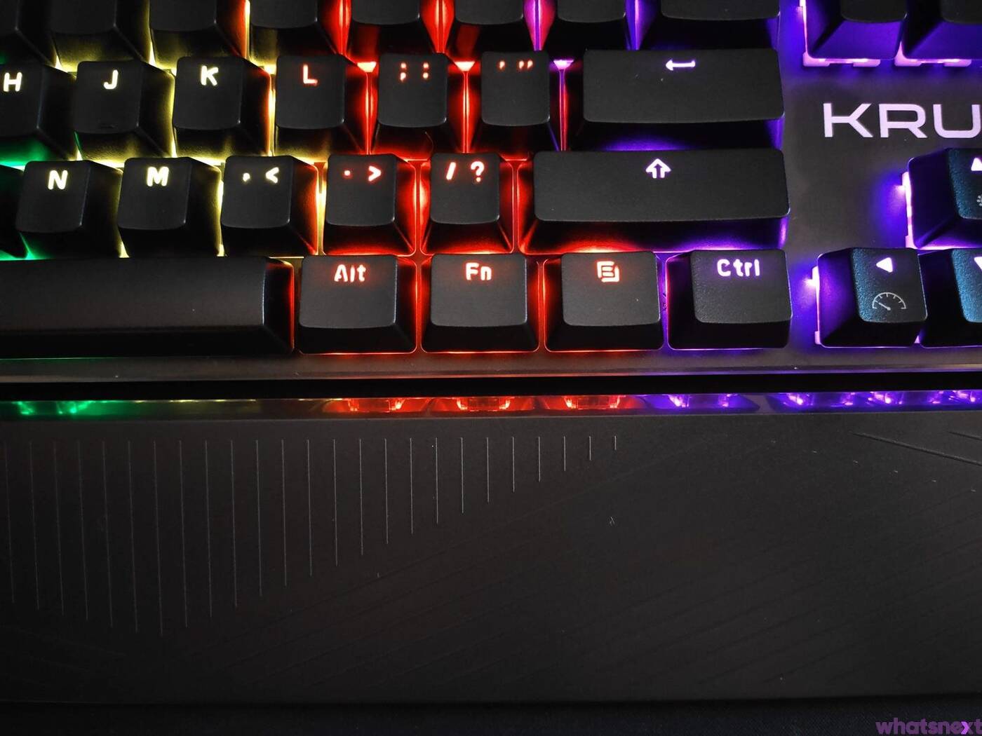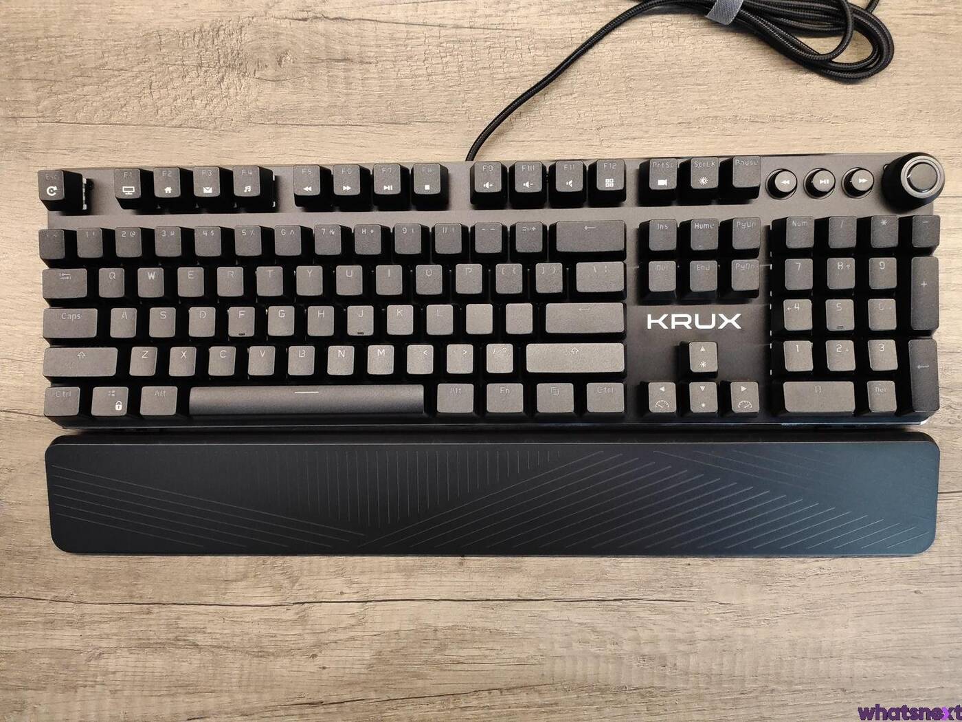 Wizualne dodatki uzupełnia biała nazwa producenta nad blokiem strzałek i plastikowa podkładka z fakturą, przypominającą ewidentnie górną część litery „X”. Ta dopełnia w ciekawy sposób Krux Crato RGB, zapewniając dodatkowo płynniejsze przejście z najwyższego punktu klawiatury na górnej krawędzi. Ta tradycyjnie zwęża się ku dołowi.
