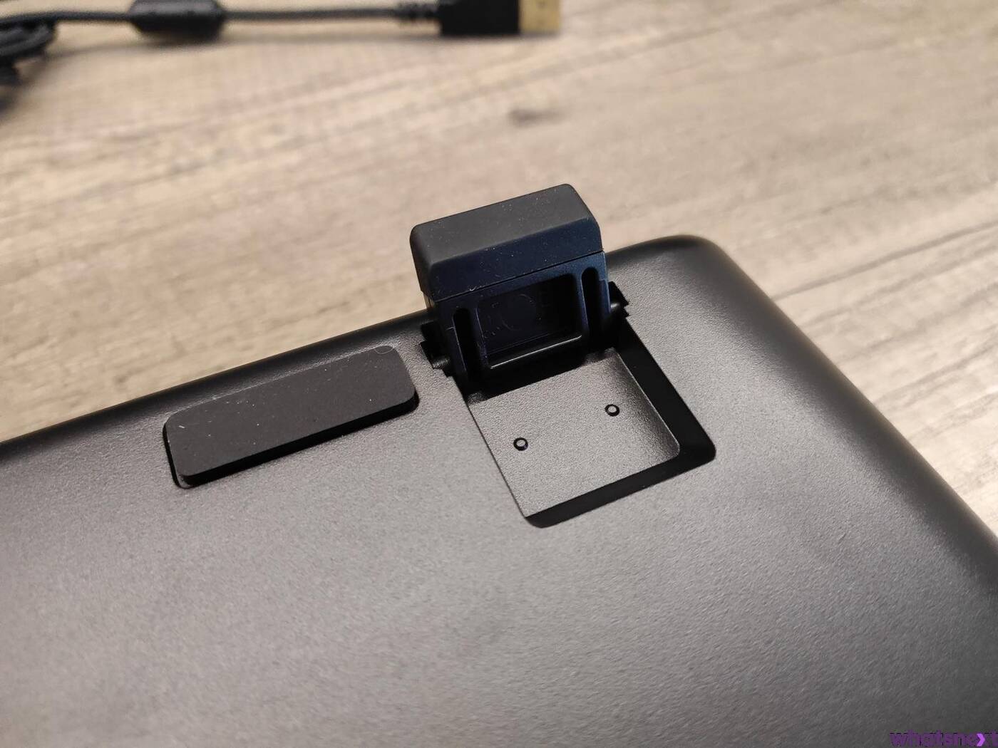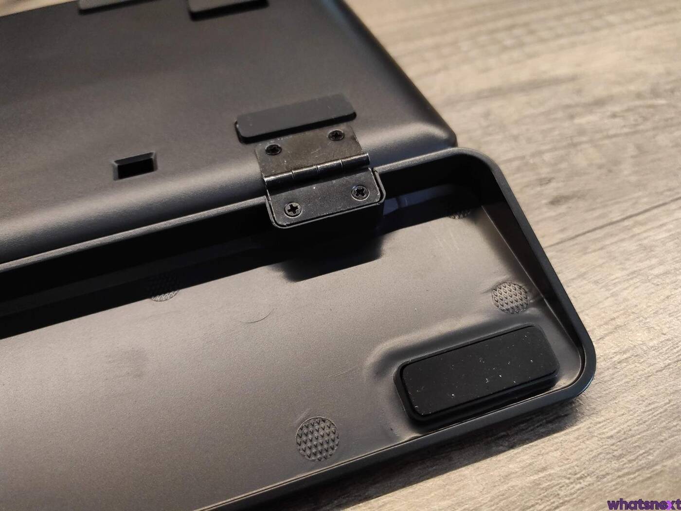 Na spodzie Krux Crato RGB czeka nas nic specjalnego. Cztery antypoślizgowe podkładki, dwie nóżki również z gumowym wyłożeniem i… zawiasy. Dokładnie dwa, które łączą podkładkę pod nadgarstki z resztą klawiatury. Dzięki temu możemy złożyć podkładkę „pod klawiaturę”, zapewniając sobie nietypowy kąt, co nie jest wcale użyteczne. Na spodzie podkładki znalazły się też trzy dodatkowe gumowe wstawki, ale nie są one w stanie utrzymać klawiatury na blacie. Zwłaszcza po rozłożeniu nóżek, które składają się zbyt łatwo i czasem wystarczy tylko delikatnie przesunąć Krux Crato RGB w tył, aby te nóżki się złożyły.
