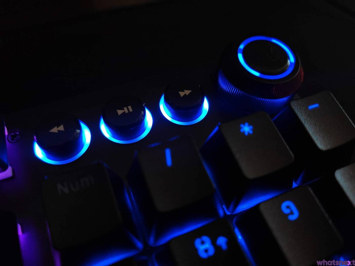 Na wizualny zachwyt nie macie co liczyć, bo choć „RGB” model w nazwie ma, to jego podświetlenie zostało podzielone na sześć sekcji w kwestii kolorów. Tak też idąc od lewej mamy niebieski, zielony, żółty, czerwony, fioletowy i… znów niebieski. Diody może i znajdują się pod każdym przełącznikiem i klawiszem, ale są jednokolorowe. Wpływać możemy jednak na ich szybkość efektów i jasność na pięciu poziomach, gdzie szósty jest już ich dezaktywacją.