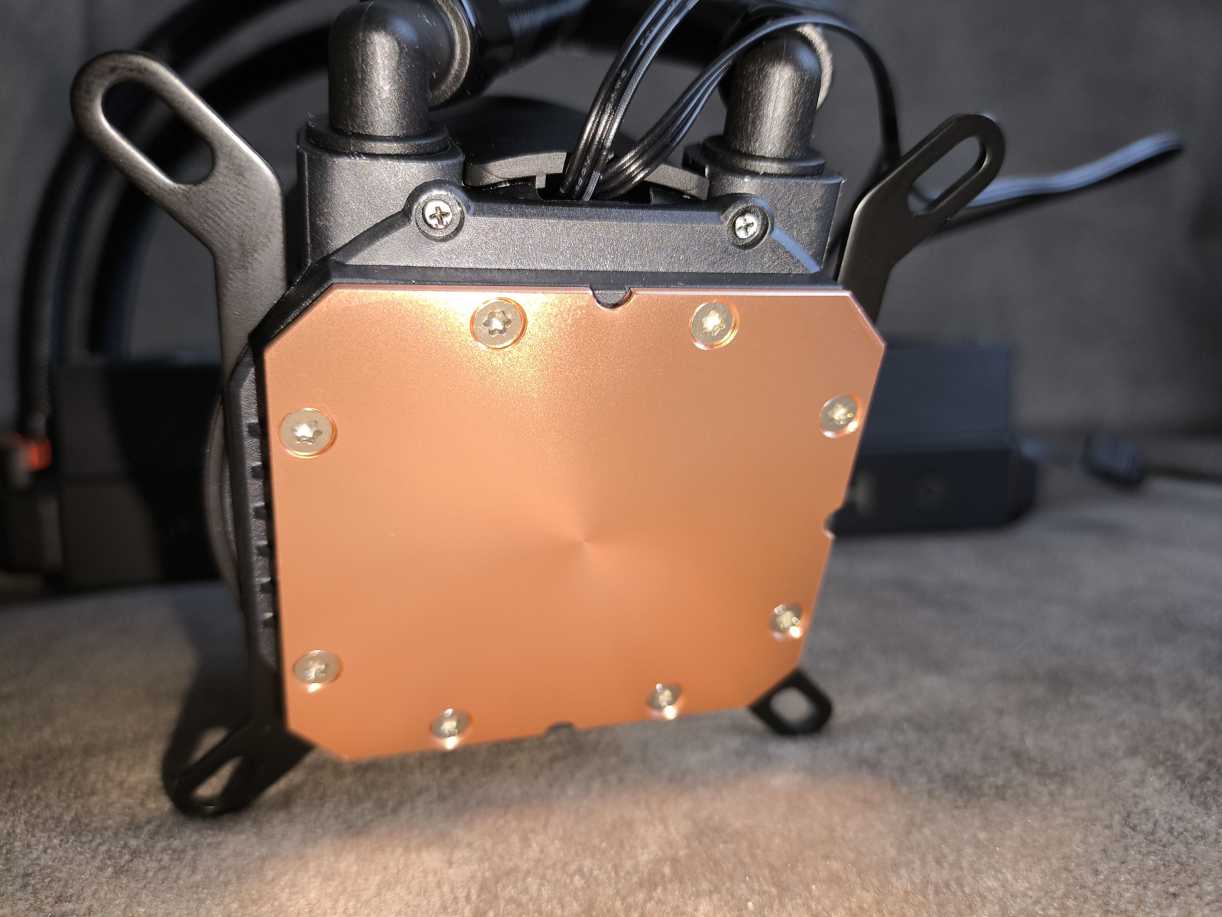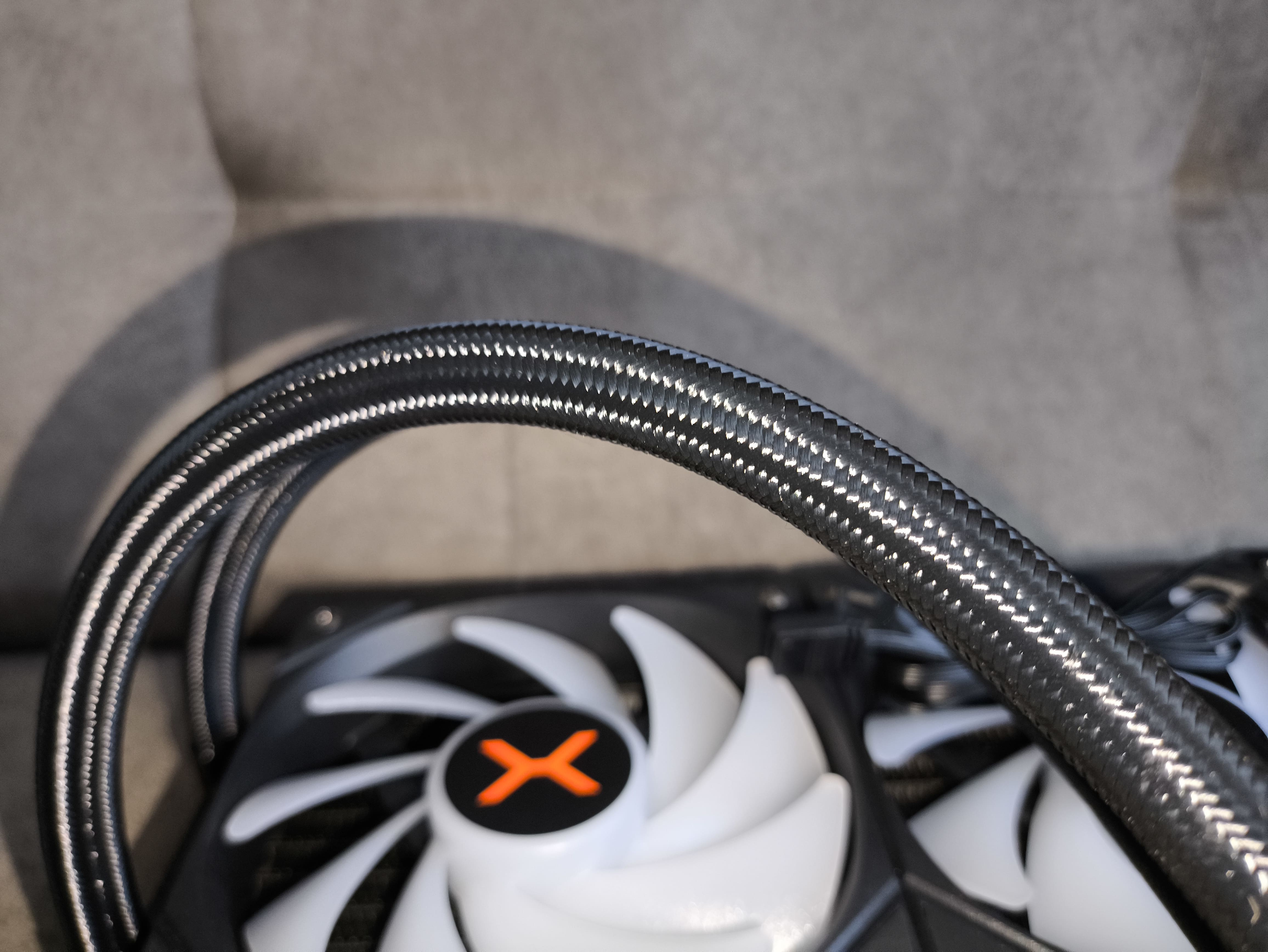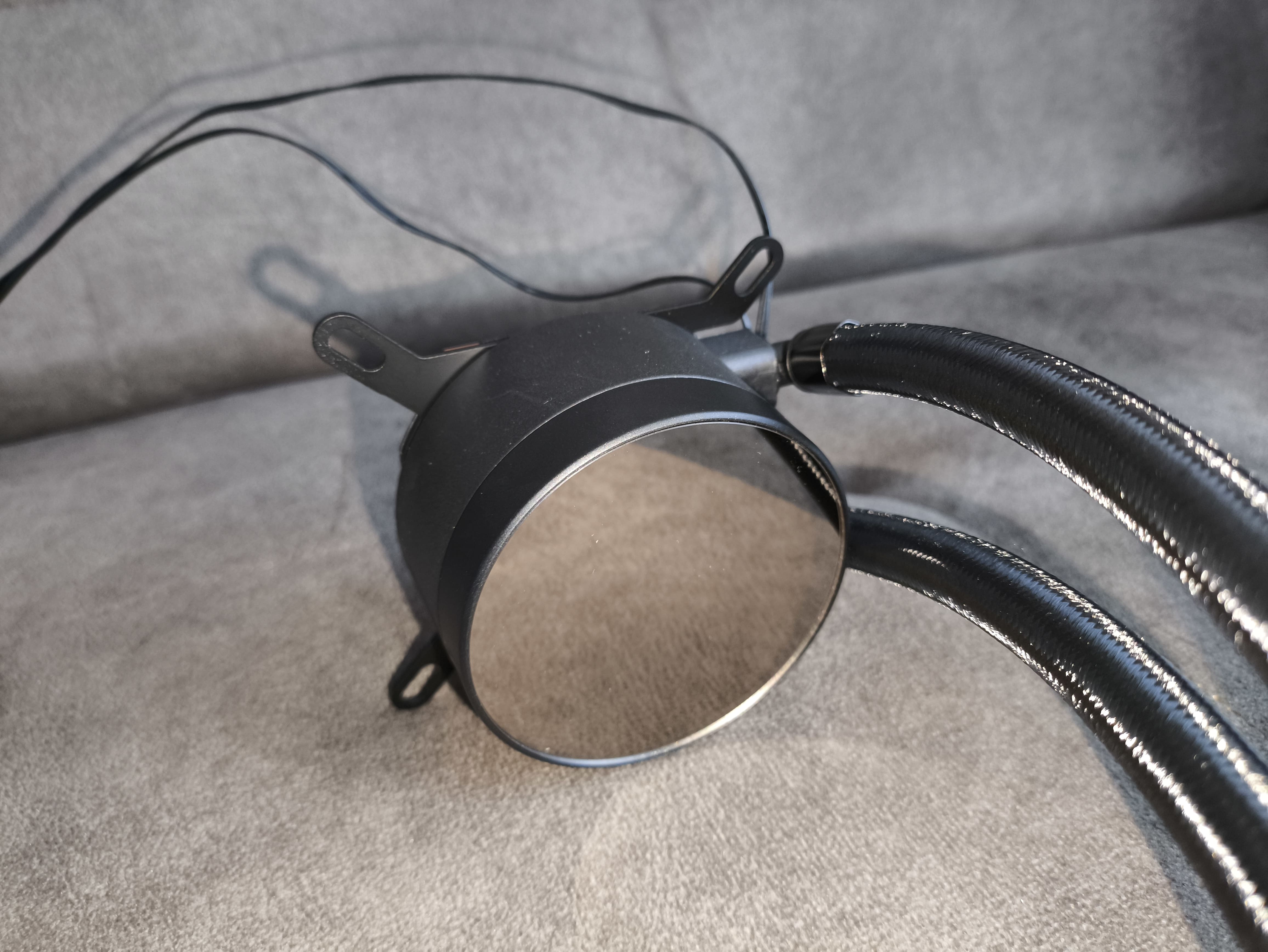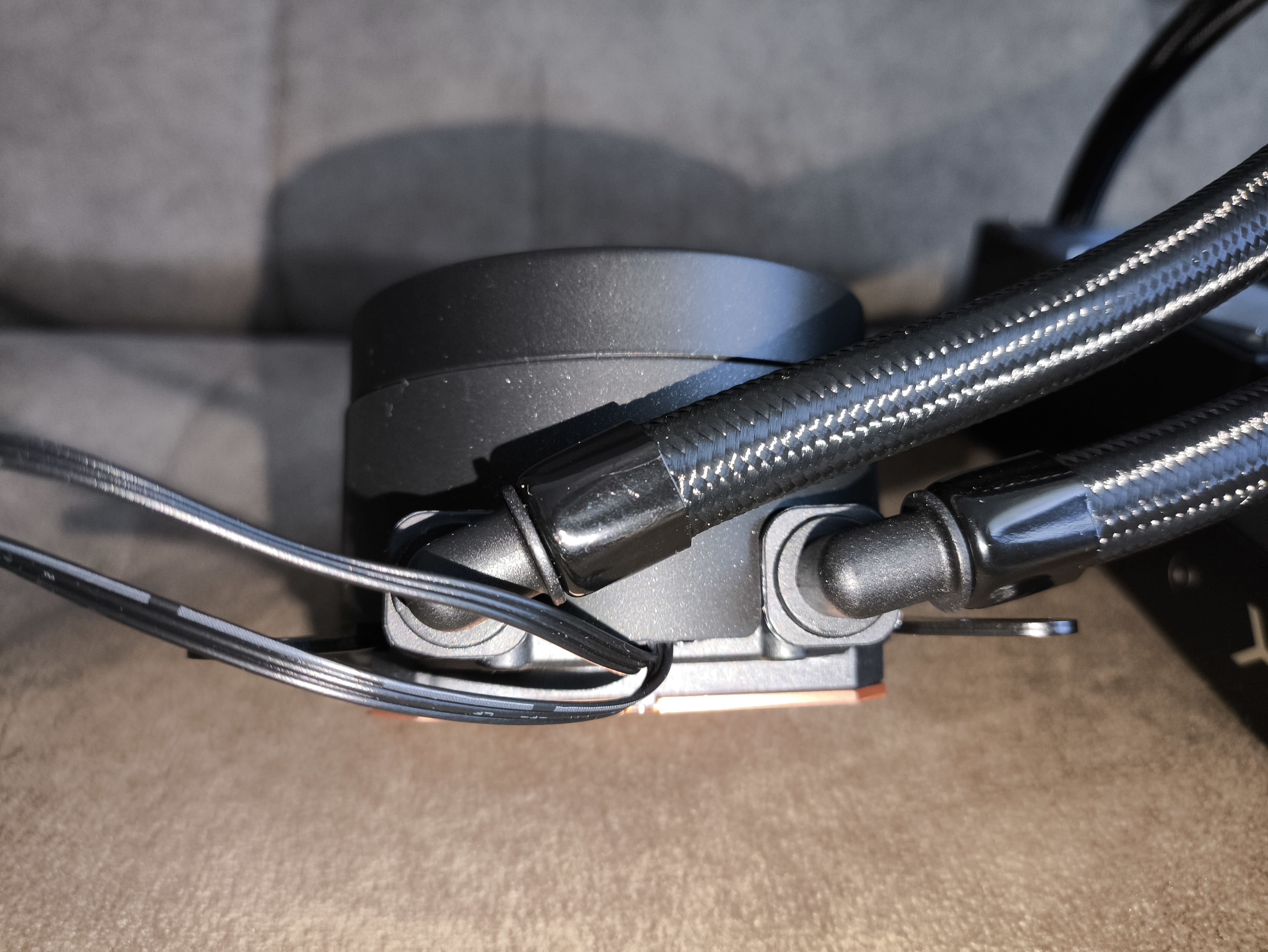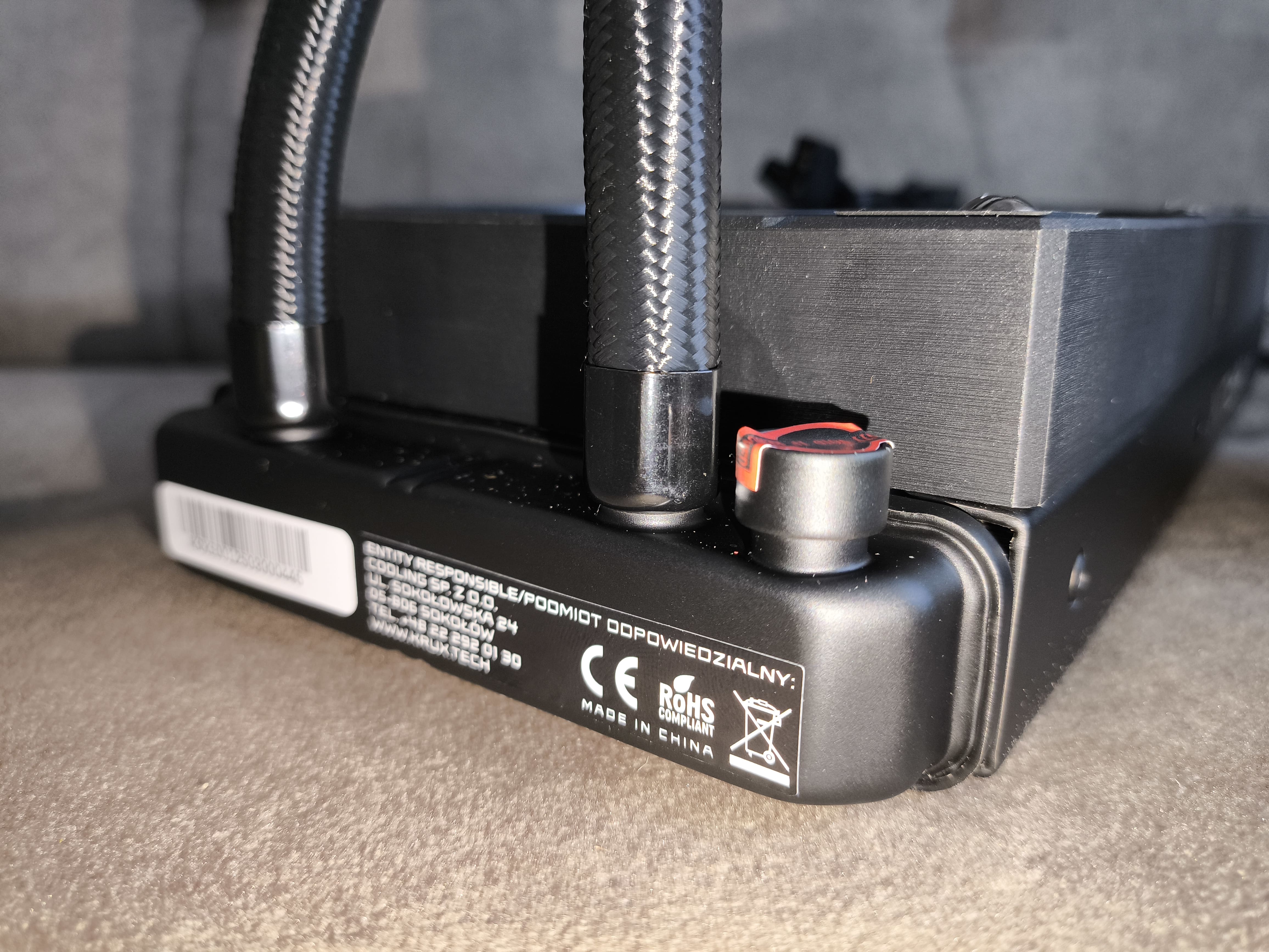 Do chłodnicy podłączono -milimetrowe węże w oplocie, zakończone ruchomymi złączkami przy bloku pompy, co zdecydowanie ułatwia proces montażu nawet w bardziej kompaktowych obudowach. Same rurki mają średnicę zewnętrzną 12.4 mm i wewnętrzną 6 mm, co wpisuje się w typowe standardy w segmencie AIO.