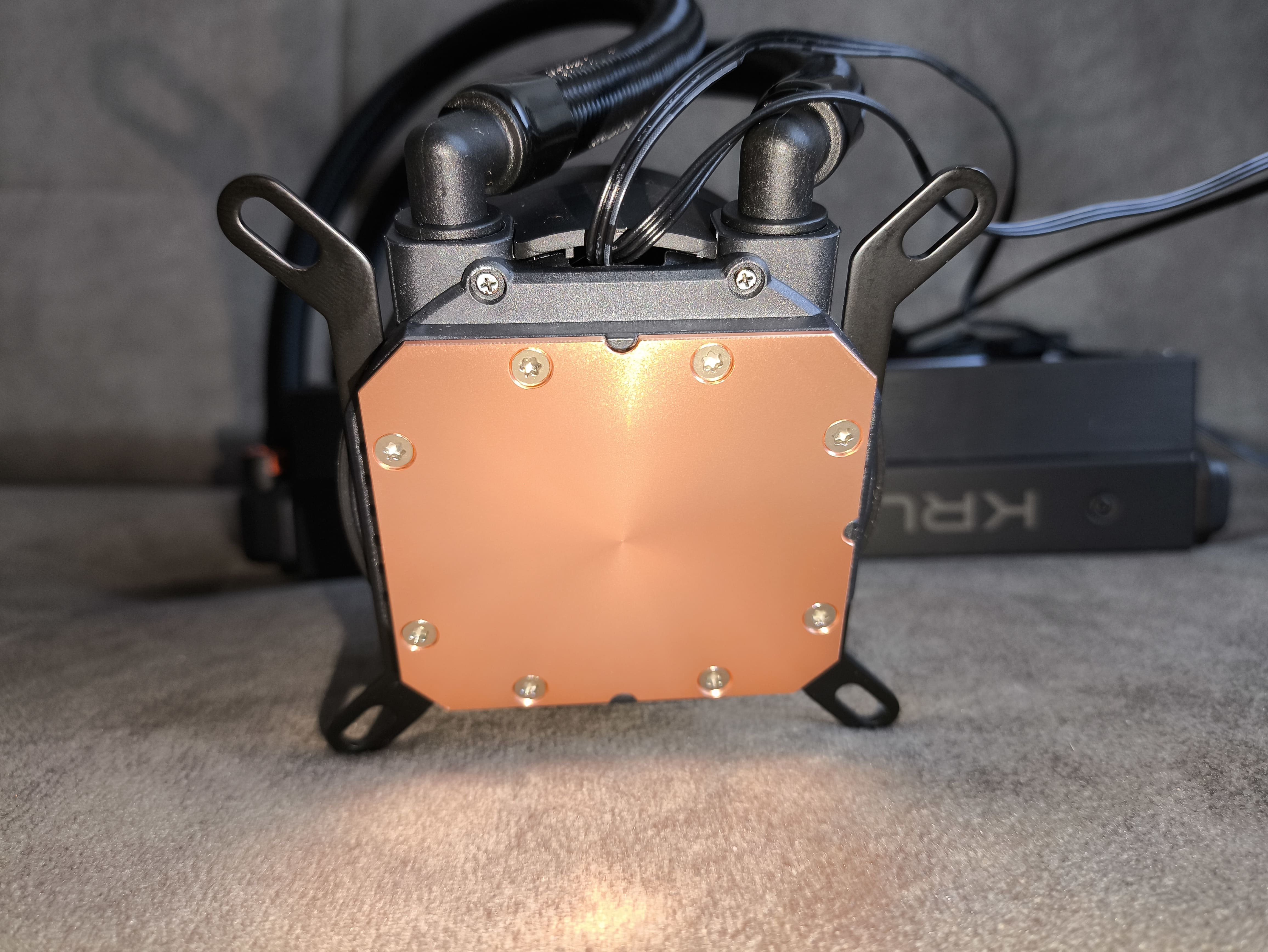 Na górze klasycznej z kształtu okrągłej blokompompki znajduje się logo Krux z efektem tzw. nieskończoności. Sama pompka pracuje z prędkością 2500 RPM i ma łożysko typu stalowego. Podstawka jest miedziana. Pompka według producenta ma możliwość sterowania obrotami, niemniej w moich testach wyszło trochę inaczej.