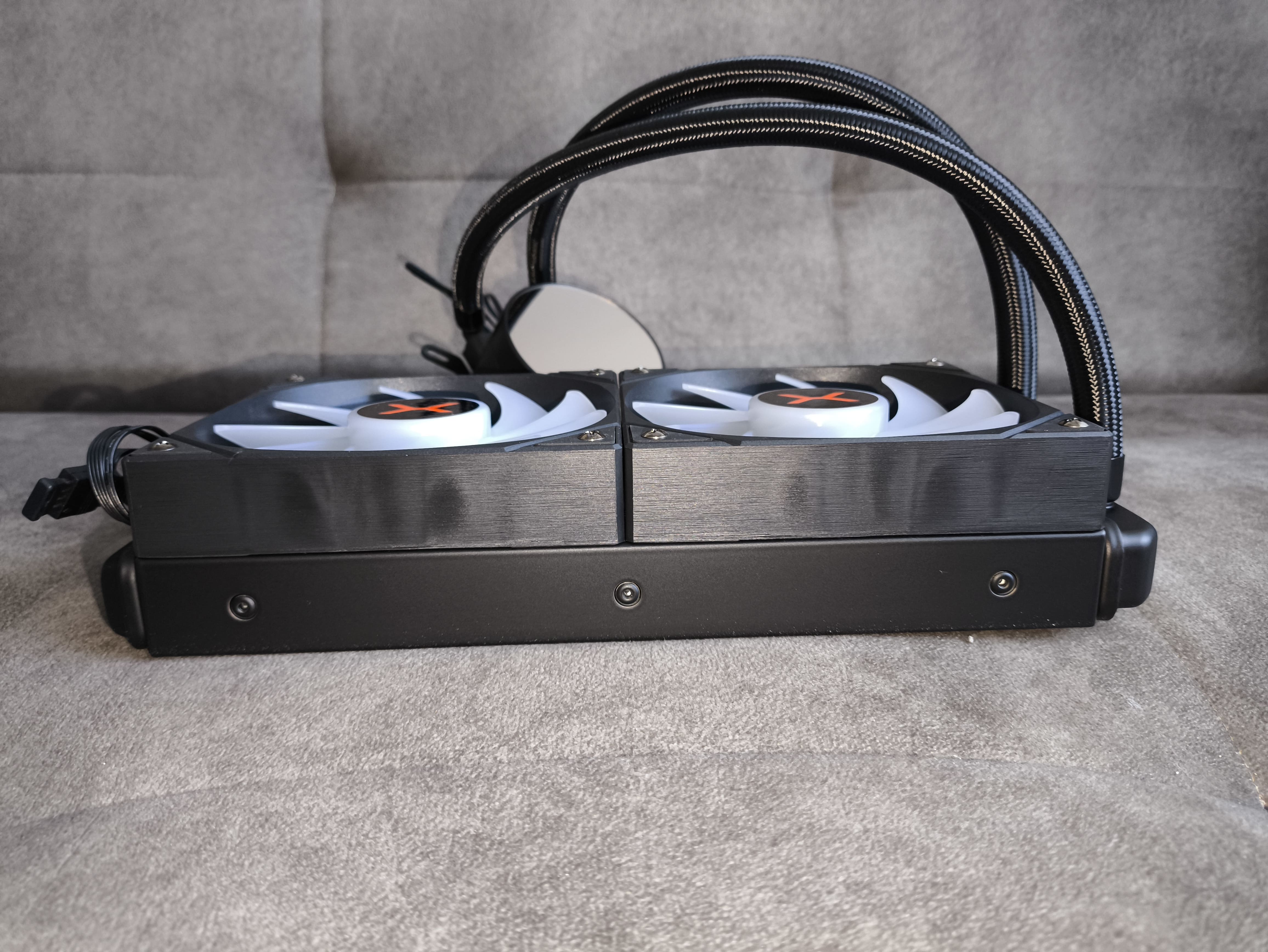 Radiator wyposażono fabrycznie w dwa 120-milimetrowe wentylatory ARGB z dziewięcioma, lekko wyprofilowanymi łopatkami, których zadaniem jest generowanie odpowiednio wysokiego ciśnienia statycznego – niezbędnego do przetłaczania powietrza przez gęsto użebrowaną chłodnicę. Ramki wentylatorów są czarne, a łopatki półprzezroczyste, dzięki czemu podświetlenie ARGB prezentuje się efektownie po uruchomieniu komputera.