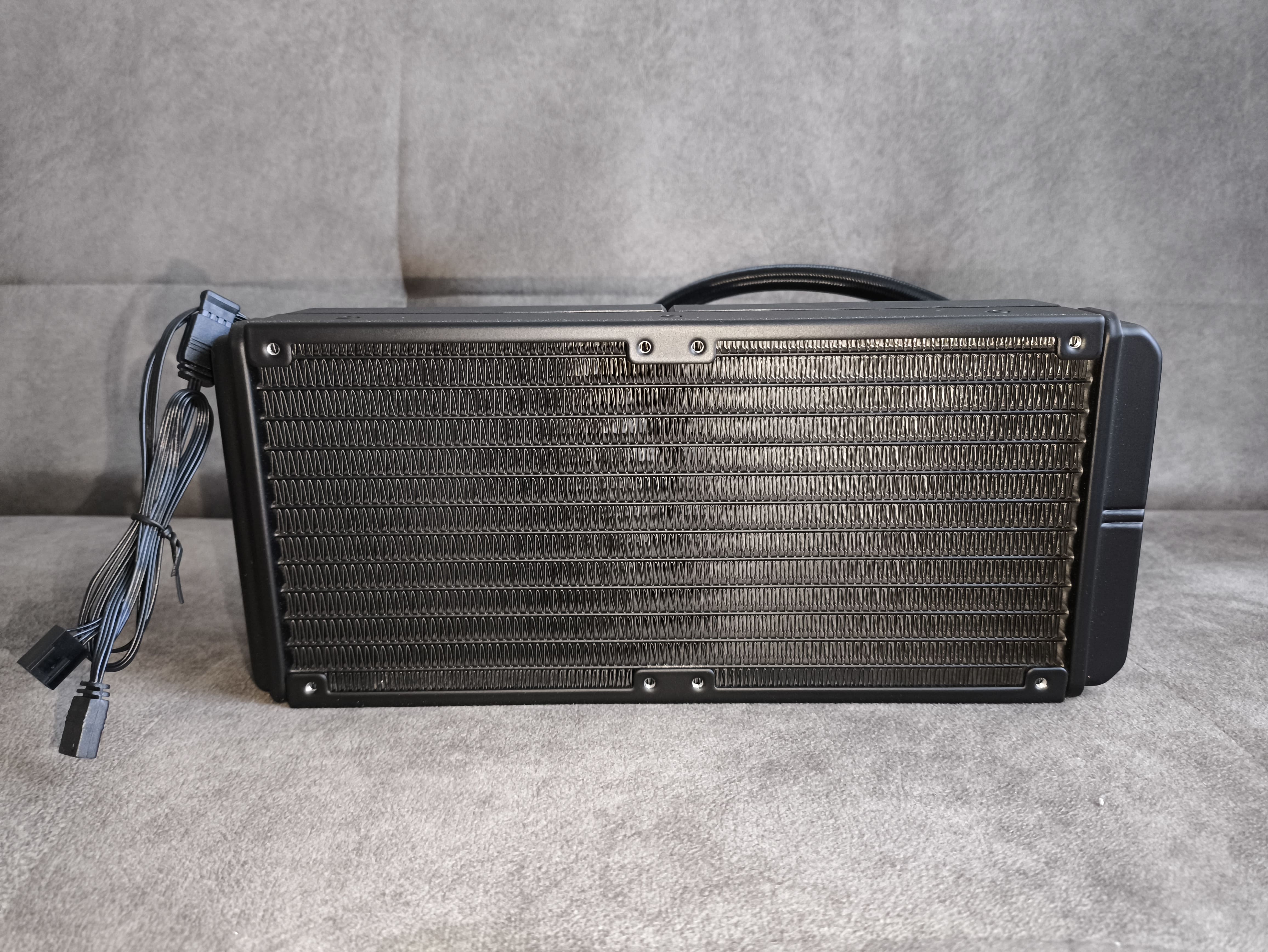 Chłodnica zastosowana w zestawie KRUX HydroX 240 to klasyczny, aluminiowy radiator o wymiarach 275 x 120 x 52 mm (łącznie z wentylatorami). Całość radiatora została wykończona w matowej czerni.
