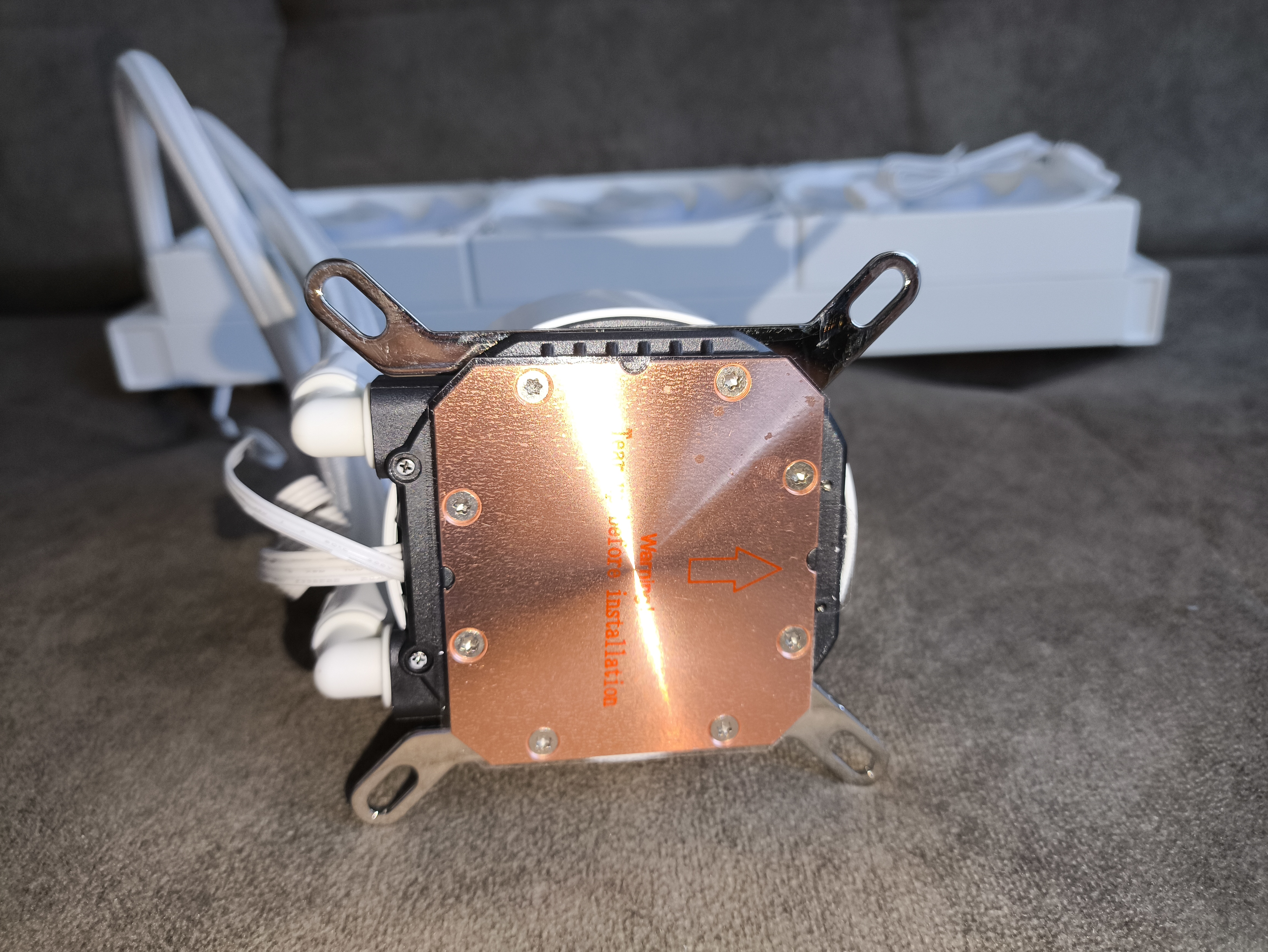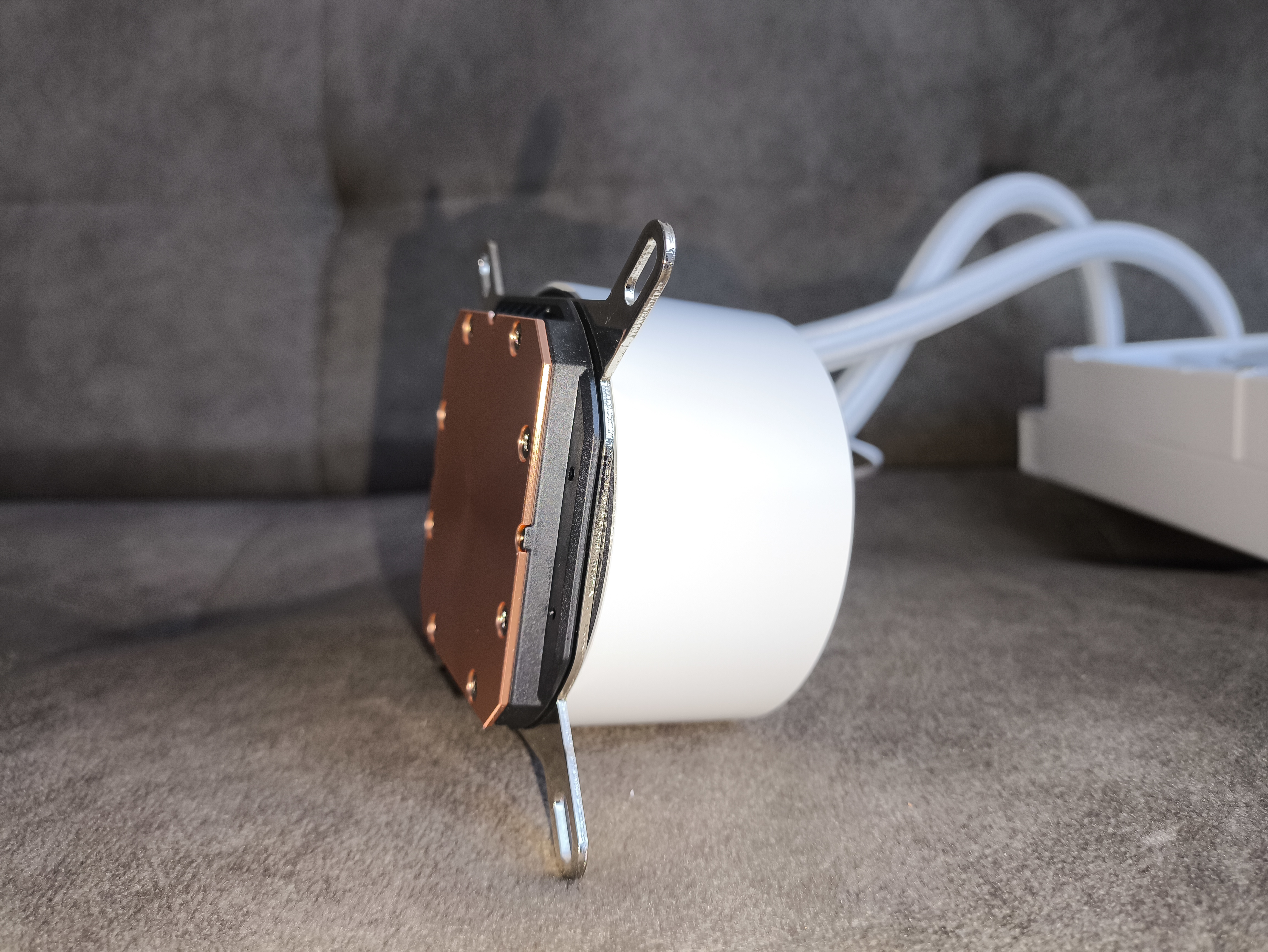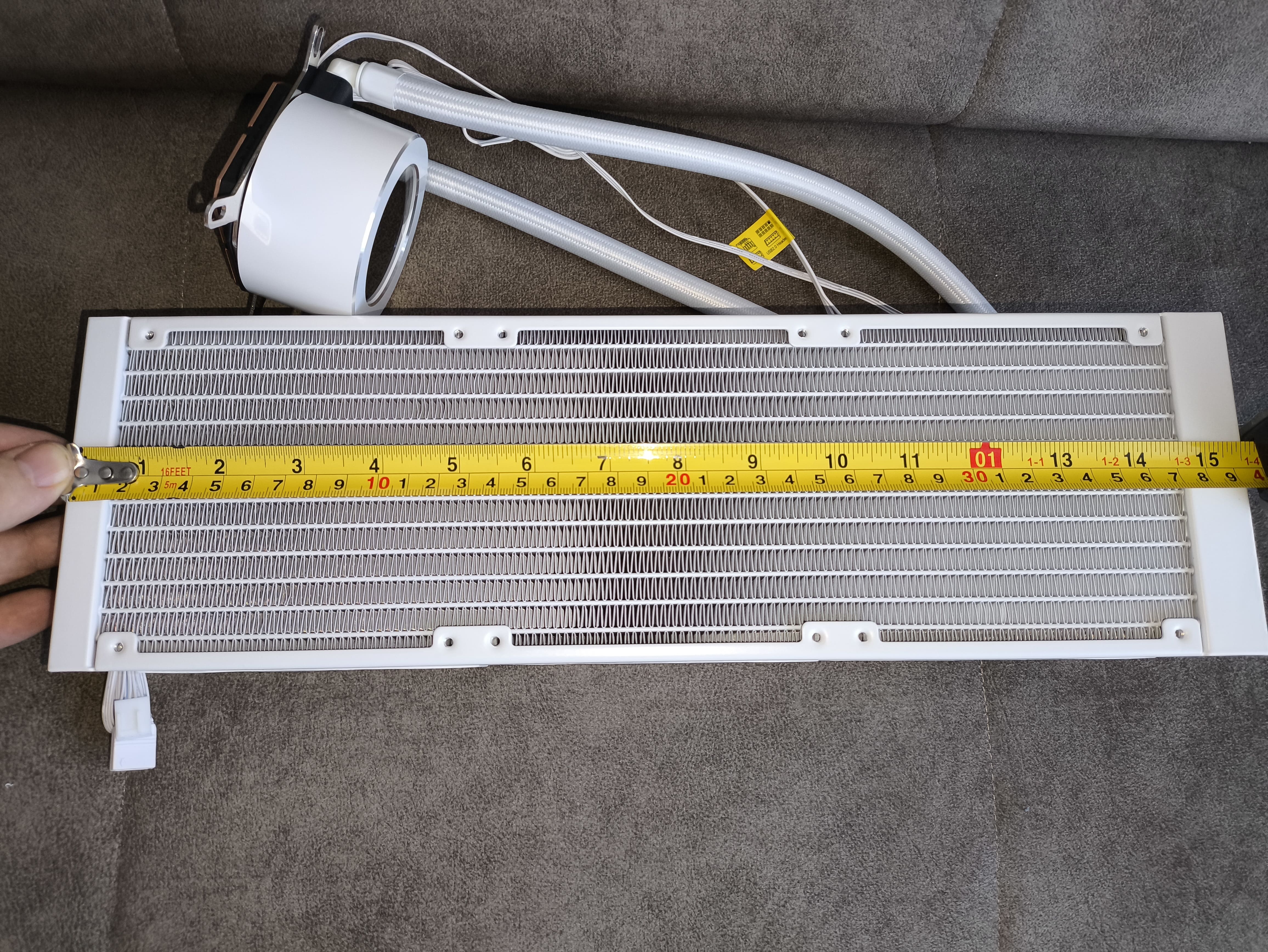 Tu też zachowano grubość rzędu 27 mm. Gęstość żeber również jest taka sama jak w modelu HydroX 240 mm – wynosi 21. Z kolei tu radiator wykończono na lekki połysk (takie mam wrażenie) i pomalowano go na biało a nie czarno. Tu też producent fabrycznie już przykręcił wentylatory do radiatora, za co należy się duży plus.