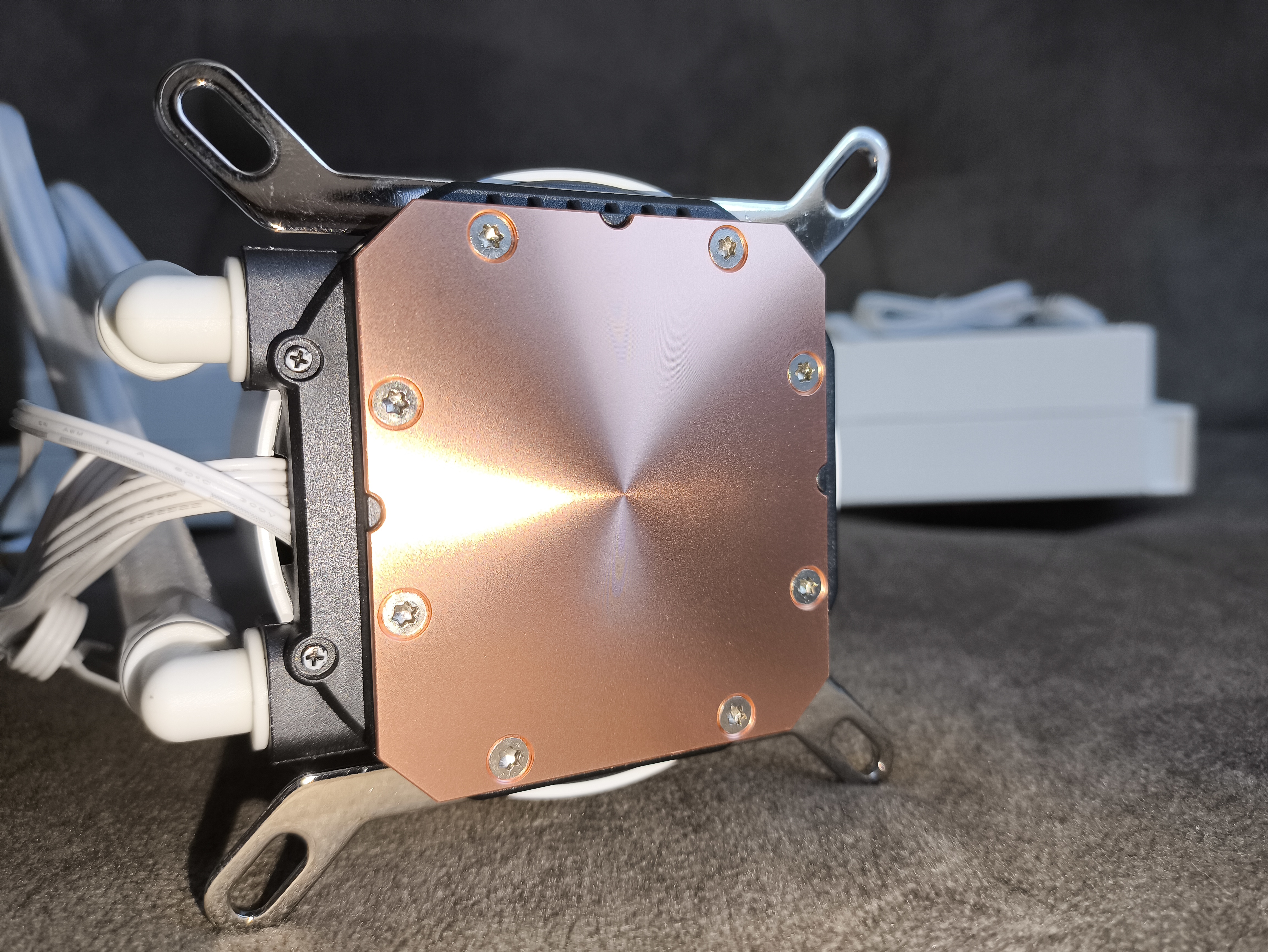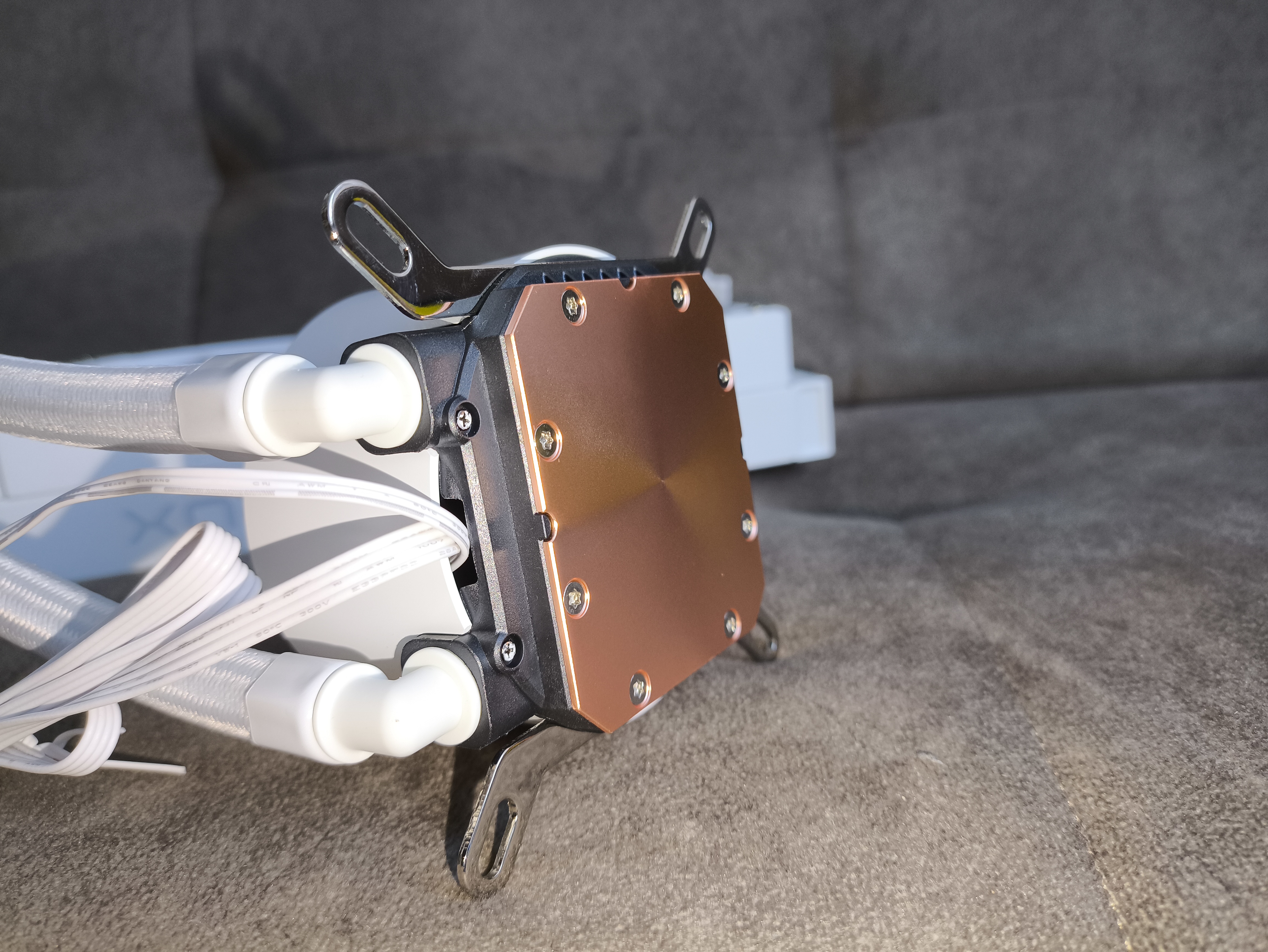 Sama blokopompka, tak samo jak w modelu HydroX 240, pracuje z prędkością 2500 RPM i wykorzystuje łożysko stalowe, a jej podstawa wykonana jest z miedzi. Tu też z pompki wychodzą dwa przewody – 4-pin PWM do zasilania oraz 3-pin ARGB do sterowania podświetleniem. Także i tu powierzchnia kontaktowa jest wystarczająco szeroka. W zasadzie jest taka sama w modelu HydroX 240.