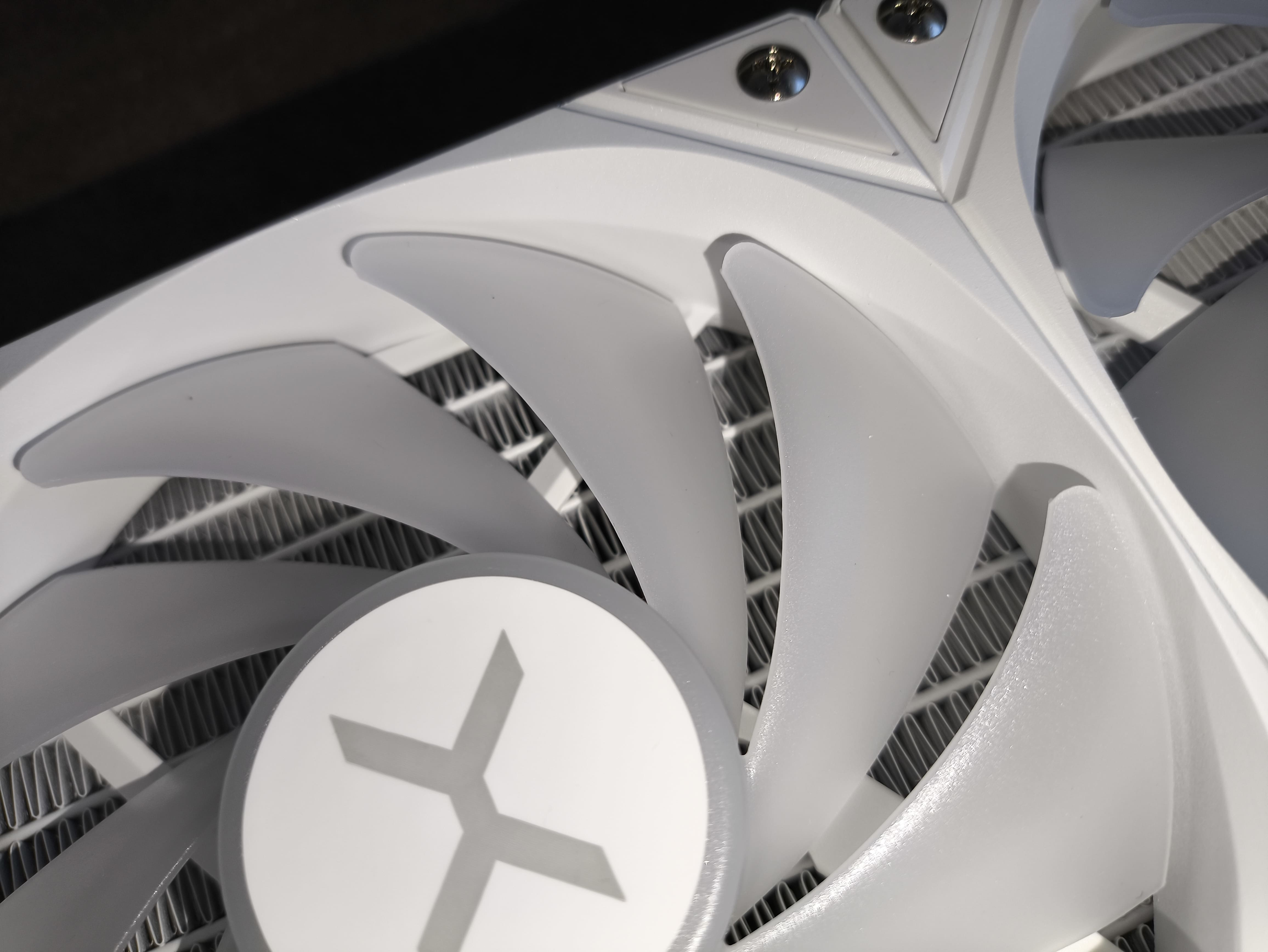 Radiatory chłodzęń wyposażono fabrycznie w dwa / trzy 120-milimetrowe wentylatory ARGB z dziewięcioma, lekko wyprofilowanymi łopatkami, których zadaniem jest generowanie odpowiednio wysokiego ciśnienia statycznego – niezbędnego do dobrego poziomu przetłaczania powietrza przez chłodnicę.