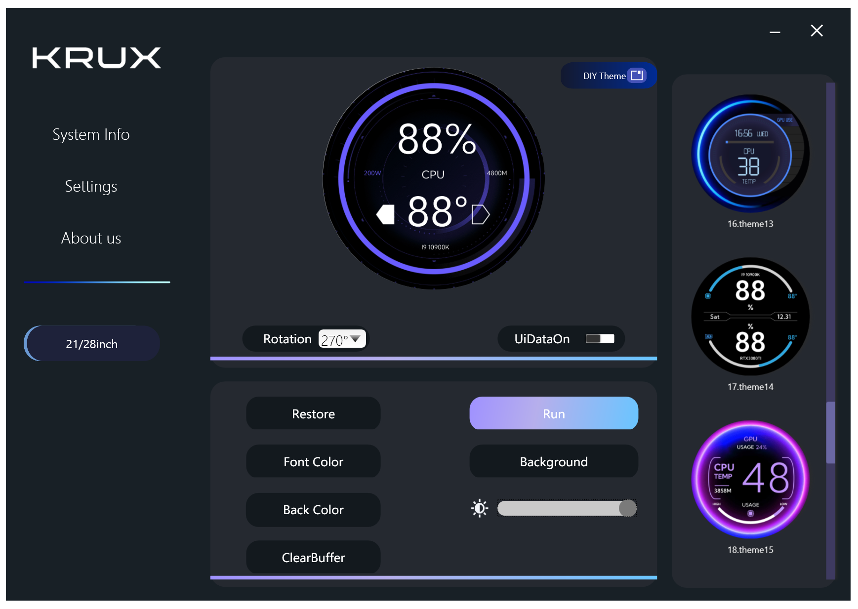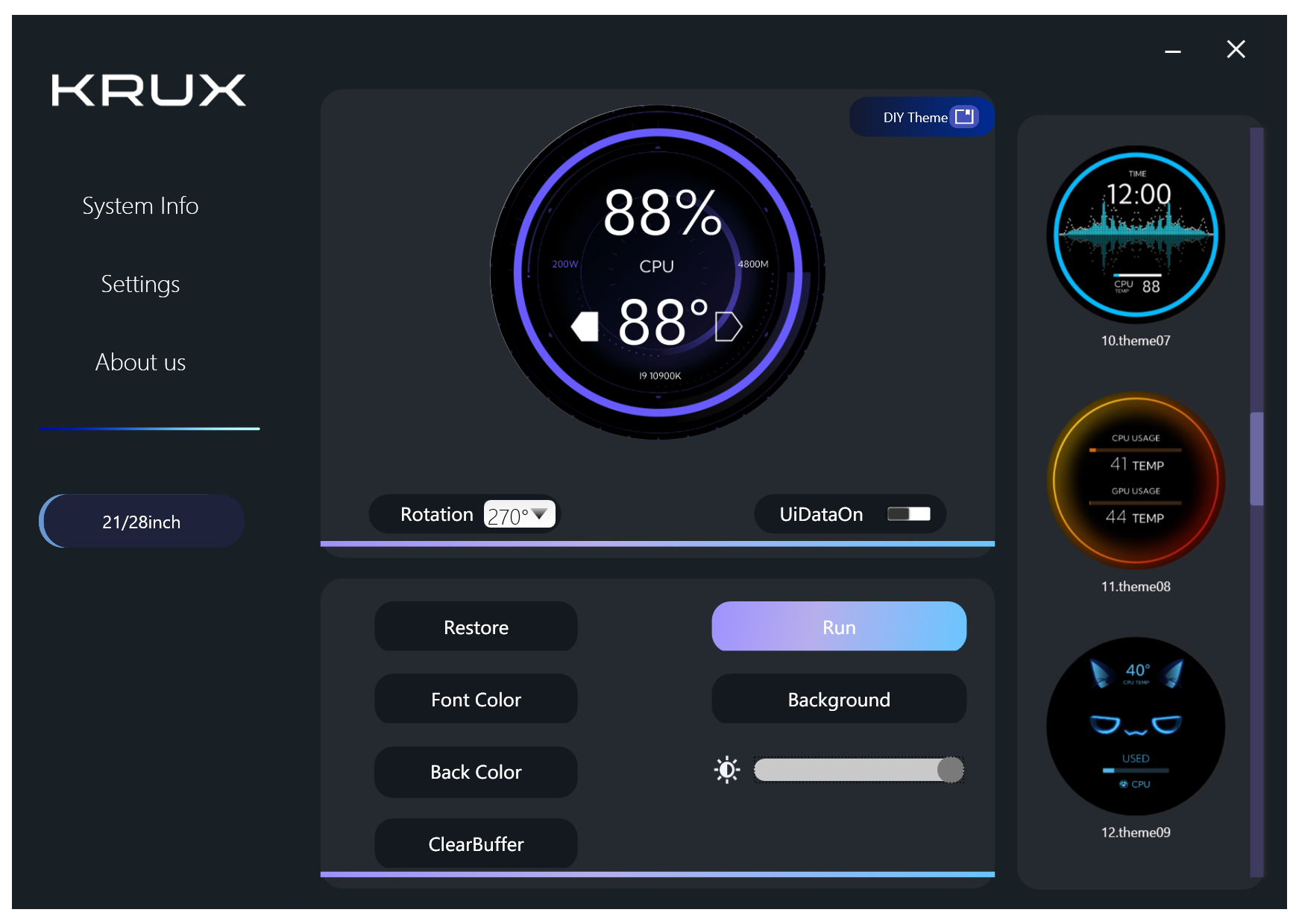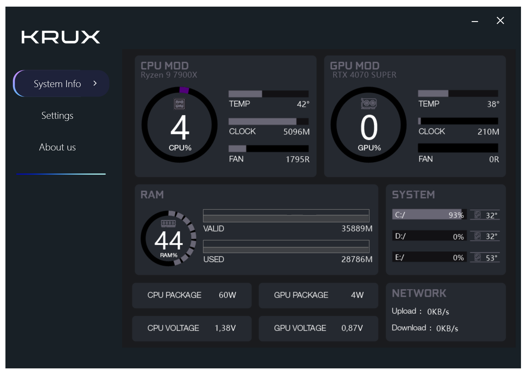 Co dokładnie oferuje oprogramowanie? Główny ekran prezentuje informacje systemowe – temperaturę, pobór energii, taktowanie na żywo, obroty wentylatorów CPU i GPU oraz dane dotyczące pamięci RAM.