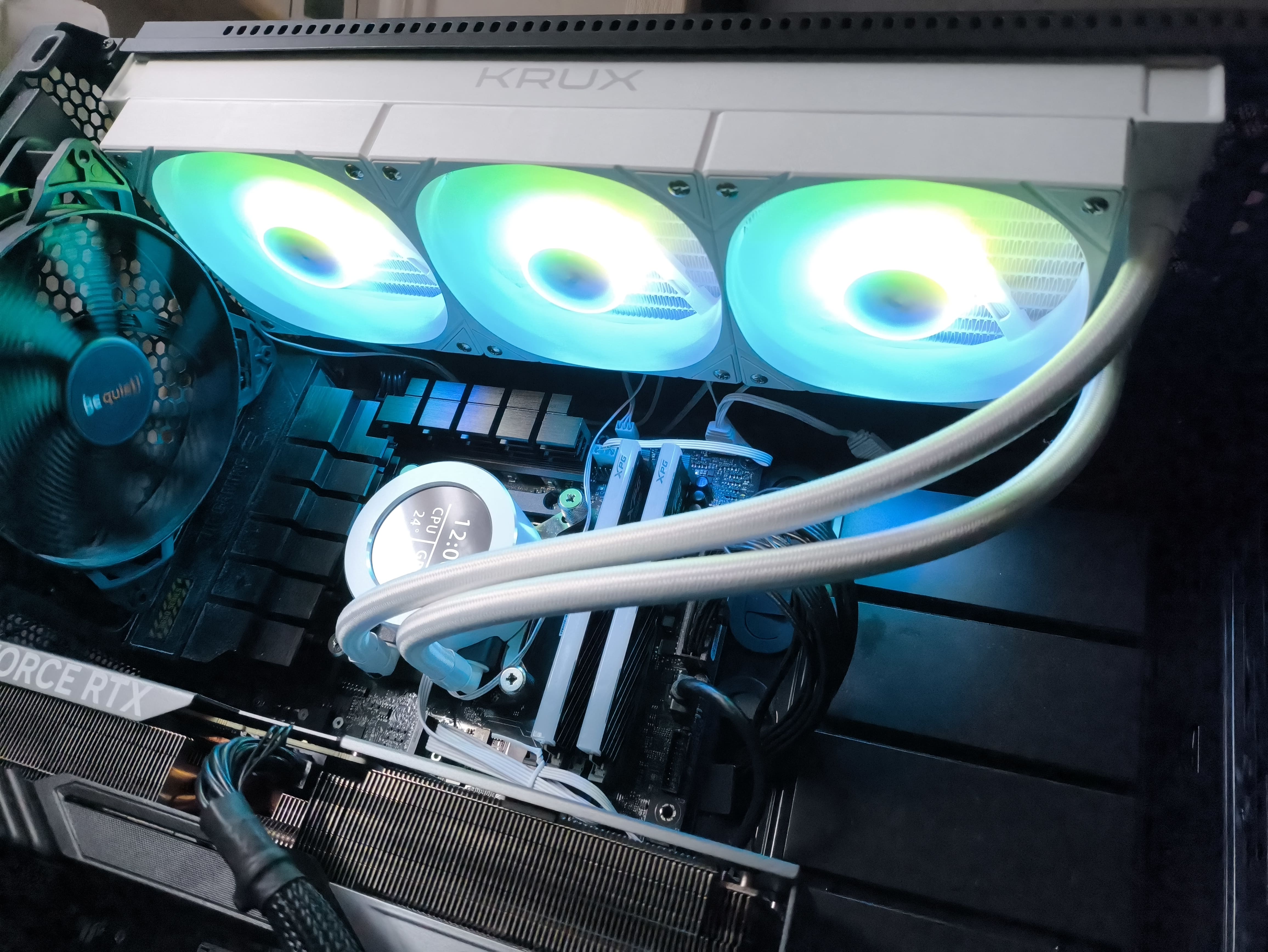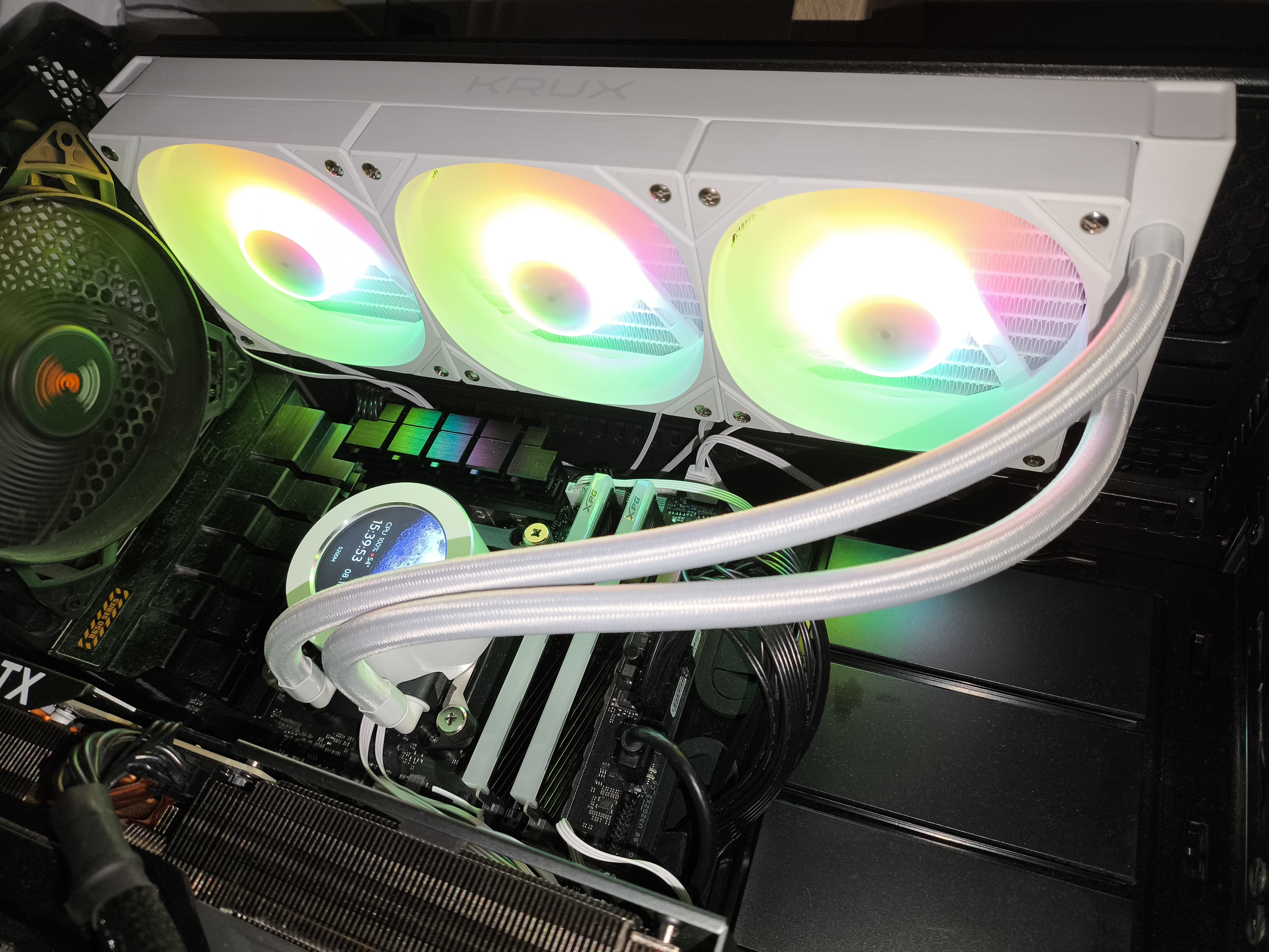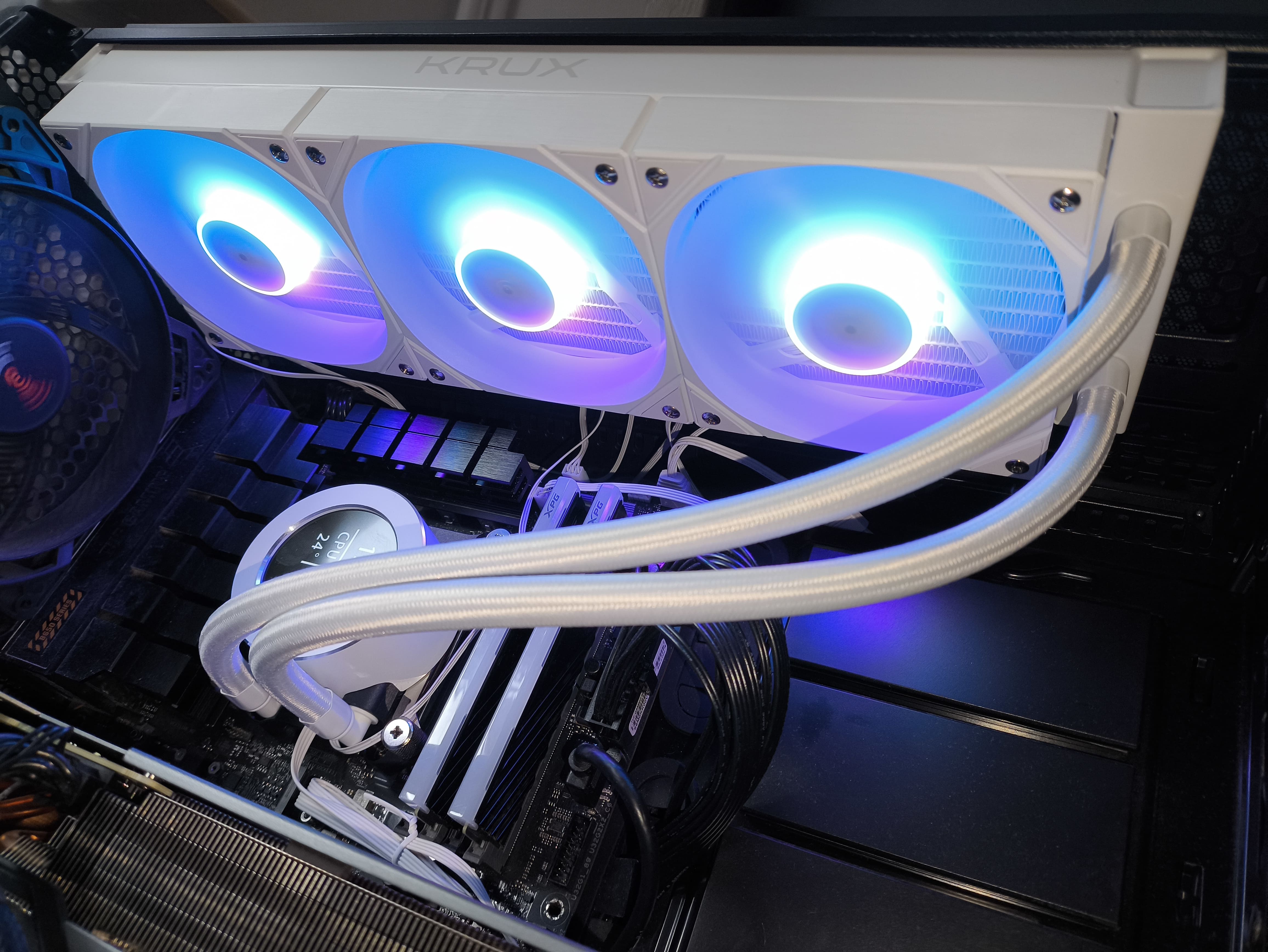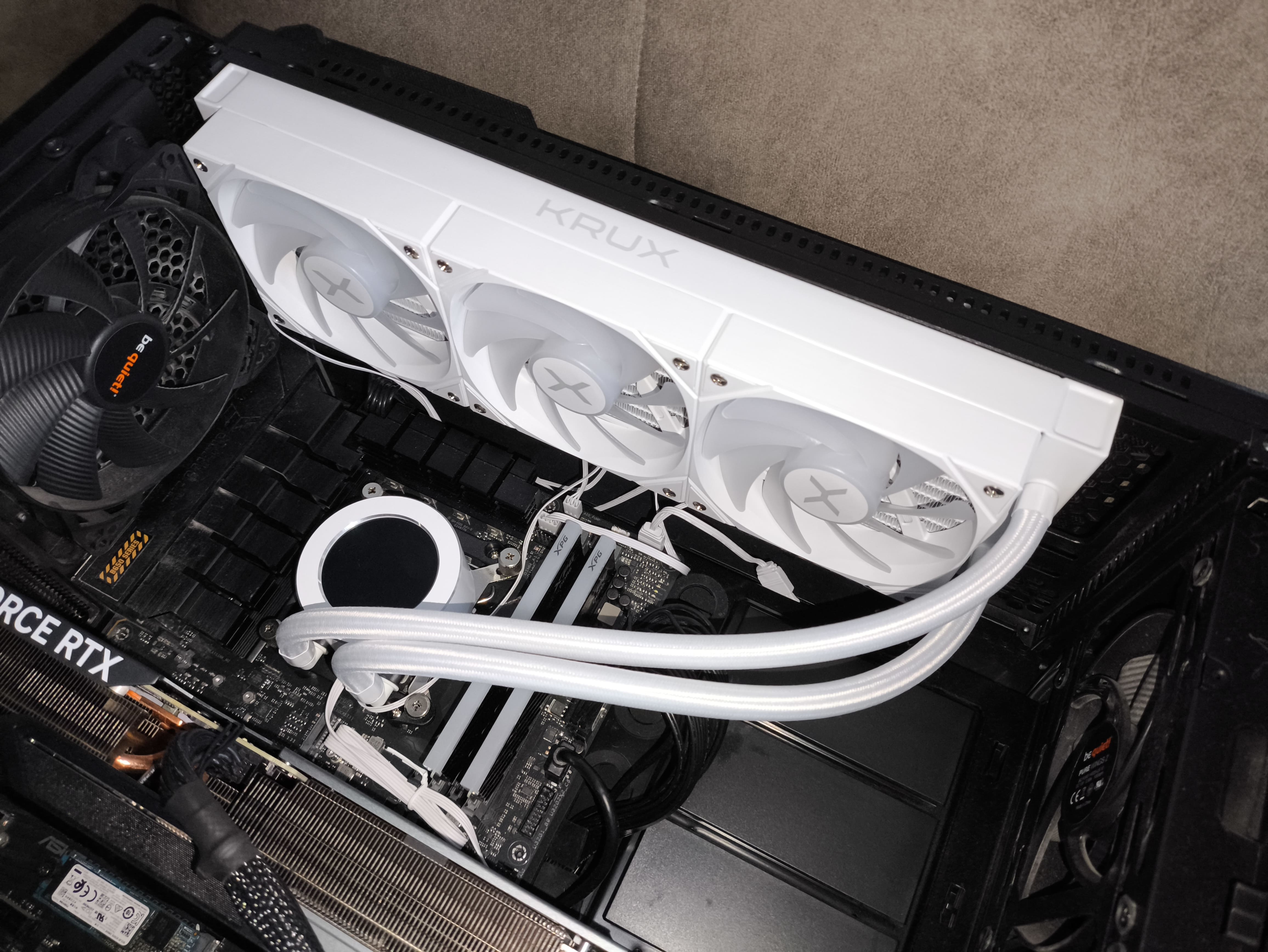 Po nałożeniu pasty wystarczy umieścić blok wodny na procesorze i przymocować go za pomocą czterech śrubek z radełkowaniem. Całość przebiega bez najmniejszych trudności – elementy dobrze do siebie pasują. Sumarycznie montaż mogę określić jako jeden z bardziej komfortowych spośród ostatnio testowanych zestawów AIO.