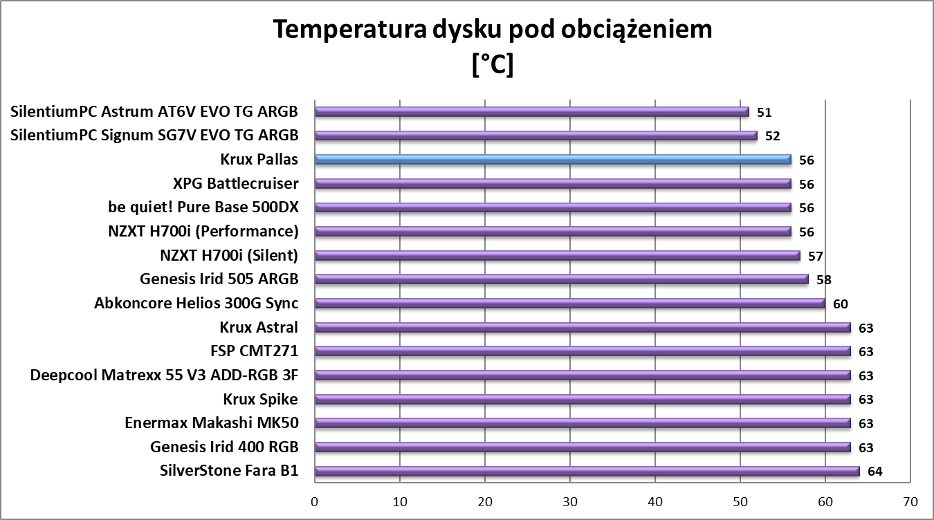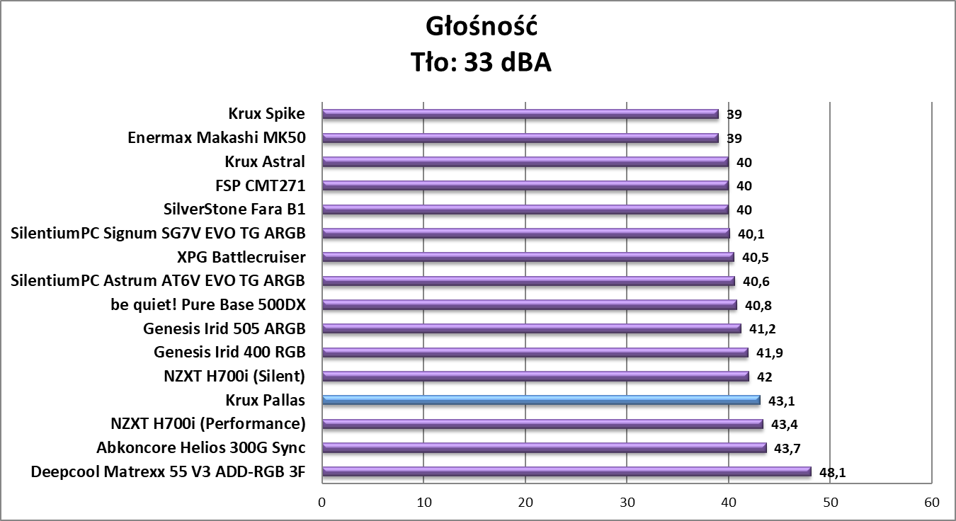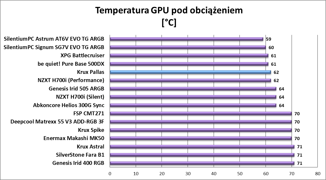 Krux Pallas wypadł fantastycznie w testach. Przedni panel mesh + cztery wentylatory zapewniają świetne temperatury podzespołów. Na każdym z wykresów obudowa jest w czołówce rankingu. Jedynie głośność jest trochę większa – cztery wentylatory 1200 RPM muszą być słyszalne. Jednakże pod tym względem źle nie jest. Po prostu nie ma ciszy, ale też obudowa nie chodzi jak odkurzacz.