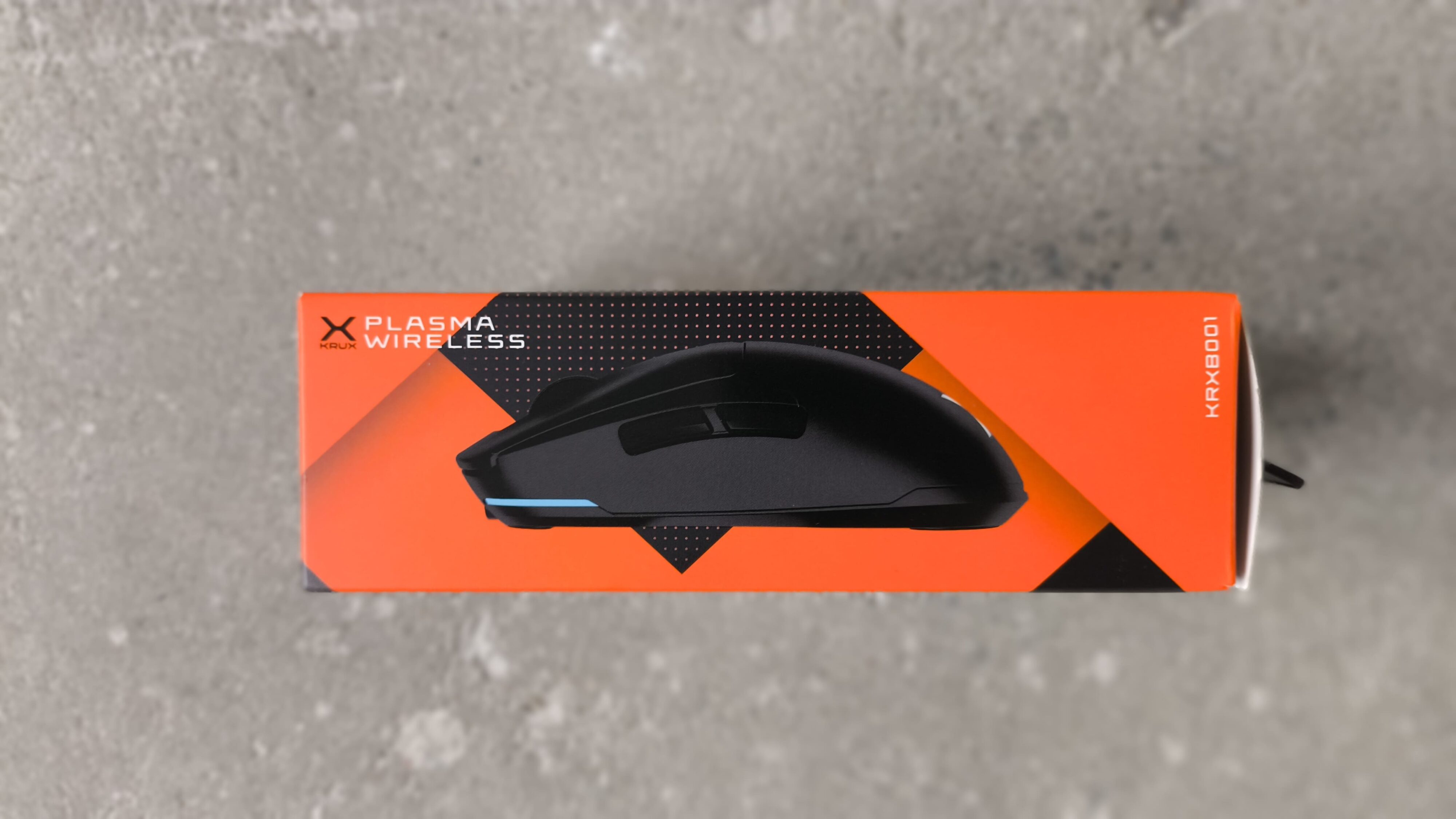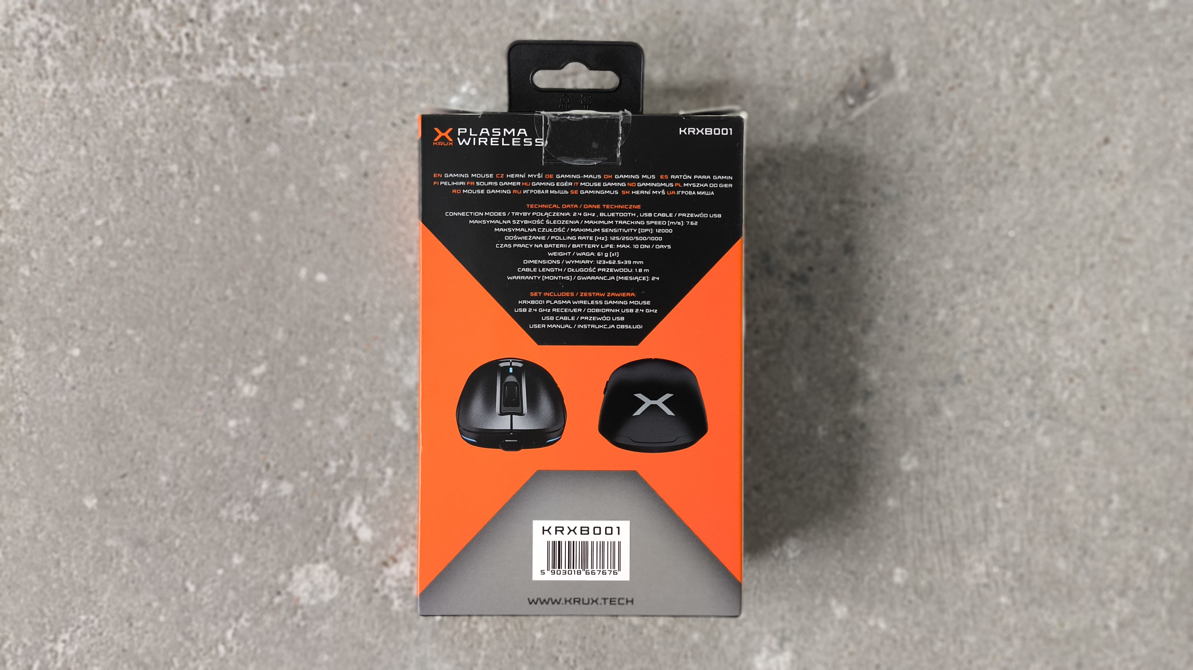 Mysz Krux Plasma Wireless dociera do użytkownika w stosunkowo niewielkim, cienkim kartonowym pudełku utrzymanym w charakterystycznej dla marki kolorystyce – dominują odcienie czerni, pomarańczu, bieli oraz szarości.