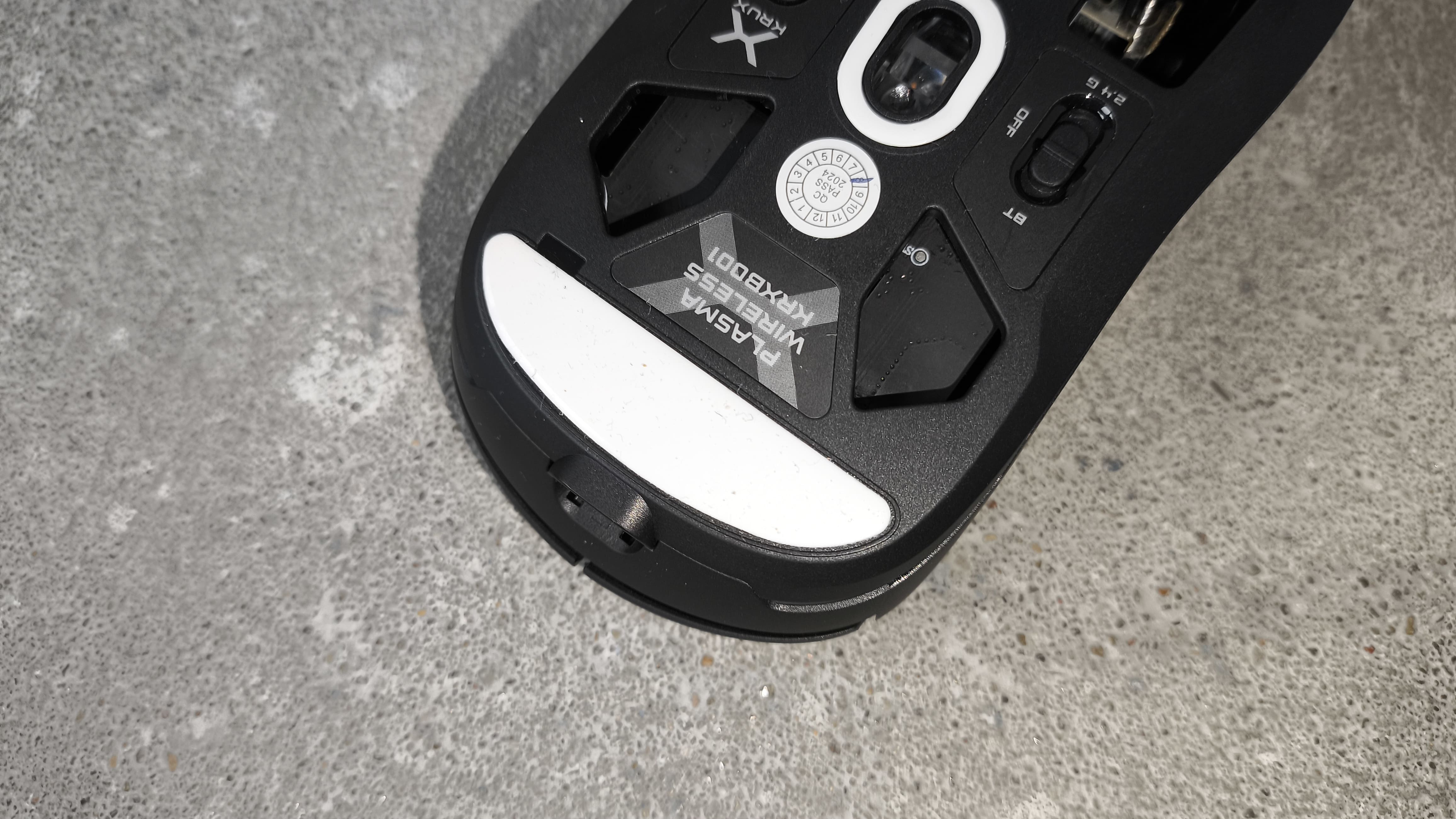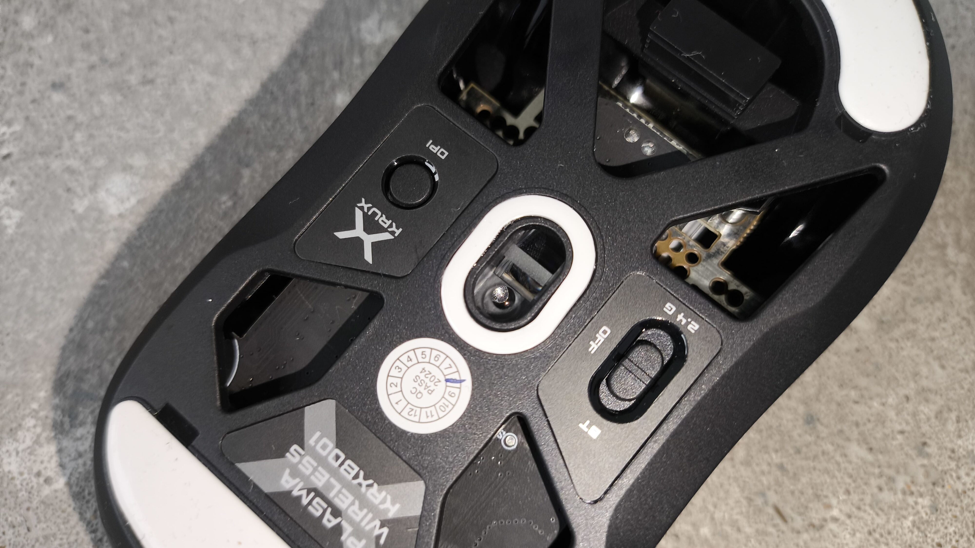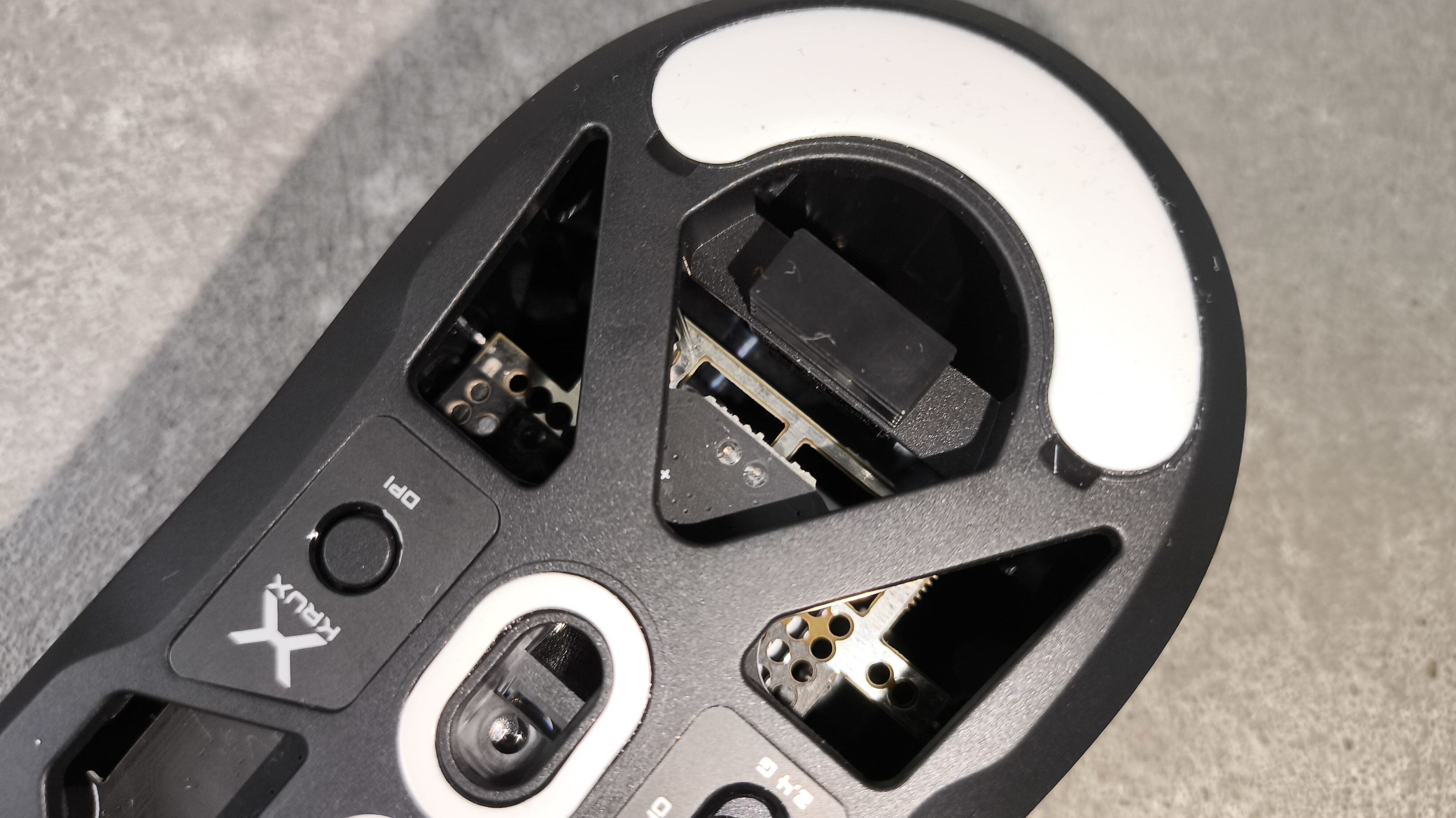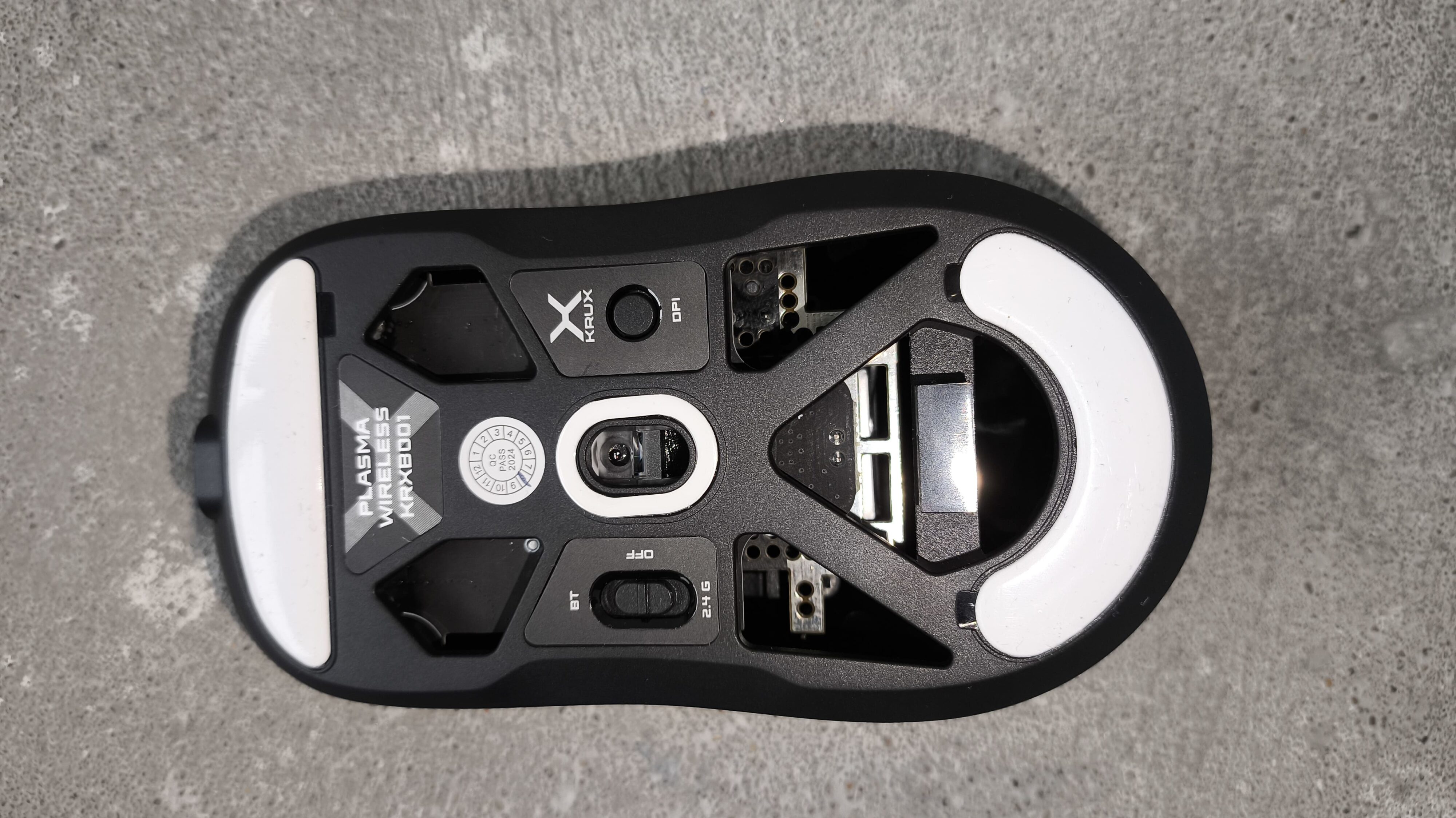 Główne łopatki przycisków to osobny element konstrukcyjny, który teoretycznie powinien redukować luzy, jednak w praktyce przy Krux Plasma Wireless luzy są zauważalnie większe niż u konkurencji. Warto jednak podkreślić, że same przełączniki główne mają wyraźny, cięższy klik – przypominający przełączniki Kailh GM 4.0 – co sprawia, że klik jest dobrze wyczuwalny i nieprzypadkowy.