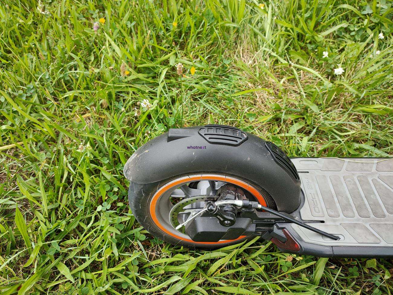 Przyspieszenie mogło by być trochę lepsze – czasami są problemy z szybkim osiągnięciem maksymalnej prędkości w szczególności pod wiatr czy przy mniejszej pojemności baterii. Maksymalna prędkość jaką uzyskałem to 29 km/h na prostej drodze (nie z górki). Będzie to wartość poza maksymalną dopuszczaną przez prawo, ale daje to dużą radość z jazdy. Plusem jest też hamulec przedni – e-hulajnoga praktycznie staje w miejscu. Podczas jazdy chyba tylko raz skorzystałem z tylnego, nożnego hamulca – jest on tak naprawdę zbędny.
