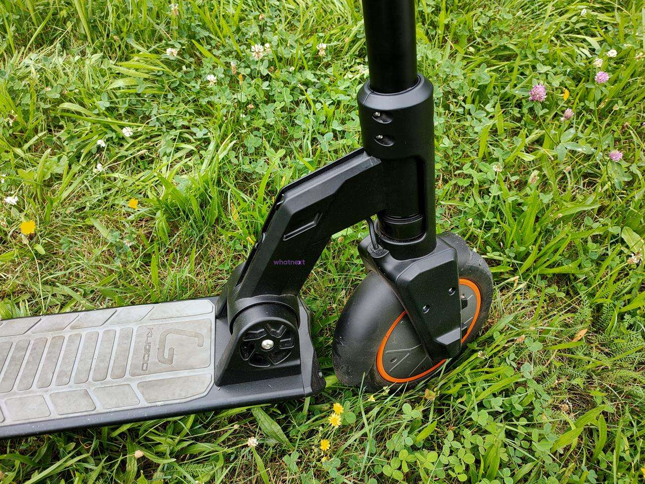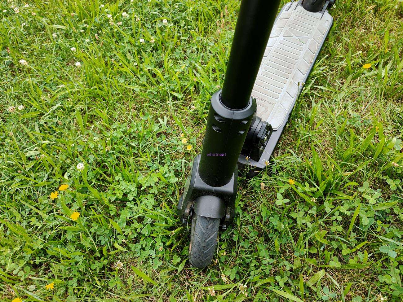 Kugoo M2 Pro ma dwa 8,5 calowe koła. Są one pompowane, co ma swoje plusy i minusy. Plusem jest z pewnością wpływ na jakość jazdy, a minusem możliwość pęknięcia podczas jazdy. E-hulajnoga ma polimerową ramę ze stopów lotniczych, dzięki czemu wytrzyma ona obciążenie do 120 kg. Z przodu znajduje się też całkiem spory amortyzator, który na pewno pozytywnie wpłynie na jakość jazdy.