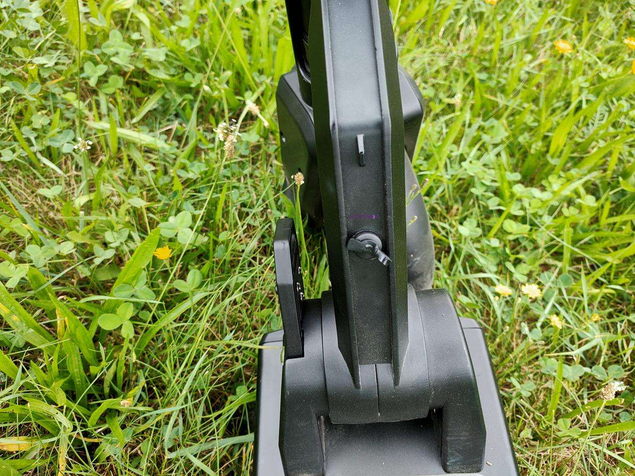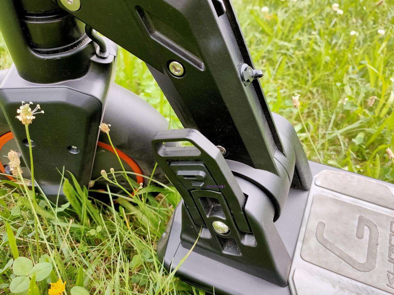 Po lewej stronie umieszczony został dzwonek i hamulec. Kugoo M2 Pro oferuje przedni elektroniczny hamulec tarczowy oraz fizyczny tylny (czyli naciskany nogą). Po prawej stronie jest manetka z gazem (nie ma jednak tempomatu – podobno można w aplikacji włączyć, ale tak jak pisałem – mi ona nie działa). Na dole możecie zobaczyć mechanizm składania – jest on naprawdę banalny w obsłudze. Wystarczy odgiąć ten mechanizm, złożyć e-hulajnogę i go z powrotem zabezpieczyć. Jest to naprawdę proste i bezproblemowe. Gorzej jest z wagą – 15,6 kg do noszenia może zmęczyć.