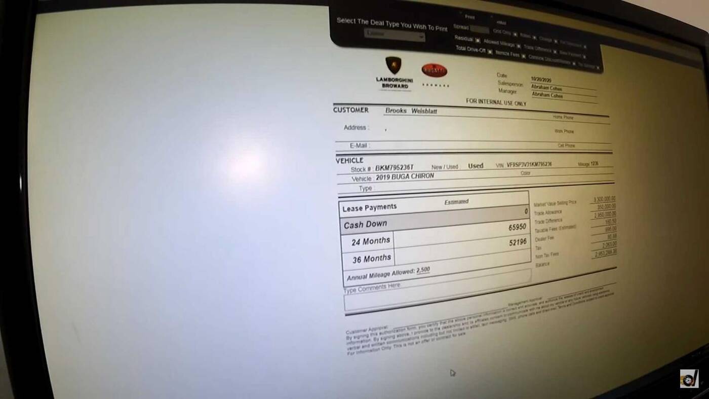 Ten dokładnie używany biały Bugatti Chiron Sport jest do kupienia za 3,3 miliona dolarów, a jego wyposażenie obejmuje m.in. kosztujący 62000 dolców dach Sky View. Po uiszczeniu pierwszej wpłaty, dealer zaoferował naszemu bohaterowi dwie opcje leasingu, które obejmowały okres dwuletni i trzyletni.