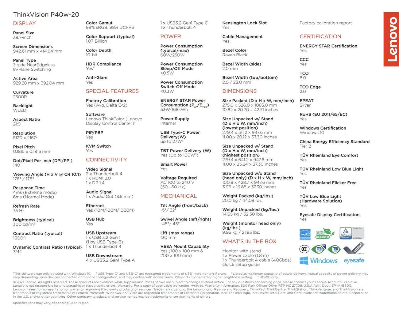 Lenovo ThinkVision P40w to pierwszy na świecie monitor Thunderbolt 4 przeznaczony dla profesjonalistów obsługujący Intel Active Management.