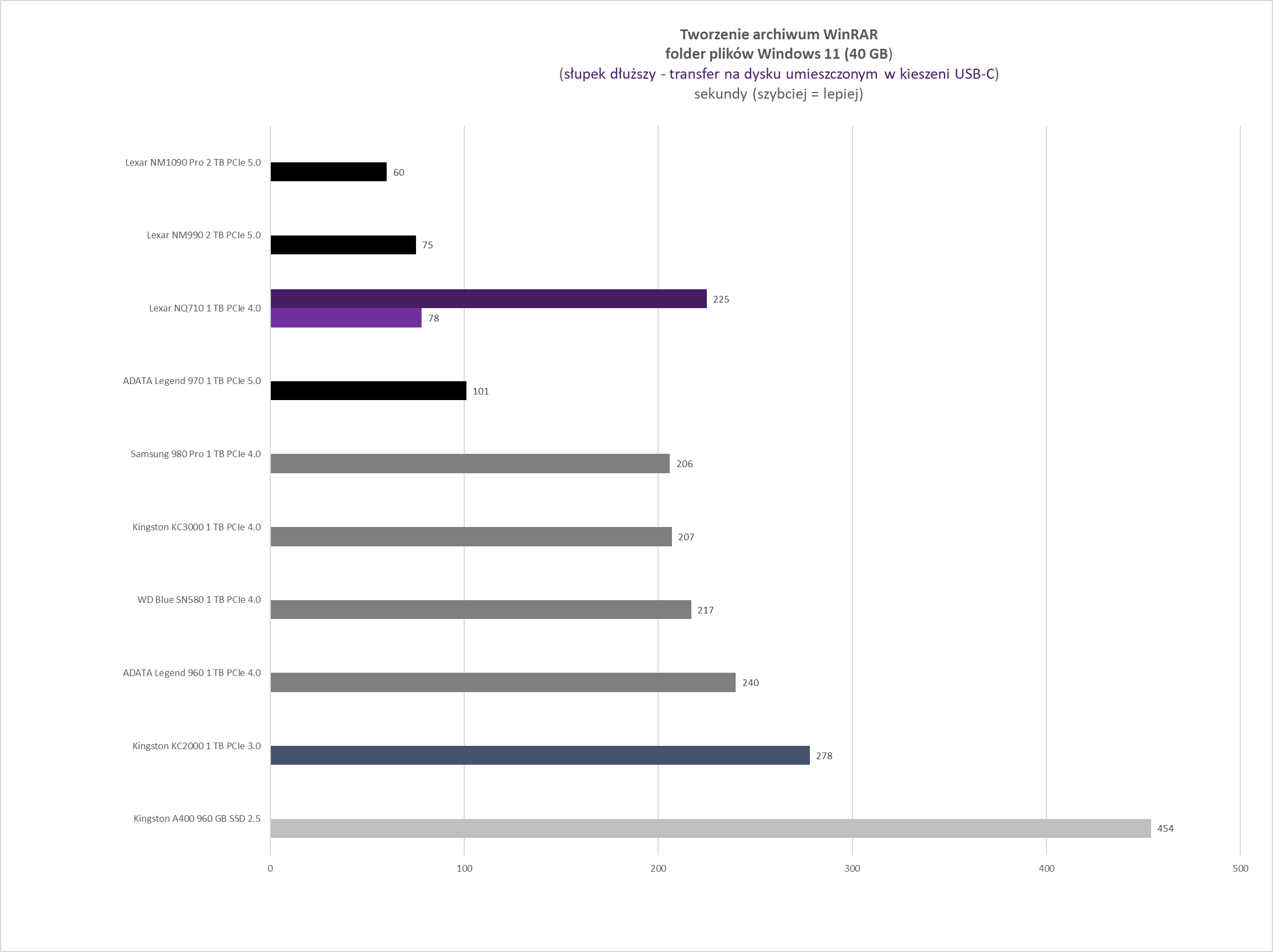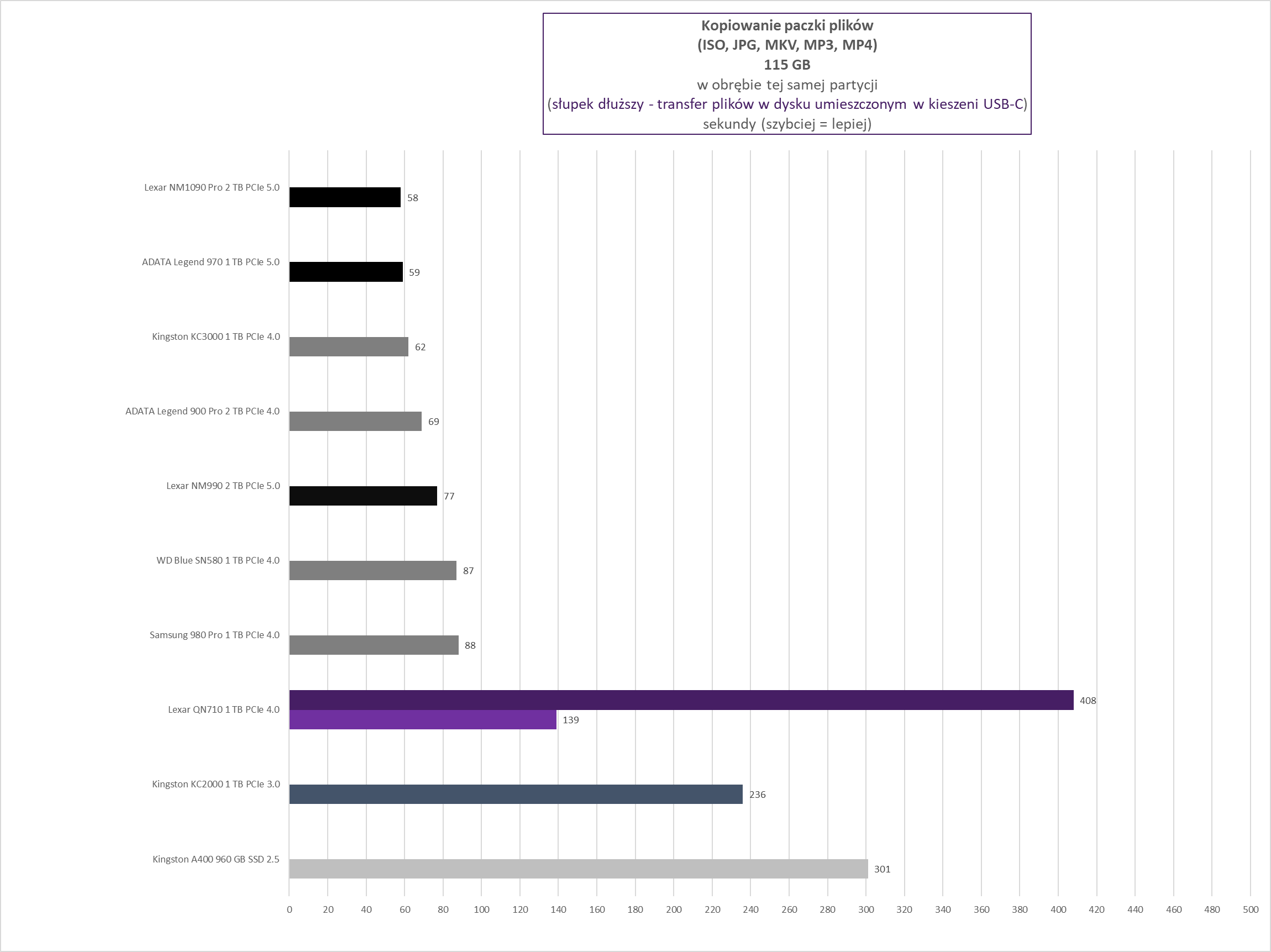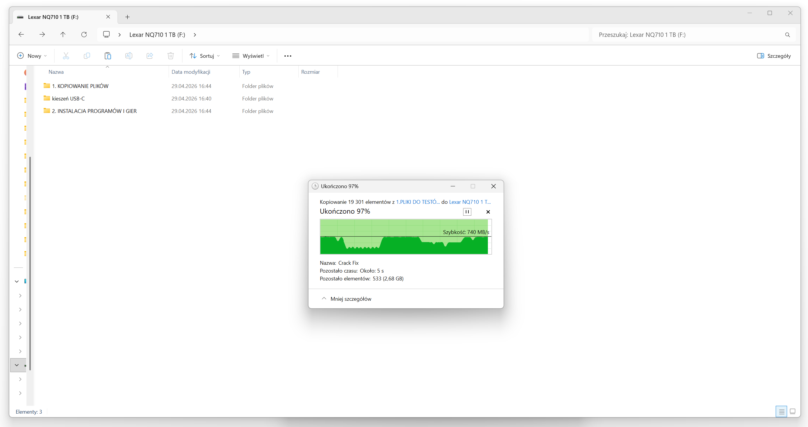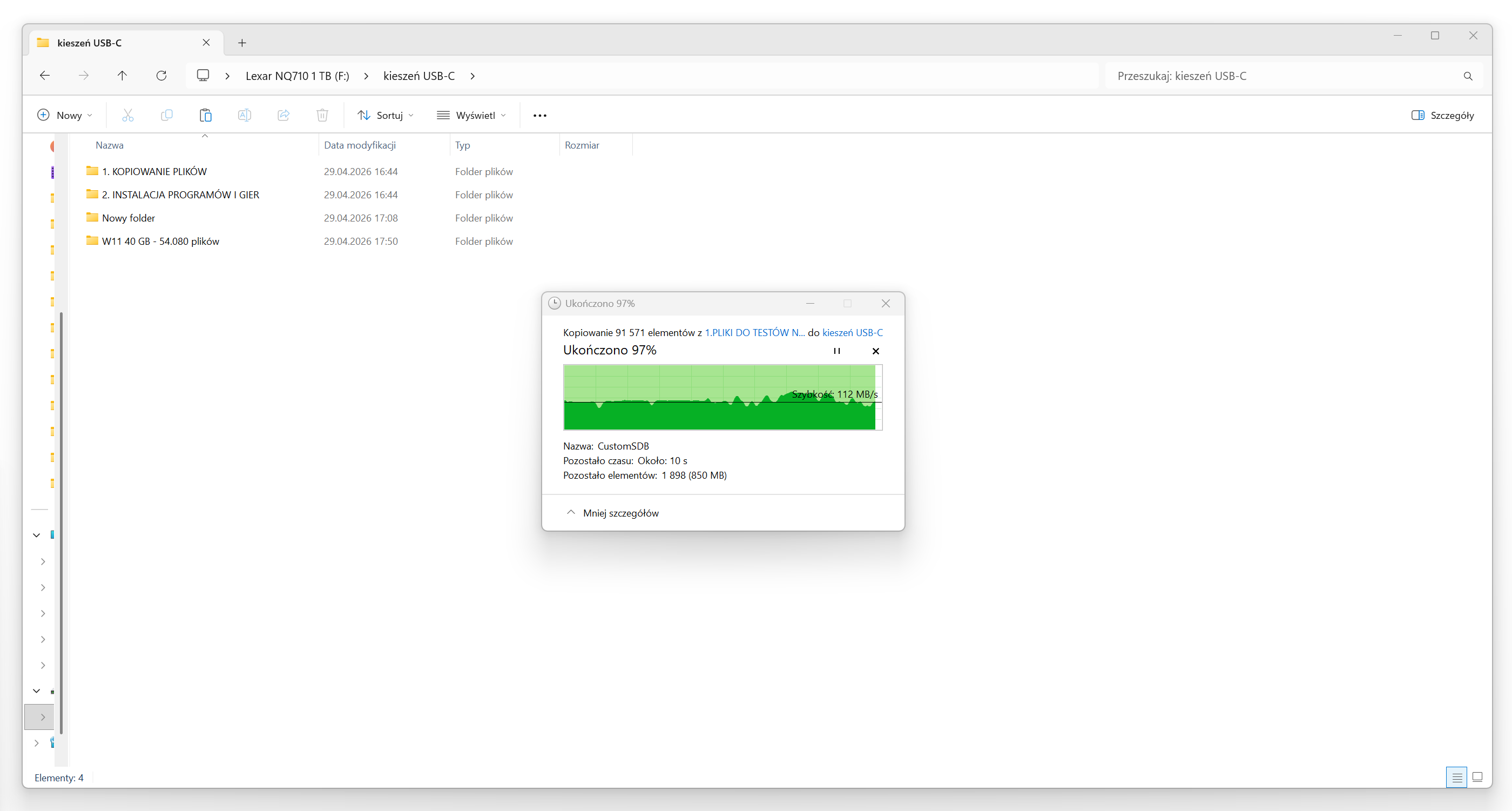 Warto jednak zaznaczyć, że po umieszczeniu dysku w kieszeni USB-C jego wydajność zostaje ograniczona do około 1000 MB/s zarówno w odczycie, jak i zapisie. Mimo to są to wciąż w pełni wystarczające wartości do zastosowań praktycznych – bez problemu można wykorzystywać taki zestaw jako przenośną bibliotekę gier czy programów.