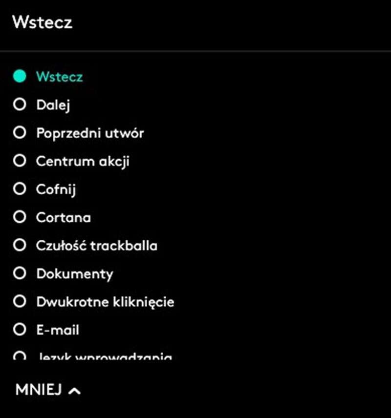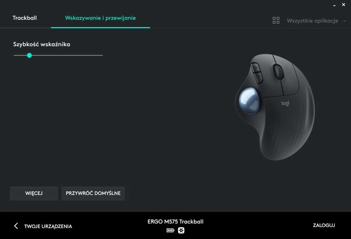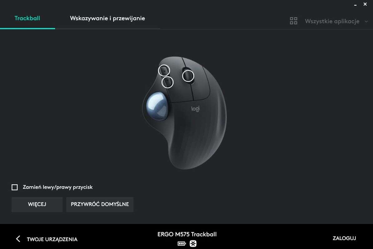 Co ważne, aplikacja Logitech Options pozwala Wam podejrzeć obecny stan naładowania baterii, zmienić czułość działania trackballa i podmienić funkcję rolki i przycisków bocznych.
