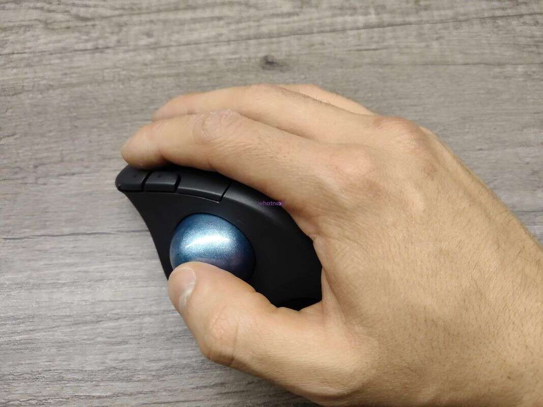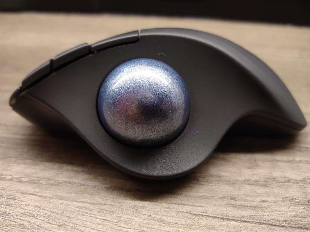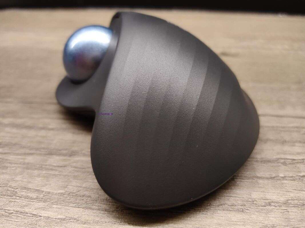 Oczywiście najważniejsza w tej myszy pozostaje wielka, gładka kula w granatowym kolorze z widoczną teksturą, którą z łatwością można wypchnąć z luki. To ona odpowiada za ruch kursora poprzez jej przesuwanie kciukiem, bo pod nią znalazł się optyczny sensor o czułości do 2000 DPI. Innymi słowy, ruch myszką po biurku, zastępujemy stosownym toczeniem tej kuli, czego ogarnięcie jest trudne zwłaszcza przy przejściu z tradycyjnej myszki na tę właśnie.