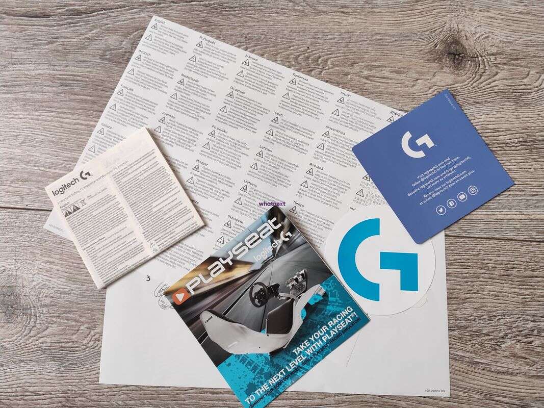W wielkim pudle, oprócz zabezpieczonej w kartonach kierownicy i zestawu pedałów, znajdziemy również zasilacz do całości oraz dokumentację z naklejką Logitech G na czele.