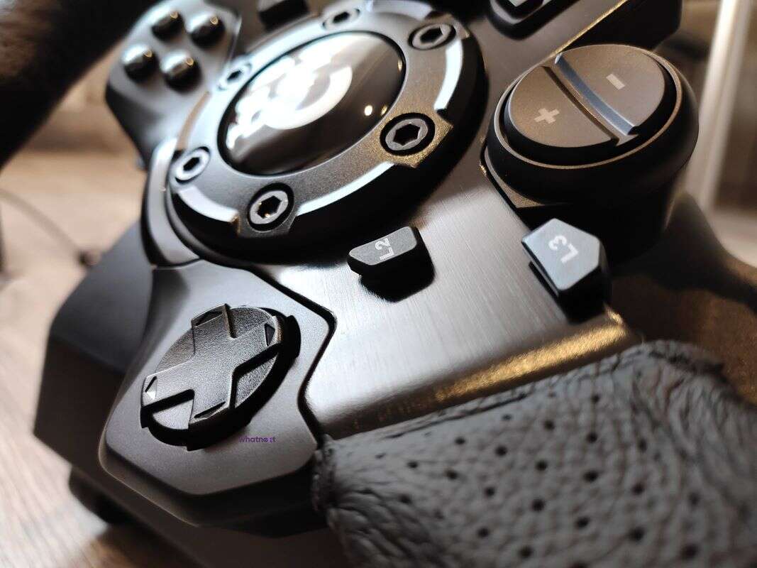 Wierzchołek kierownicy uzupełnia metalowa wstawka w kolorze wyróżniającego się niebieskiego, a jej wnętrze uzupełnia tradycyjny zestaw znany z padów z dodatkiem L3 i R3 (L1 i R1 odgrywają świetnie działające łopatki zmiany biegów za kierownicą), jak również pokrętło wyboru z „enterem”, przyciski plus/minus wspierane zależnie od gry.