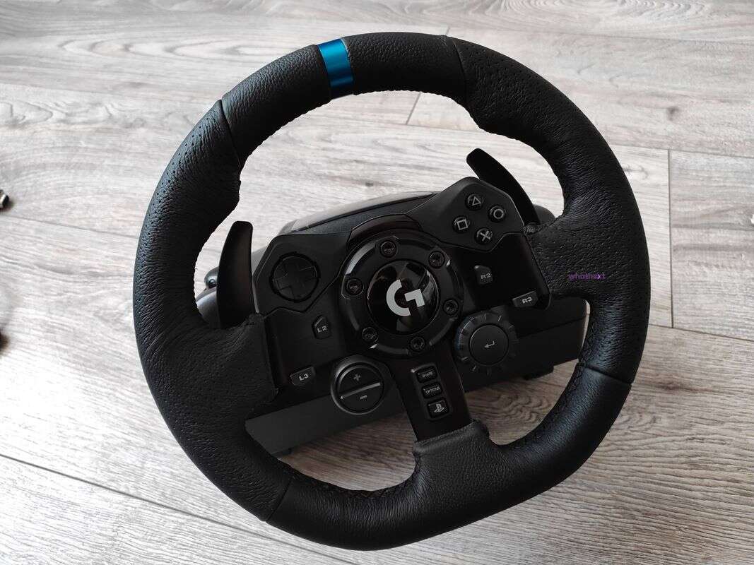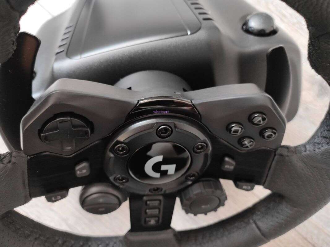 Pomijając otoczkę konstrukcyjną, sama kierownica G923 jest kawałem świetnego i przecudownie wykonanego sprzętu, składającego się ze stali (wałek przekładni kierowniczej), anodyzowanego aluminium (to buduje całą kierownicę) i polerowanej stali nierdzewnej (w przypadku łopatek do zmiany biegów). Jednak nasze ręce trafiają nie na goły metal, a ręcznie szytą skórę o wysokiej jakości i przyjemnej w dotyku fakturze, co w połączeniu ze stosownymi wypustkami i ramionami kierownicy, pozwala na bezproblemowe ocenienie pozycji klawiatury. Ta zresztą pozwala na 900-stopniowy obrót, co sprowadza się do półtora obrotu w lewo i półtora w prawo.