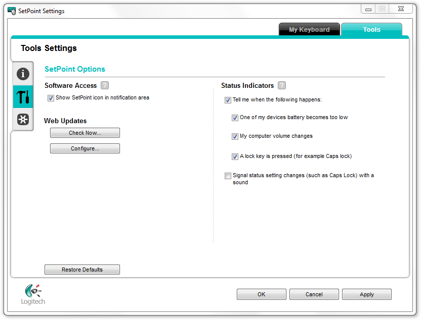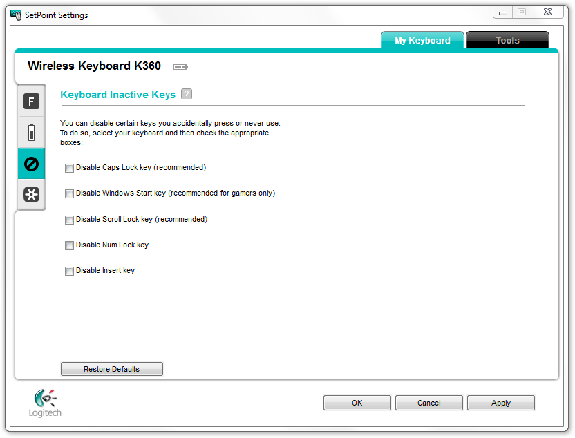 Zwłaszcza że K360 Wireless Keyboard możecie dodatkowo ustawić pod siebie w nieco przestarzałym już oprogramowaniu Setpoint. Archaiczny wygląd softu nie uniemożliwia jednak ustawienia podstawowych opcji, czy podmiany funkcji klawiszy funkcyjnych. W tej aplikacji jednak podejrzycie to, co najważniejsze, czyli wytrzymałość baterii, które według Logitecha posłużą Wam do 3 lat.