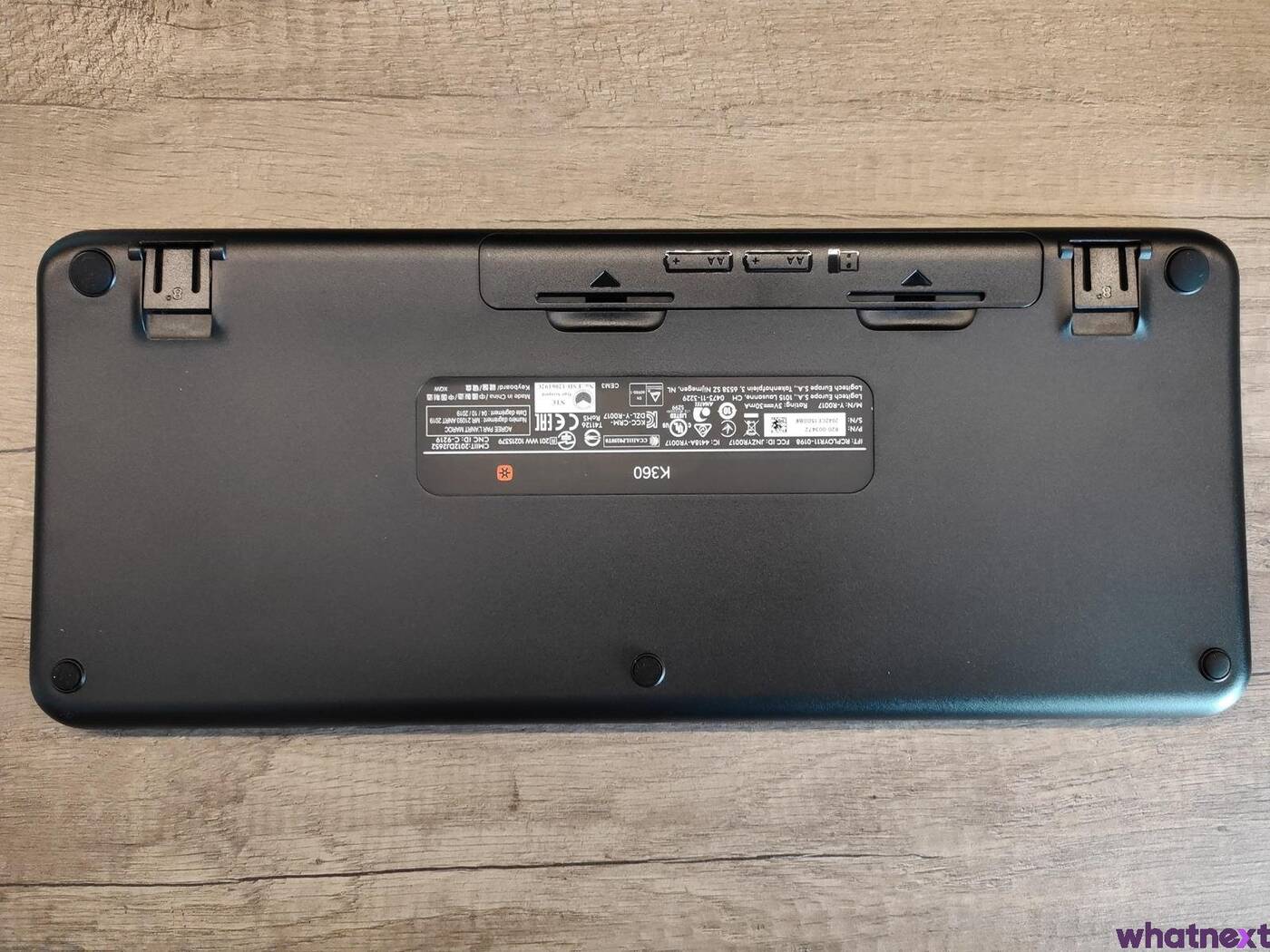 Na spodzie znajdziemy też zestaw pięciu antypoślizgowych gumowych podkładek, które o dziwo są skuteczne w utrzymywaniu K360 na blacie. Ostatnim elementem jest prosta zaślepka, skrywająca miejsce na dwie baterie AA do zasilania i schowek na dołączony w zestawie 2,4 GHz odbiornik Logitech Unifying.