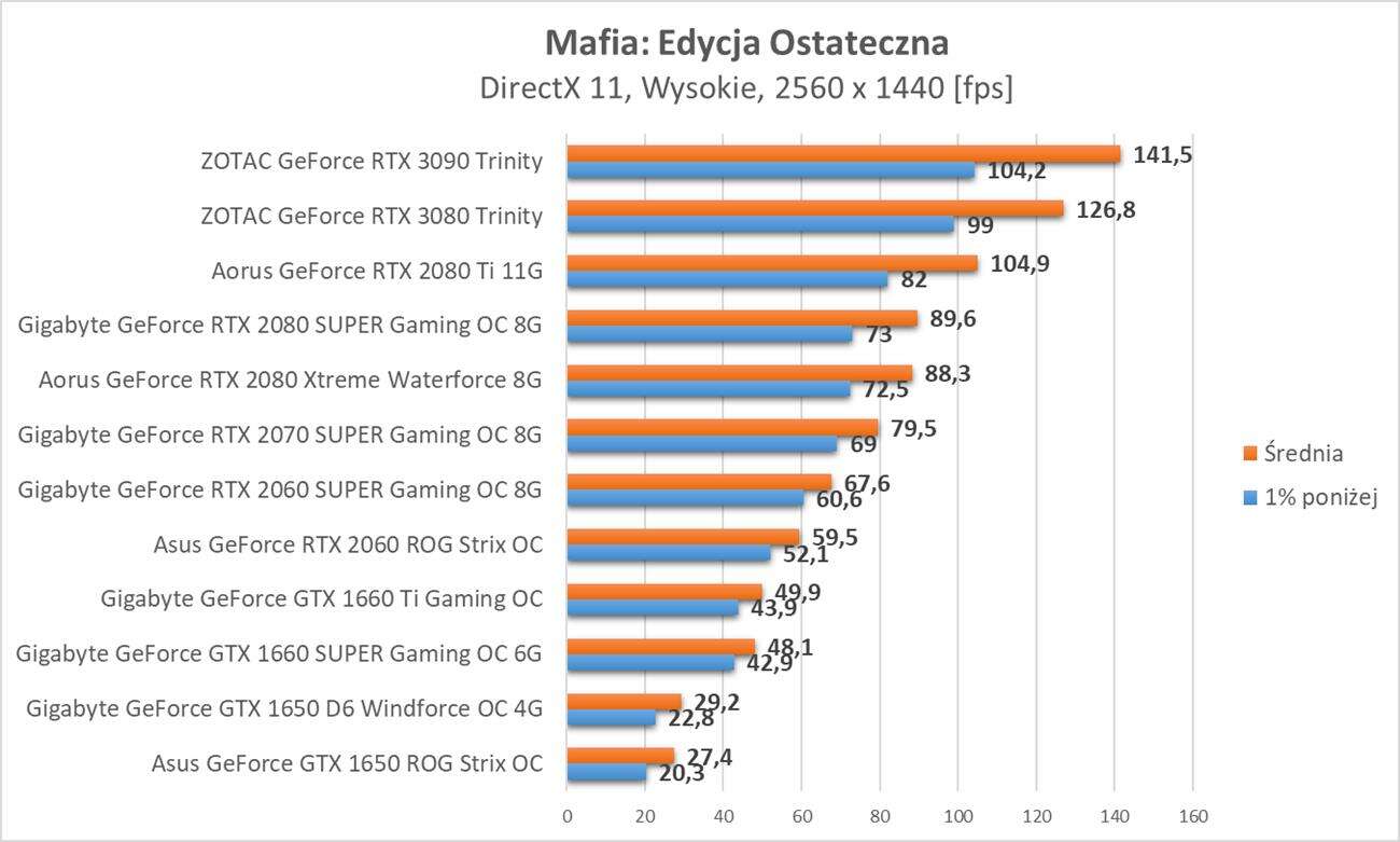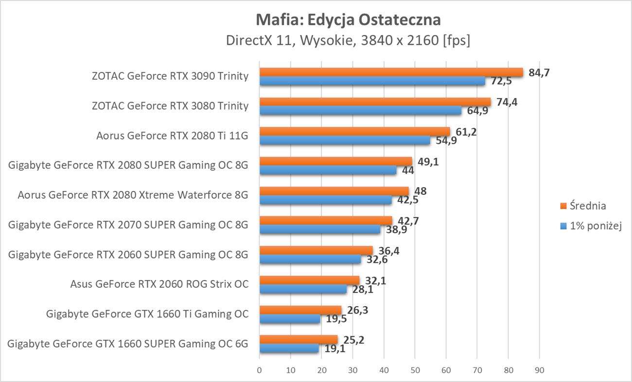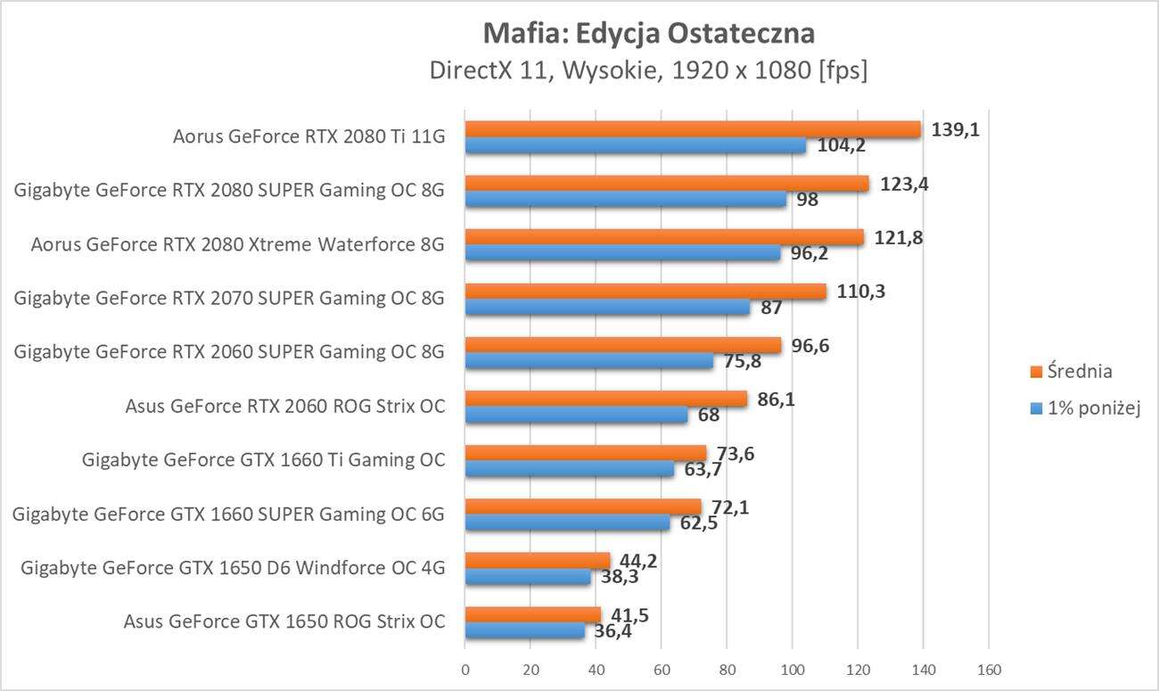Testy kart graficznych w Mafia: Edycja Ostateczna okazuje się nie być zabójcą dla kart graficznych. Do rozdzielczości Full HD i 60 fps wystarczy GTX 1660 SUPER, do 2K RTX 2060, a do 4K RTX 2080 Ti. Nie są to jakieś wygórowane wymagania i optymalizację oceniam pozytywnie.