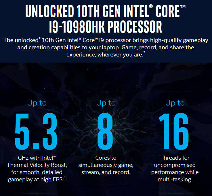 Intel Core i9-10980HK to bezpośrednia konkurencja dla Ryzena 9 4900HS. Układ wykonany jest w 14 nm oraz oferuje 8 rdzeni i 16 wątków. Maksymalna prędkość wynosi 5,30 GHz przy zaledwie 45 W TDP.