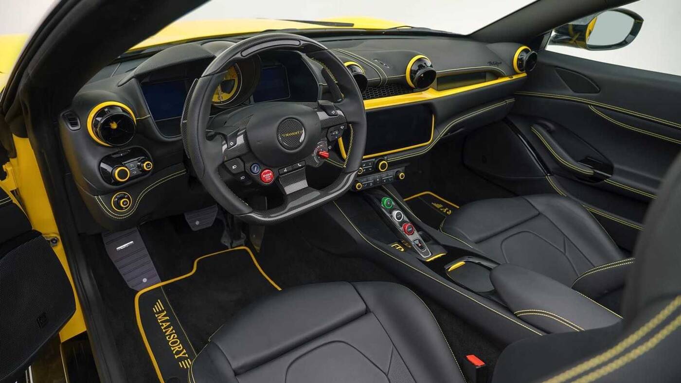 Całość wieńczą nawet słupki, klamki drzwi, subtelny spojler i już niej subtelny dyfuzor, jak również specjalne 21-calowe felgi z przodu i 22-calowe z tyłu z żółtą obramówką, ale tą wisienką na torcie są czarne odznaki Ferrari. Ten sam motyw (czarno-żółty) jest kontynuowany w spowitej w czerni, a więc i włóknie węglowym kabinie, w której to kierownica porzuciła logo marki na rzecz tunera Mansory.