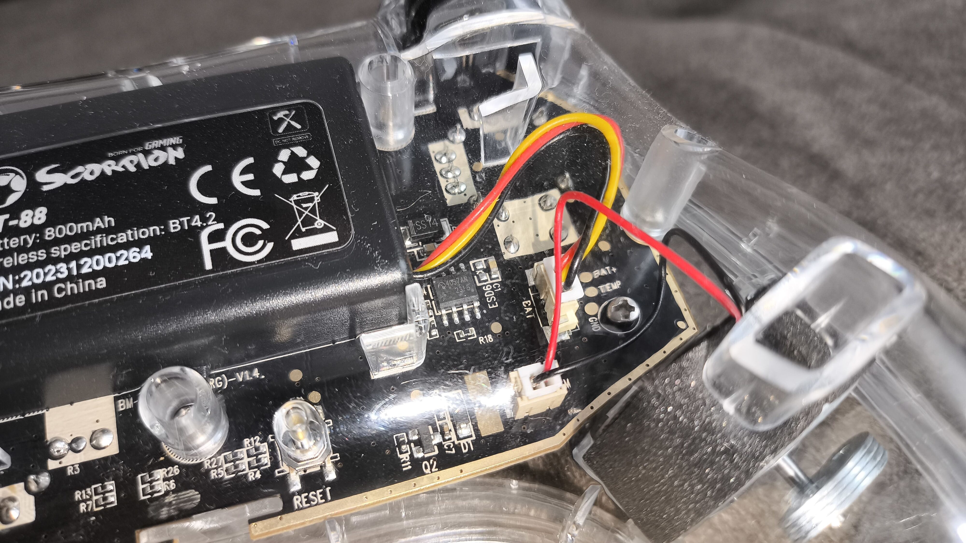 W zestawie z padem znajduje się niewielki odbiornik 2.4 GHz, który wygląda jak klasyczny dongle USB. Znajdziemy go wewnątrz przedziału baterii, co zabezpiecza go przed zgubieniem. Urządzenie zasilane jest dwiema bateriami typu AA, których nie ma w zestawie – warto więc zawczasu się w nie zaopatrzyć. Co ciekawe, obudowa posiada miejsce na przechowywanie dongla, co jest miłym dodatkiem, jeśli zamierzamy zabierać pada w podróż.