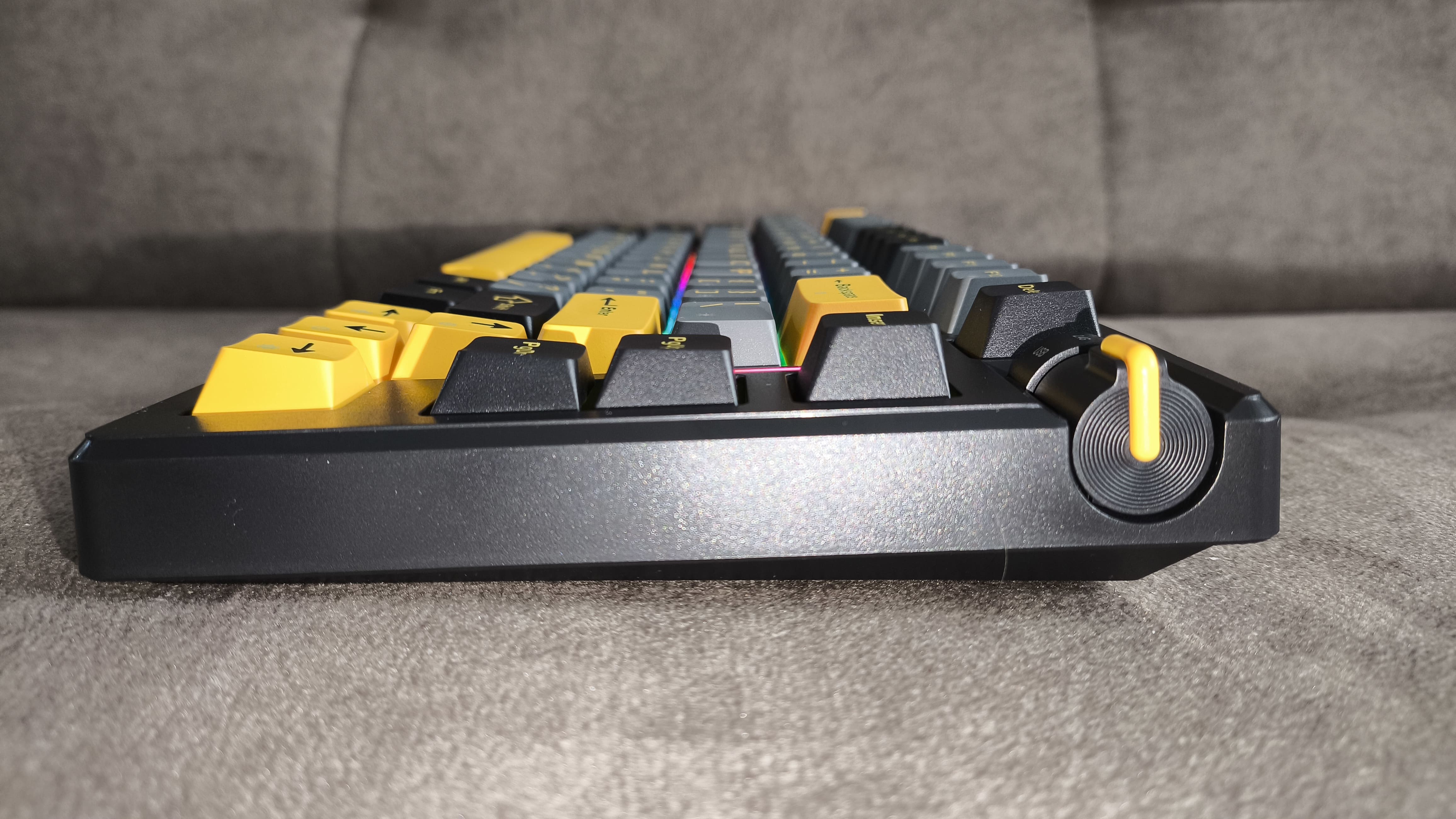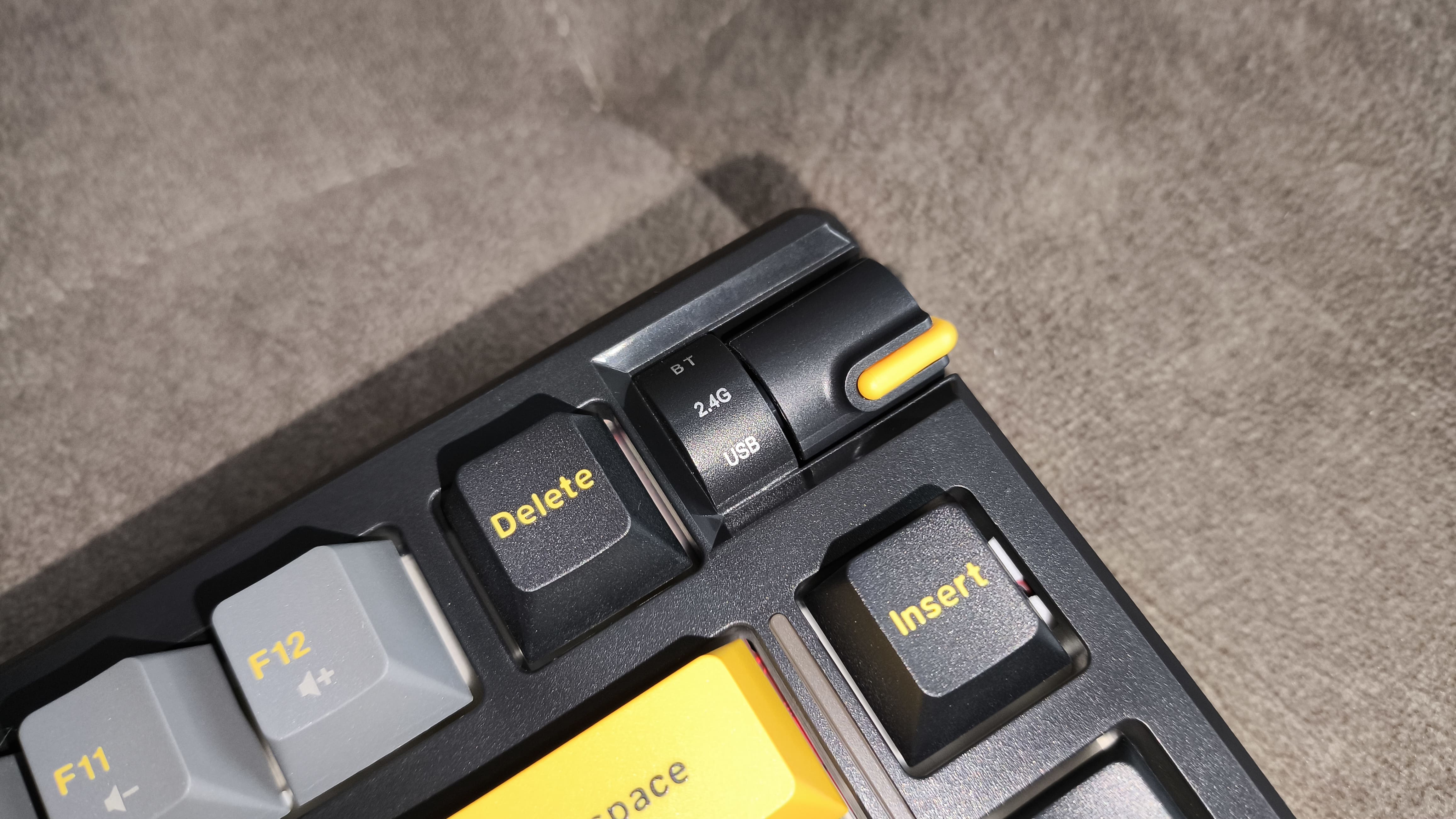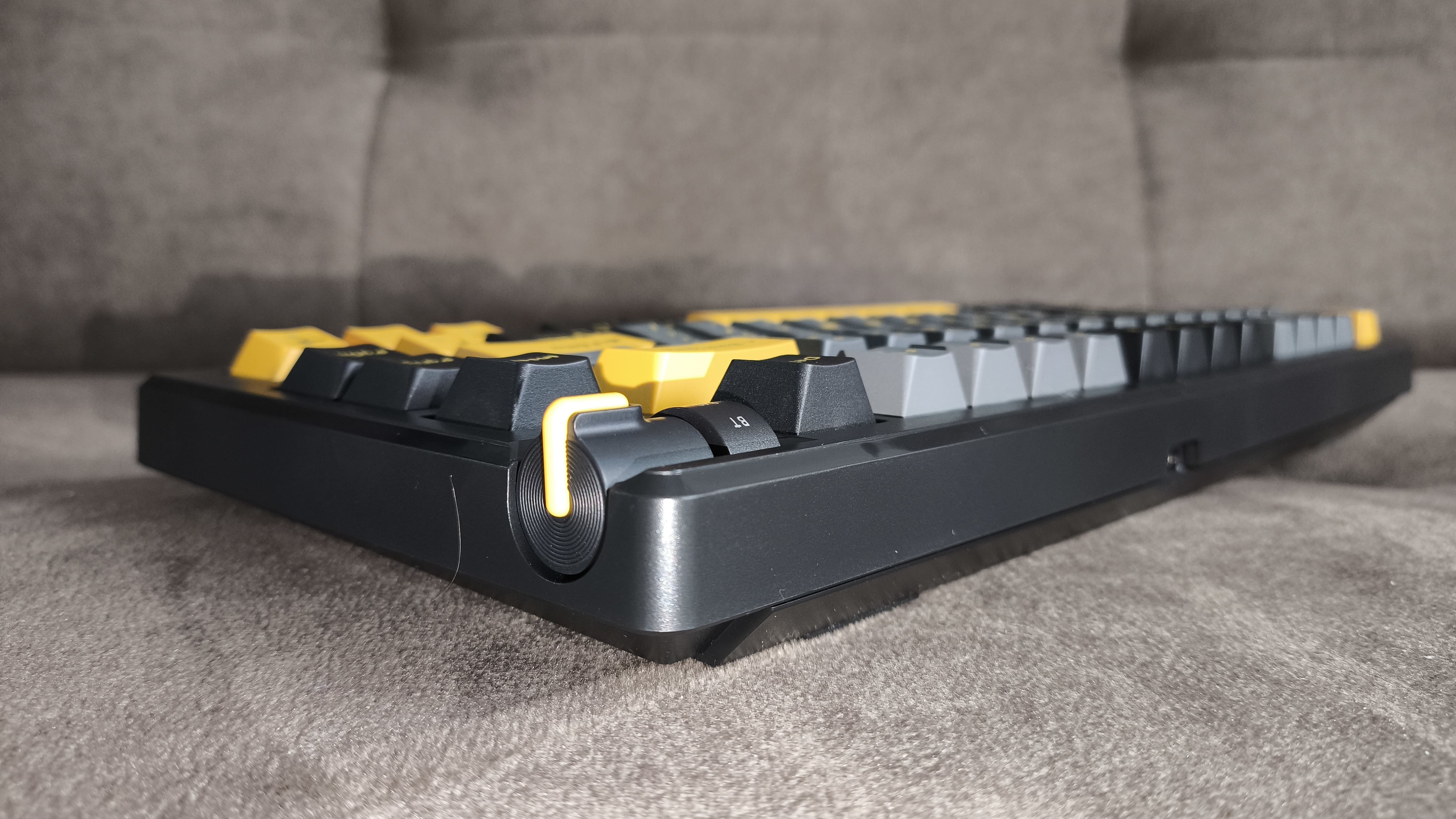 Uwagę przykuwa prawa górna część klawiatury. Pomimo pozornego podobieństwa do popularnych pokręteł multimedialnych, zastosowany tu element pełni wyłącznie funkcję fizycznego przełącznika trybu łączności (Bluetooth, 2.4 GHz i przewodowy USB).