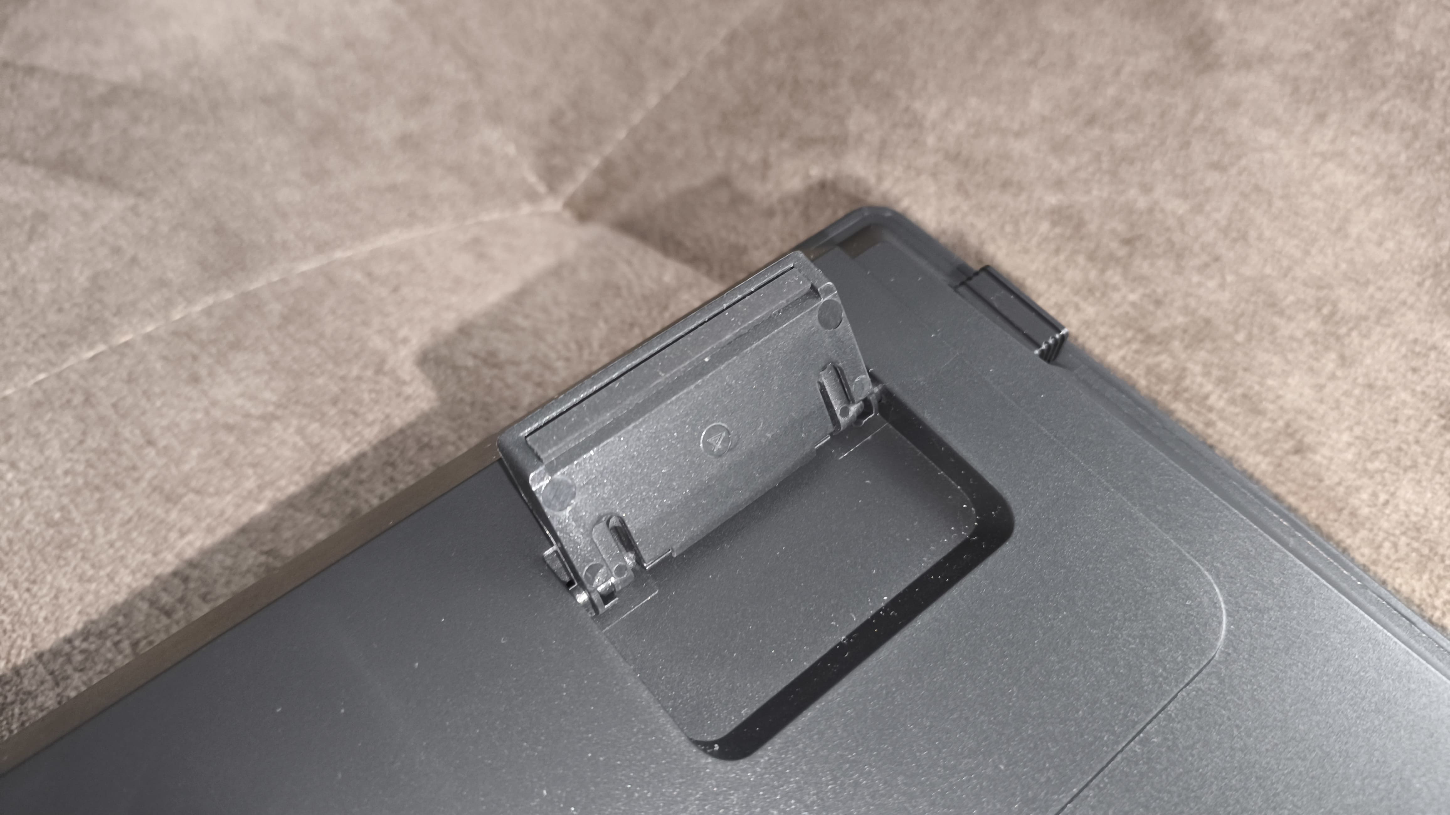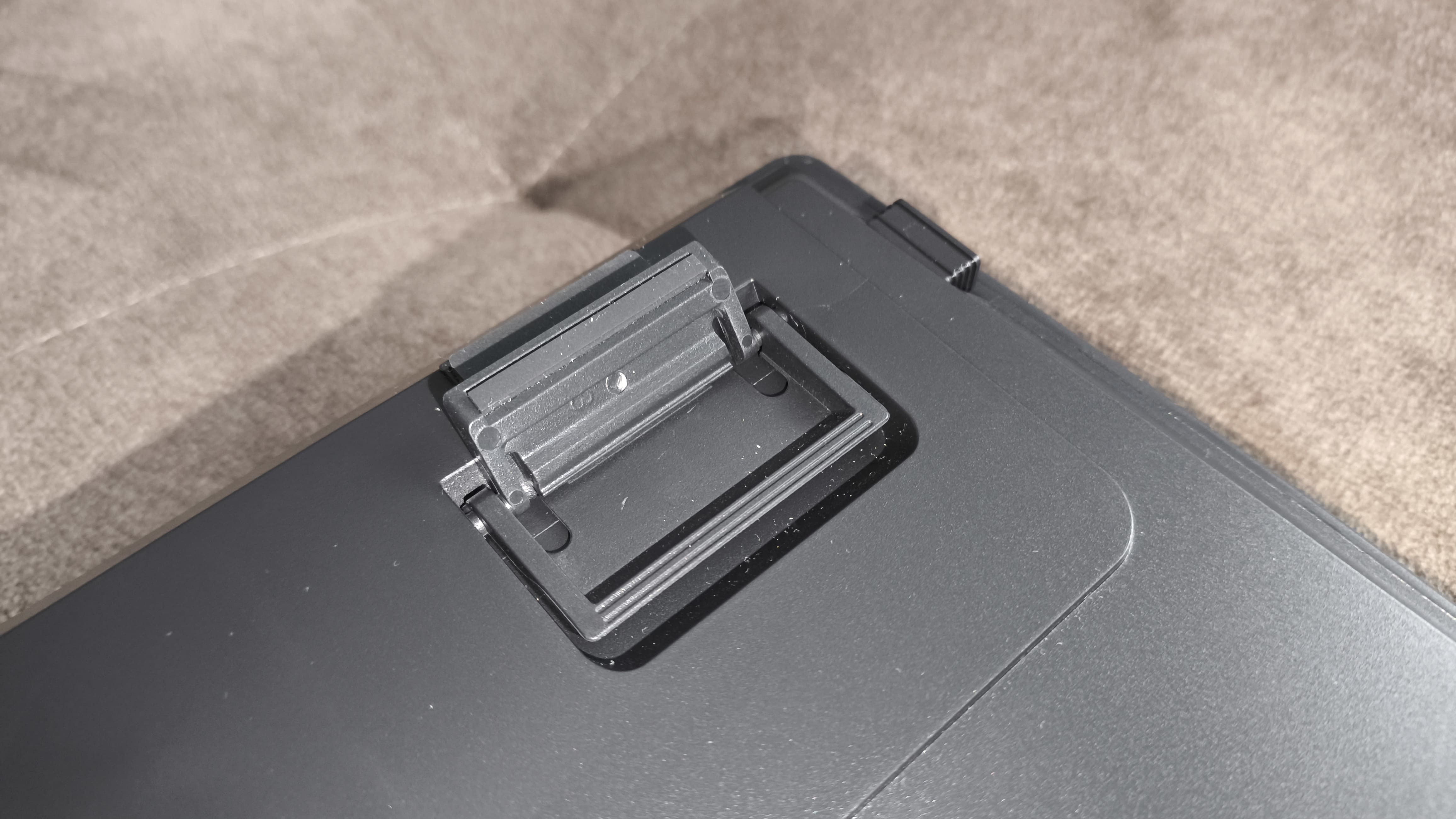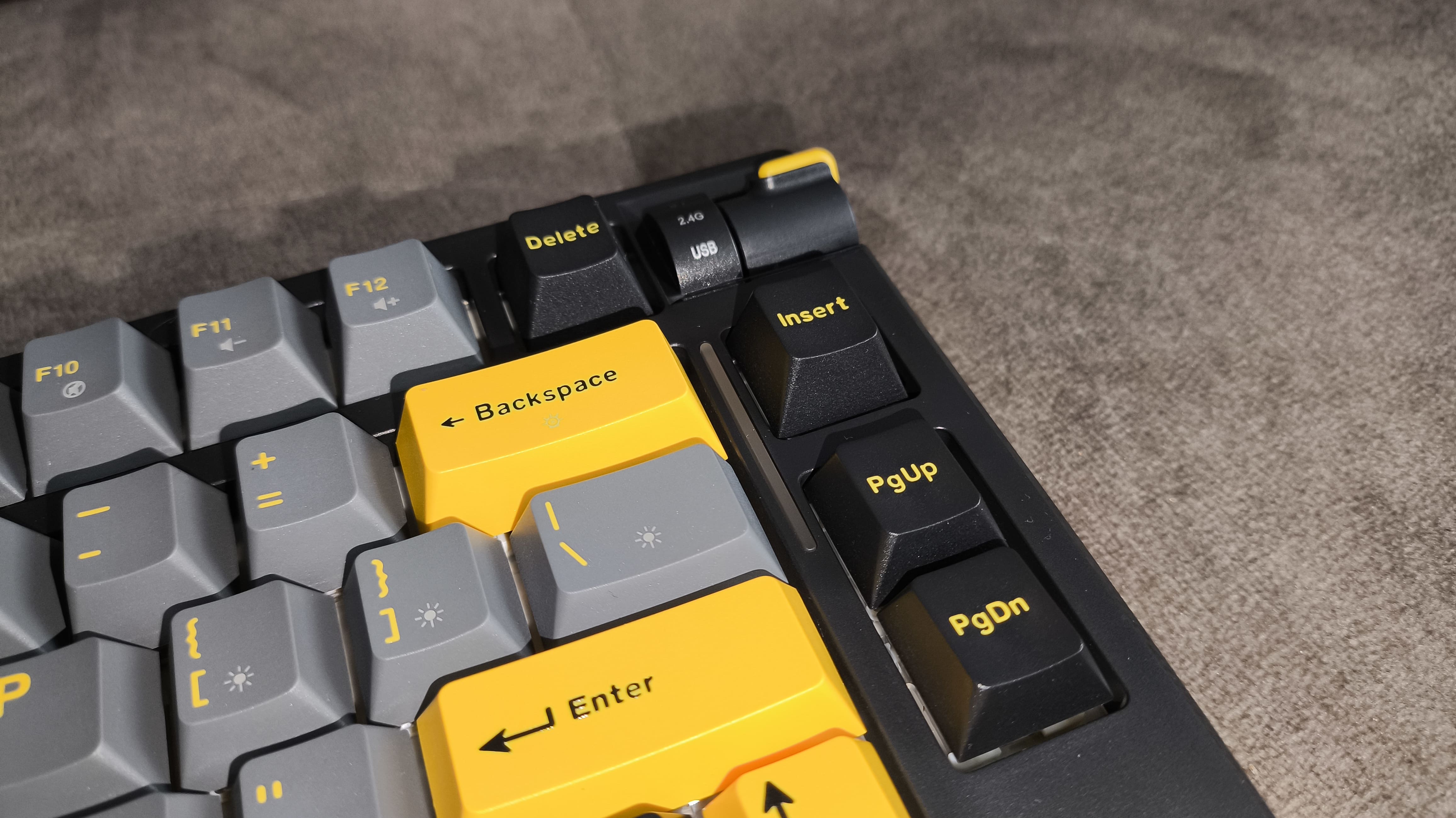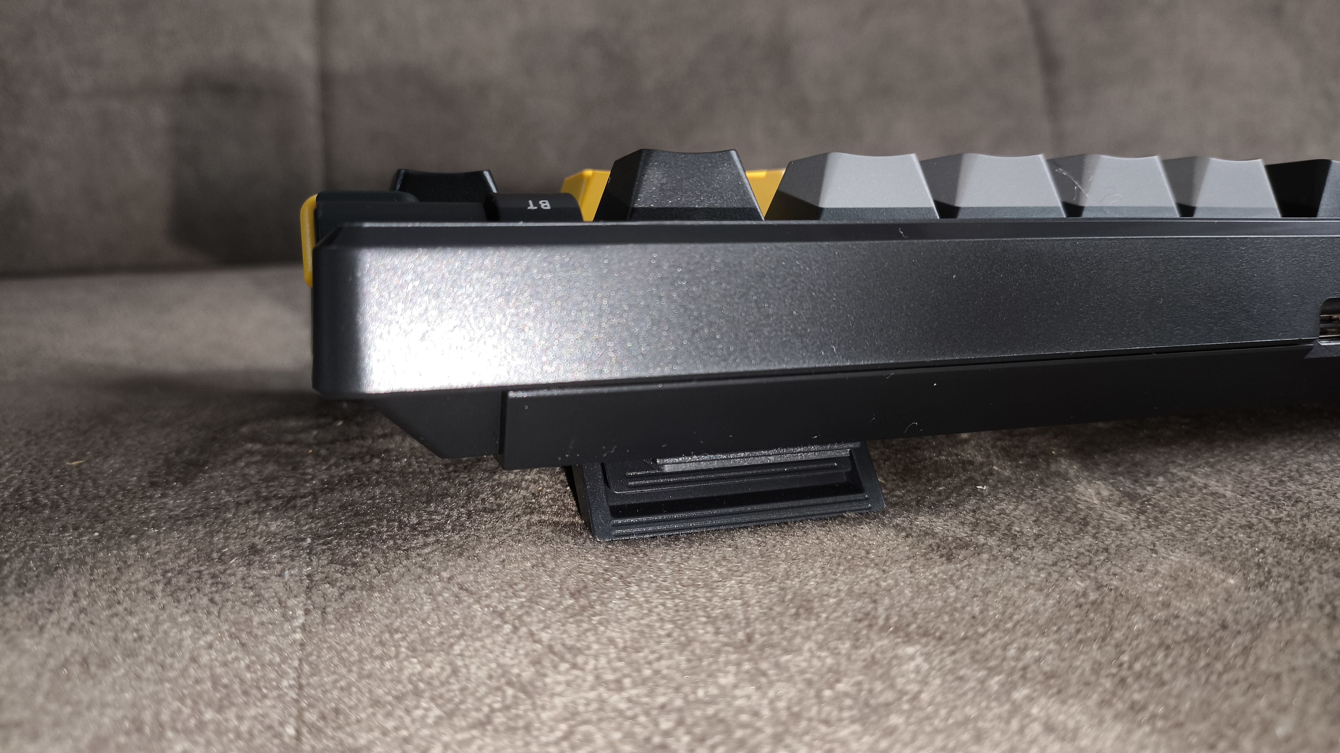 Uwagę przykuwa prawa górna część klawiatury. Pomimo pozornego podobieństwa do popularnych pokręteł multimedialnych, zastosowany tu element pełni wyłącznie funkcję fizycznego przełącznika trybu łączności (Bluetooth, 2.4 GHz i przewodowy USB).