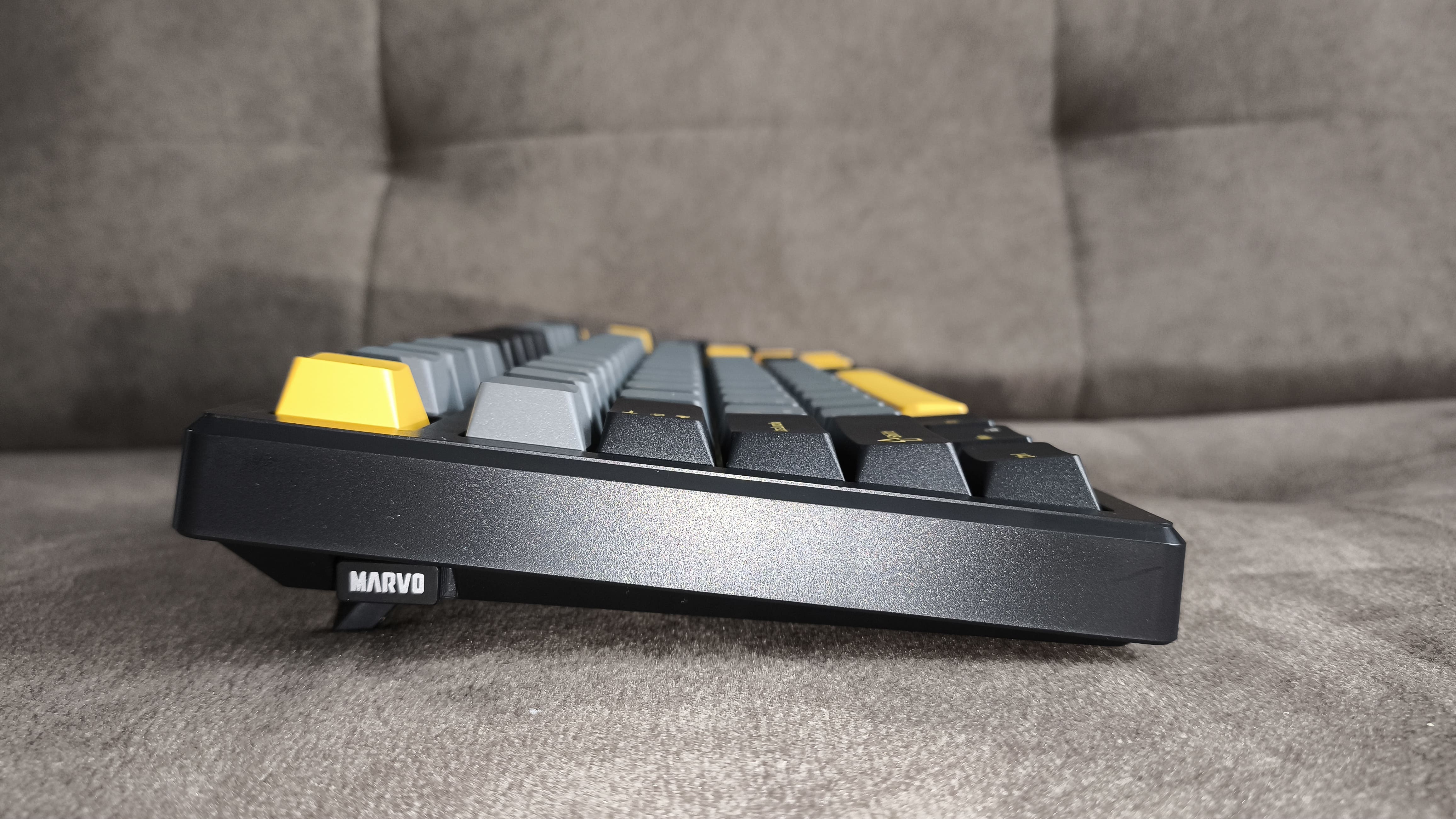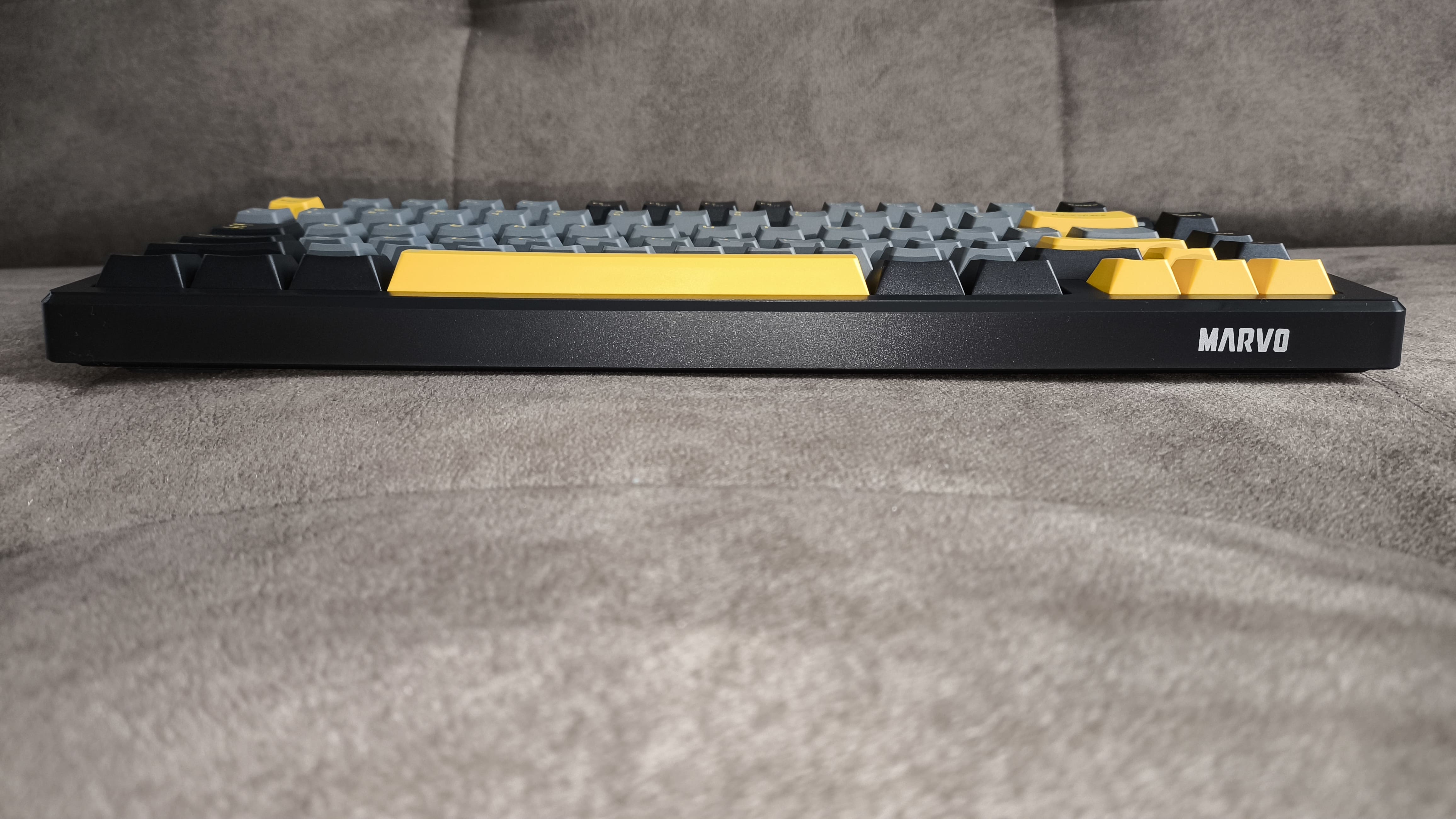 Marvo KG958W Meqa 80W prezentuje się nowocześnie, przyciągając wzrok odważnym połączeniem kolorów – dominującymi odcieniami czerni i szarości, uzupełnionymi o kontrastowe, żółte akcenty w obrębie najważniejszych klawiszy (np. Space, Enter, Esc), jak również samego przełącznika trybów pracy. Estetyka klawiatury przywodzi na myśl nieco industrialny, funkcjonalny styl, wzbogacony subtelnymi, gamingowymi elementami.