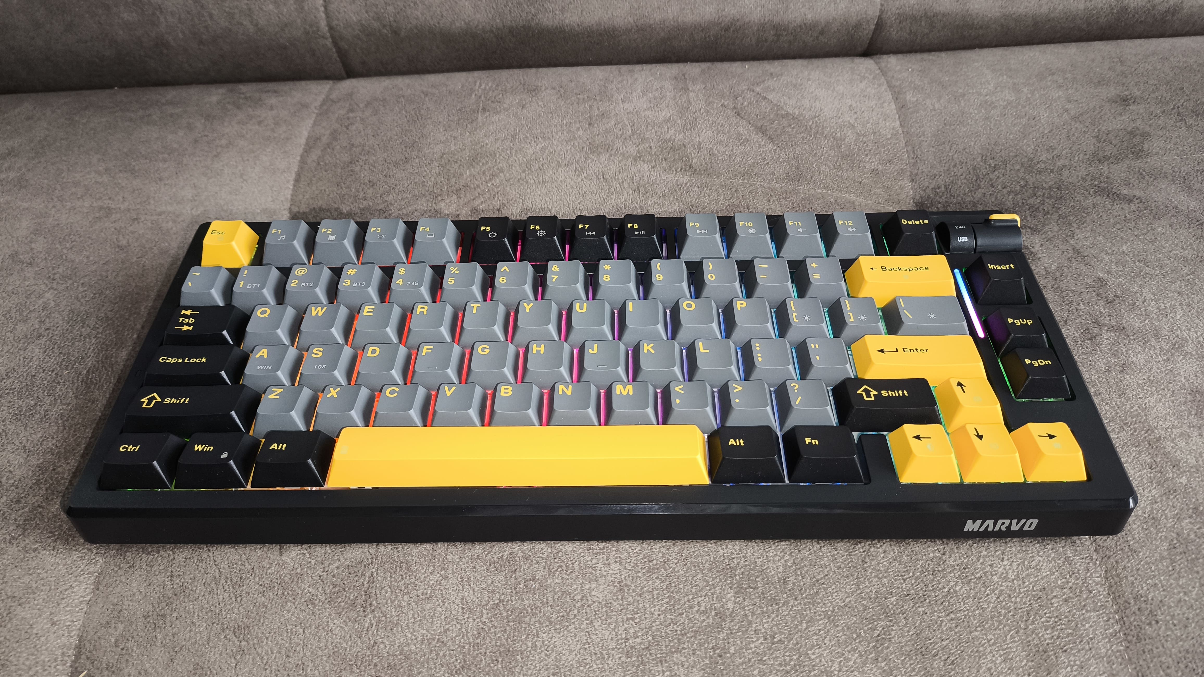 Marvo KG958W Meqa 80W to wspomniany już wyżej model typu 75%, choć technicznie można powiedzieć 74% lub 76% – różnica jednego klawisza w górę lub dół. Klawiatura zachowuje jednak pełny rząd F-klawiszy oraz pełną warstwę funkcyjną, co sprawia, że nie odczujemy braku numpada w codziennym użytkowaniu czy graniu.