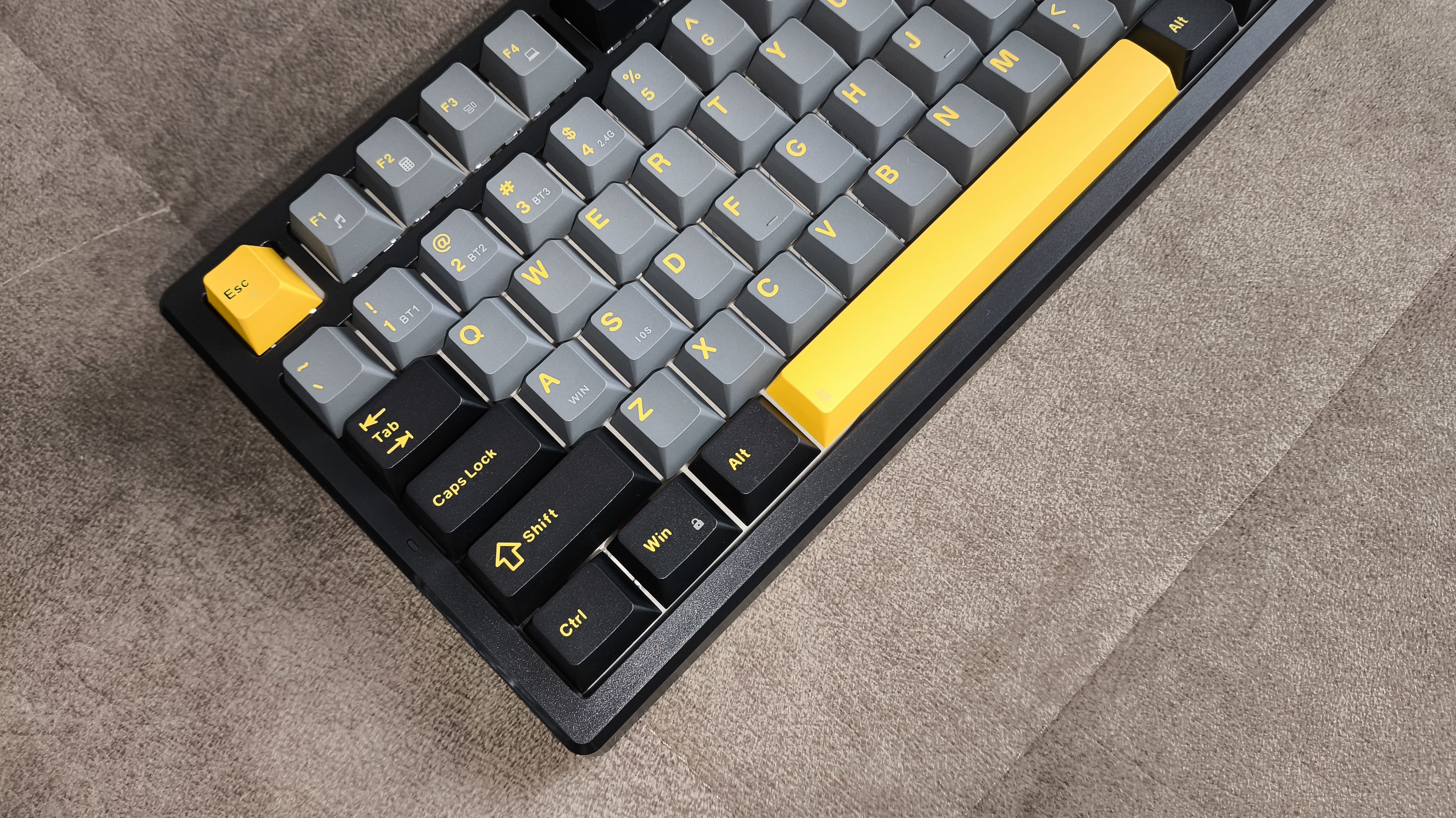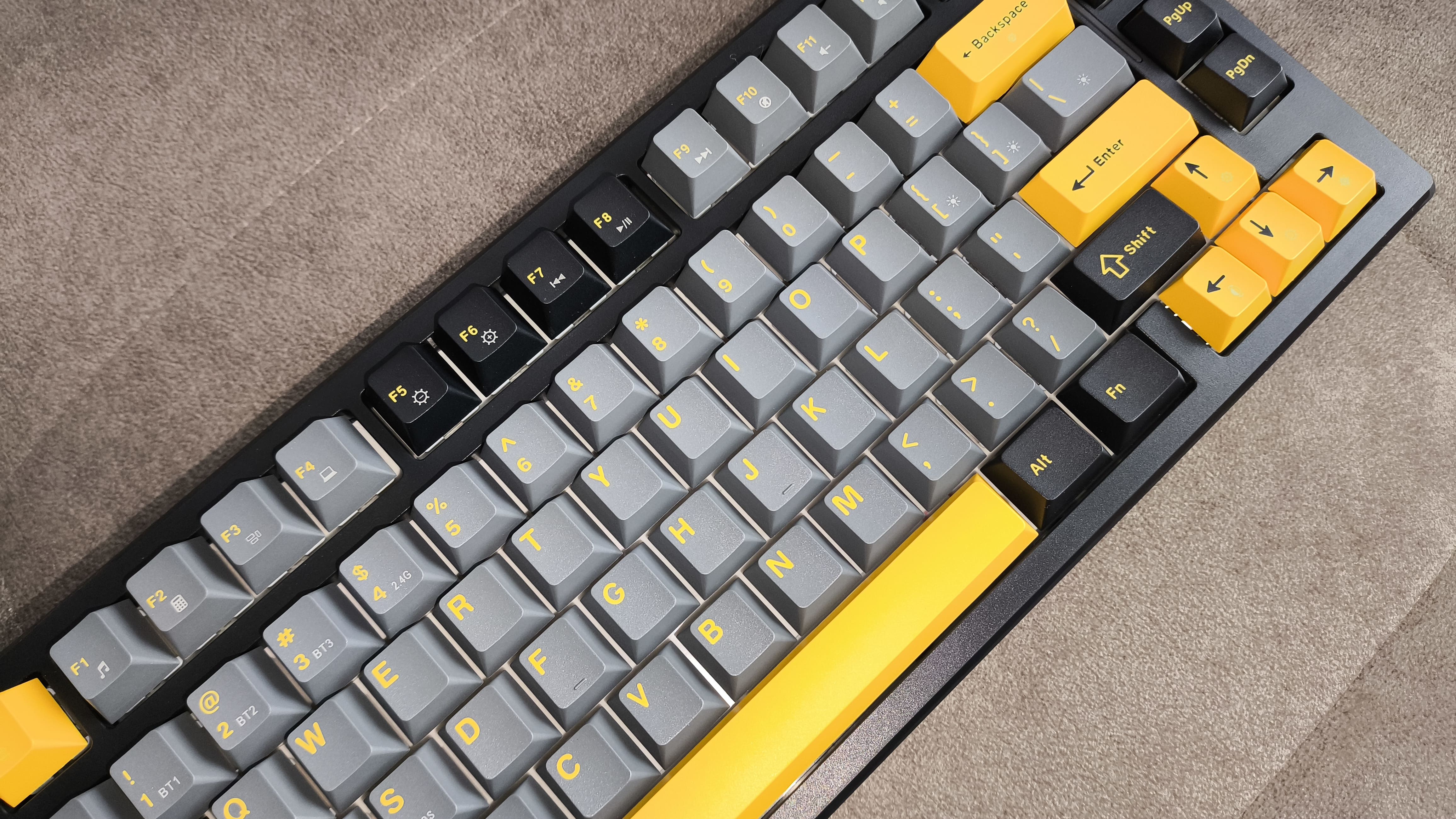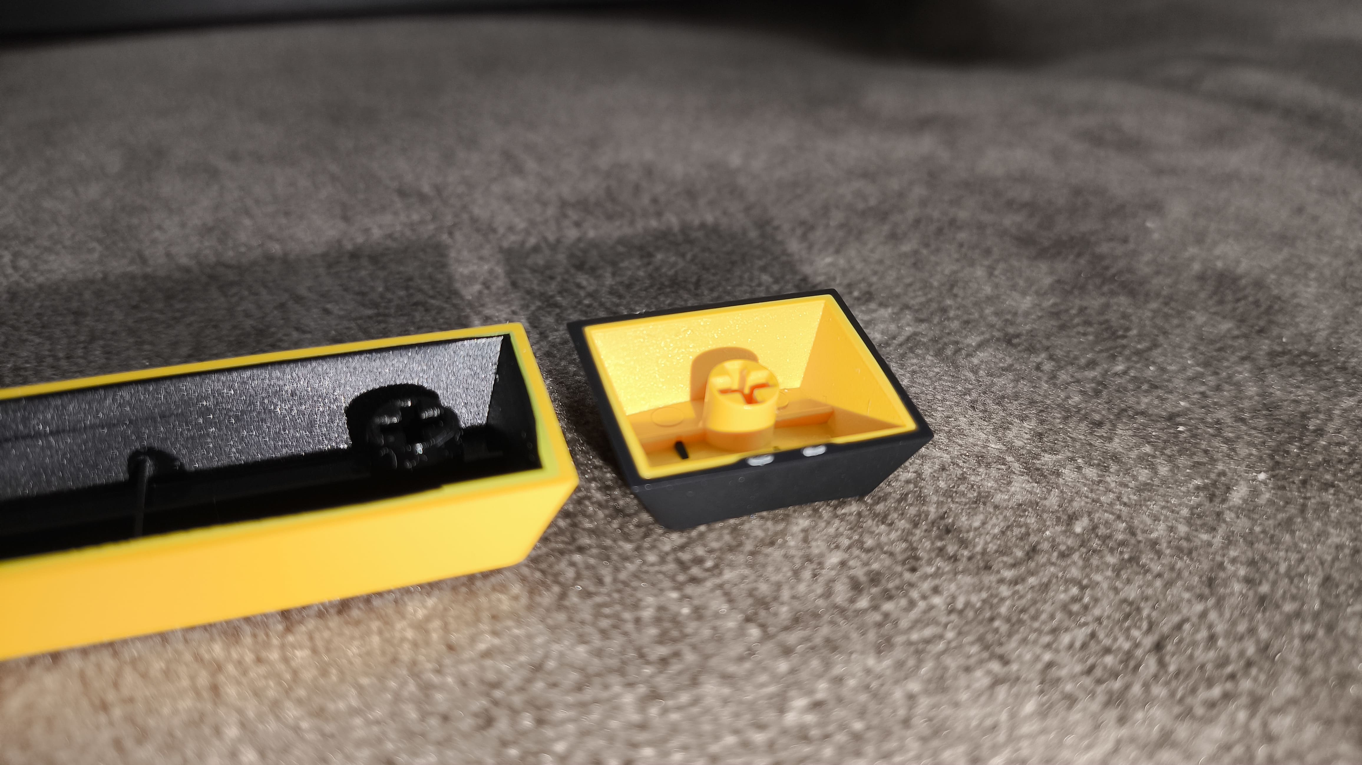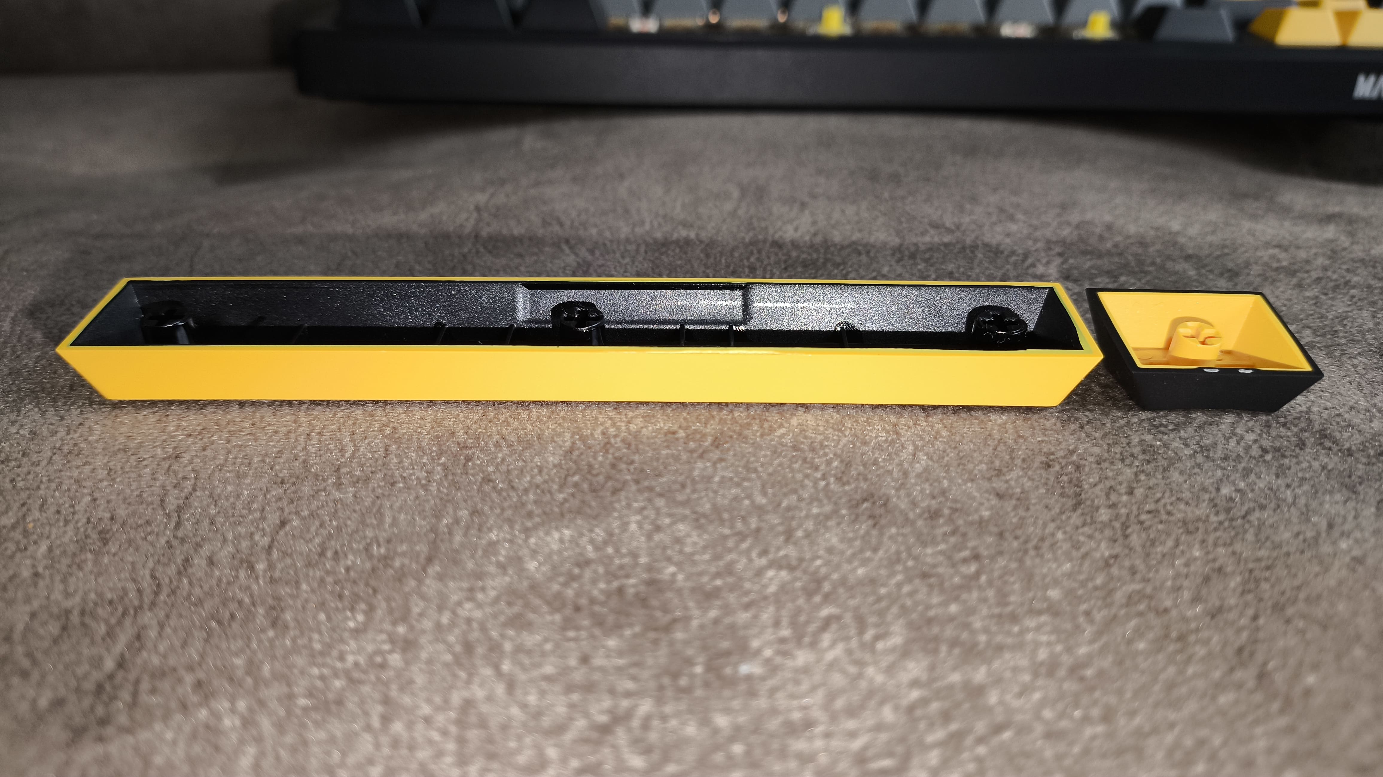 Mamy tu klasyczne nakładki w układzie OEM z wyraźnym, lekko chropowatym wykończeniem i żółtym nadrukiem, co dobrze wpływa zarówno na estetykę, jak i trwałość legend. Całość zbudowano z materiału PBT, za co należy pochwalić producenta.