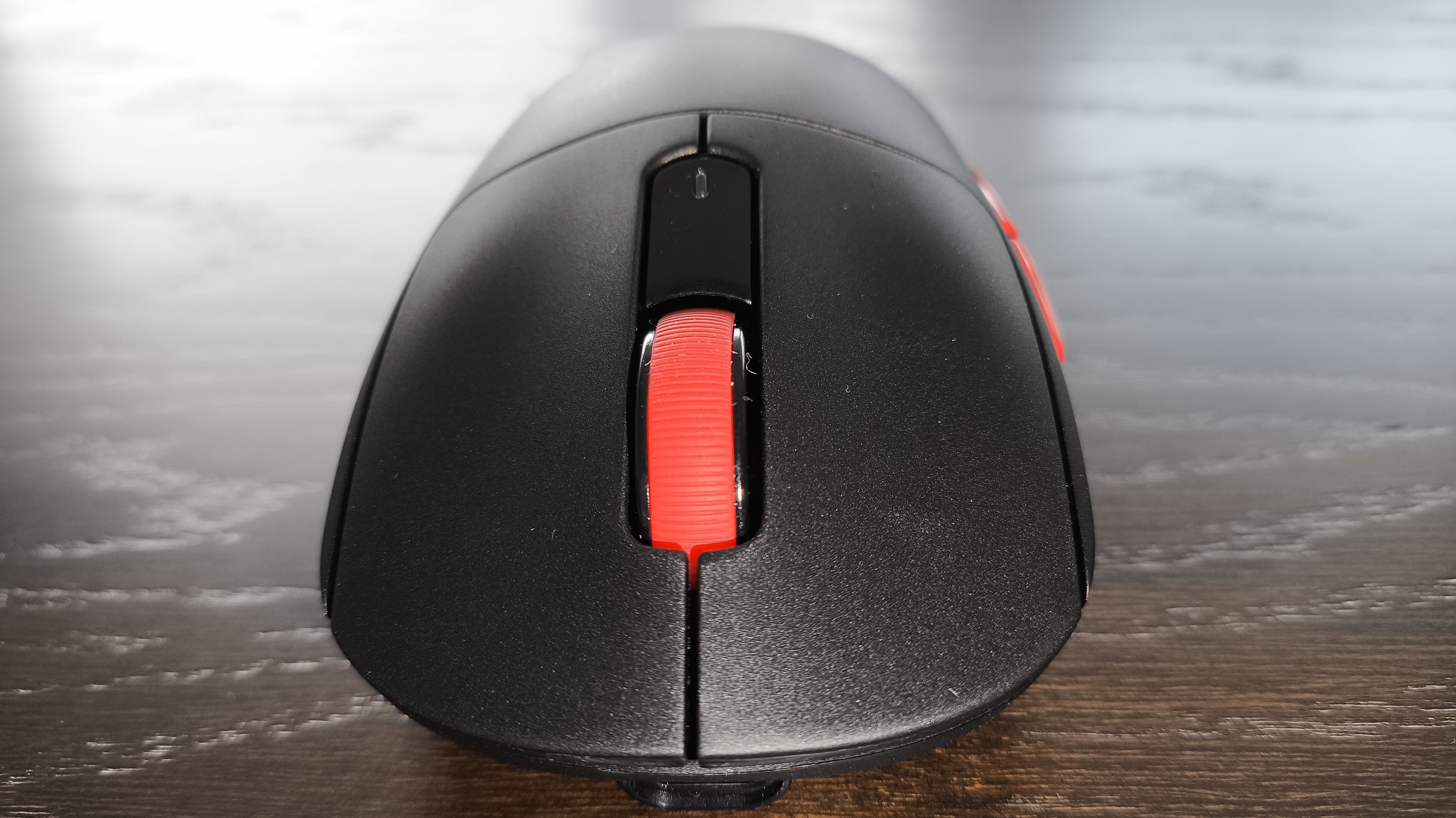 Rolka przewijania, ozdobiona czerwoną, gumową powłoką, pracuje płynnie, z wyraźnym skokiem. Jest dobrze osadzona, choć i tutaj można zauważyć delikatny luz w obrębie osi, który objawia się minimalnym „lataniem” w poziomie. Sama funkcja przycisku w scrollu działa bez zarzutu — aktywacja następuje przy rozsądnym nacisku, a responsywność nie budzi zastrzeżeń.