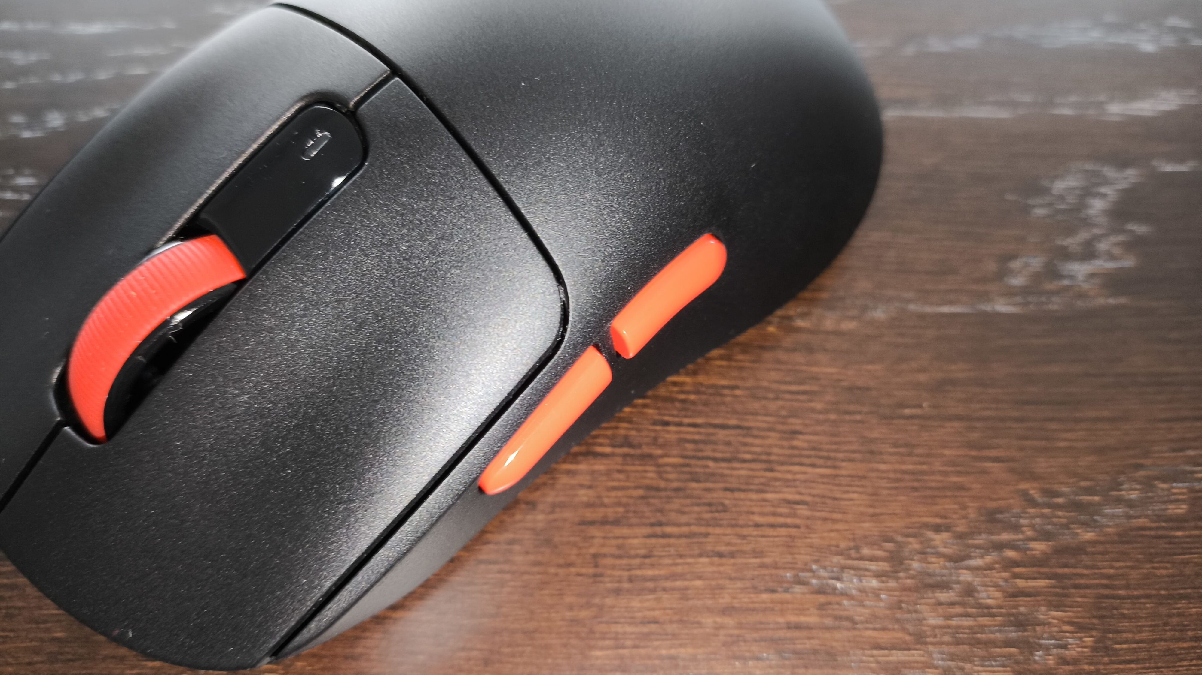 Główne przyciski są osadzone stosunkowo stabilnie — choć w tej części można dopatrzyć się drobnych luzów. Nie wpływa to jednak znacząco na komfort pracy czy gry, a w tej klasie cenowej trudno traktować to jako poważny minus. Dwa boczne przyciski natomiast siedzą bardzo solidnie — są dobrze zintegrowane z konstrukcją i mają wyczuwalny, ale miękki klik. Ich rozmieszczenie również jest poprawne — łatwo po nie sięgnąć, bez potrzeby zmiany pozycji dłoni.