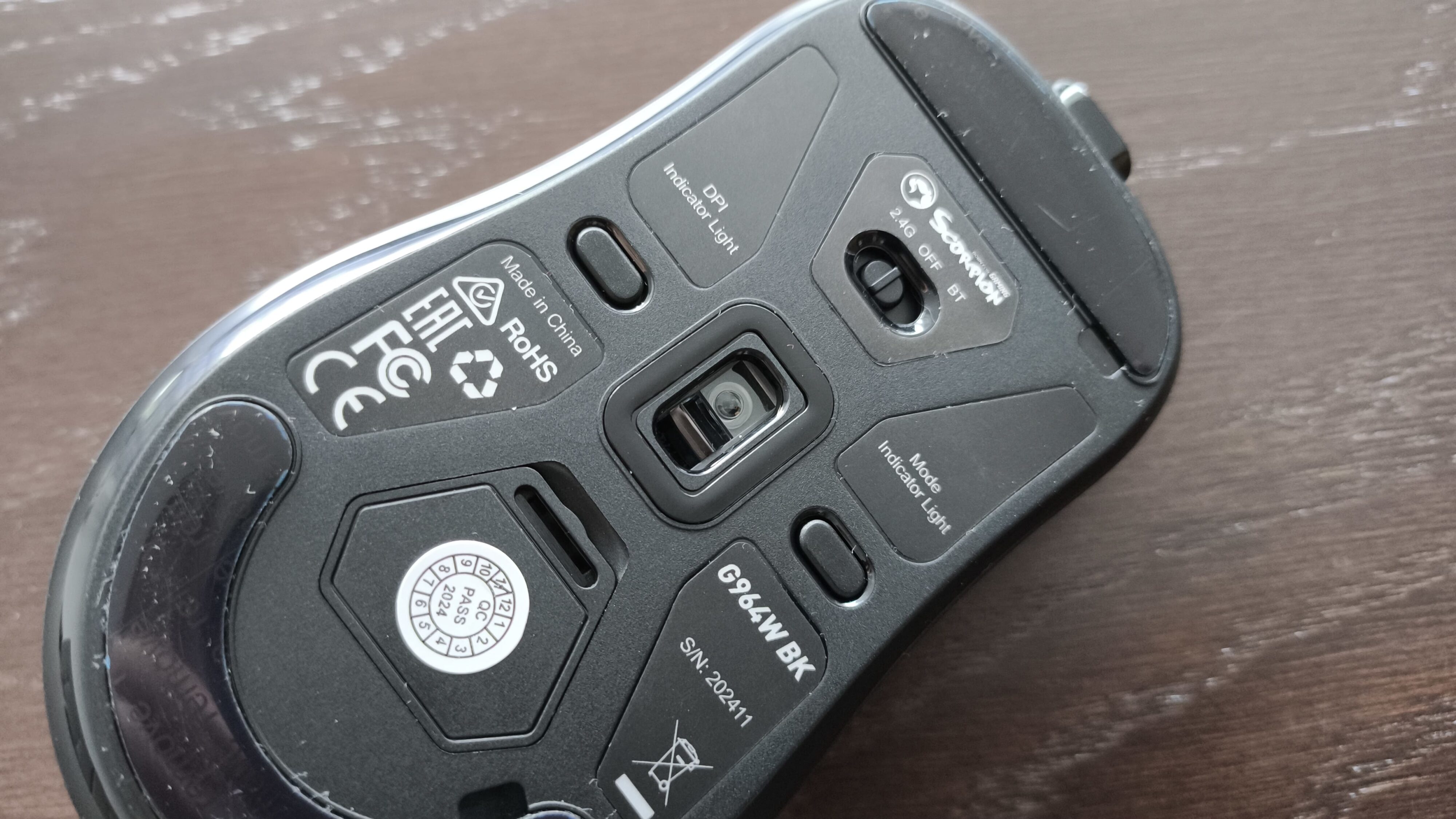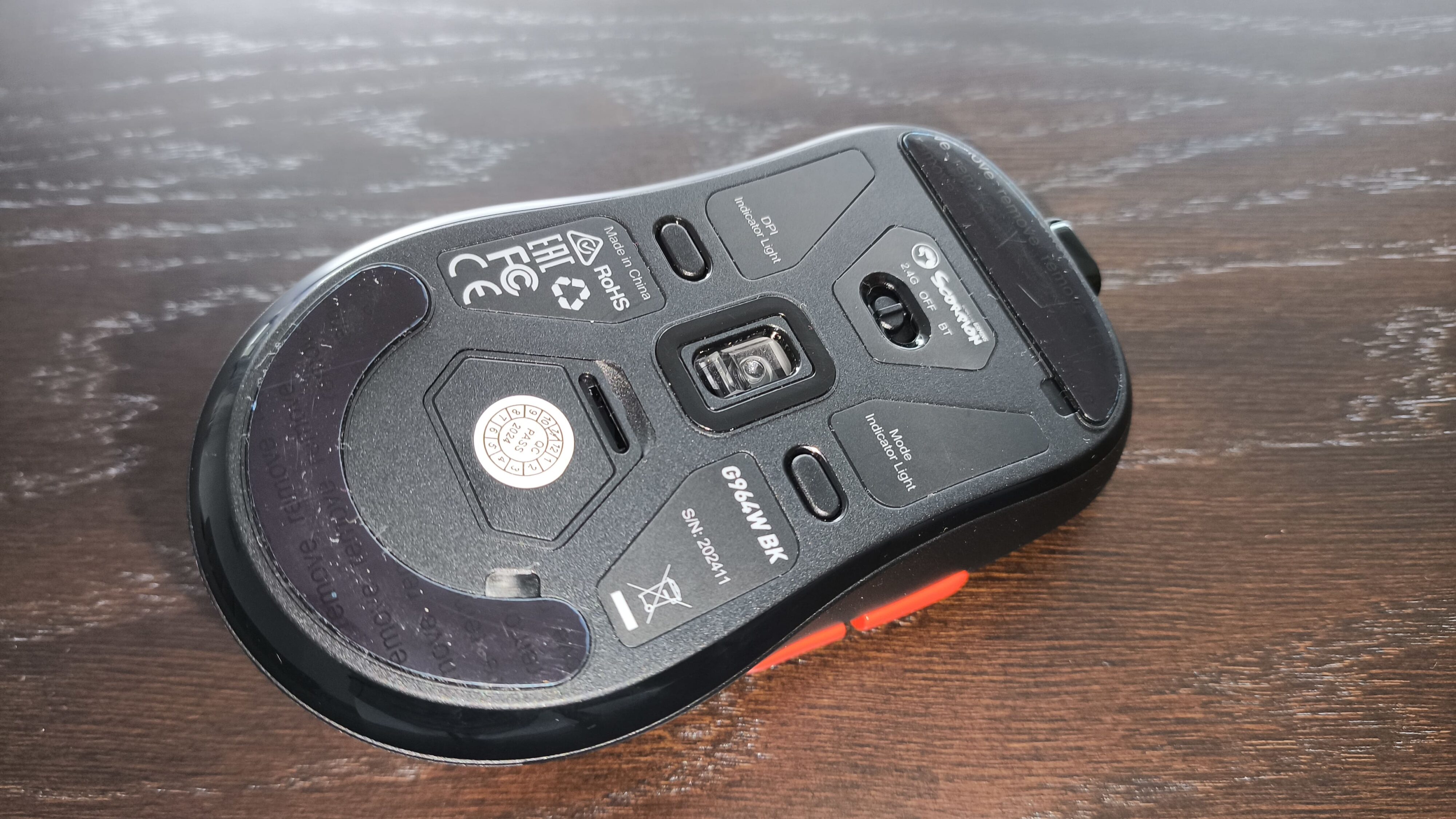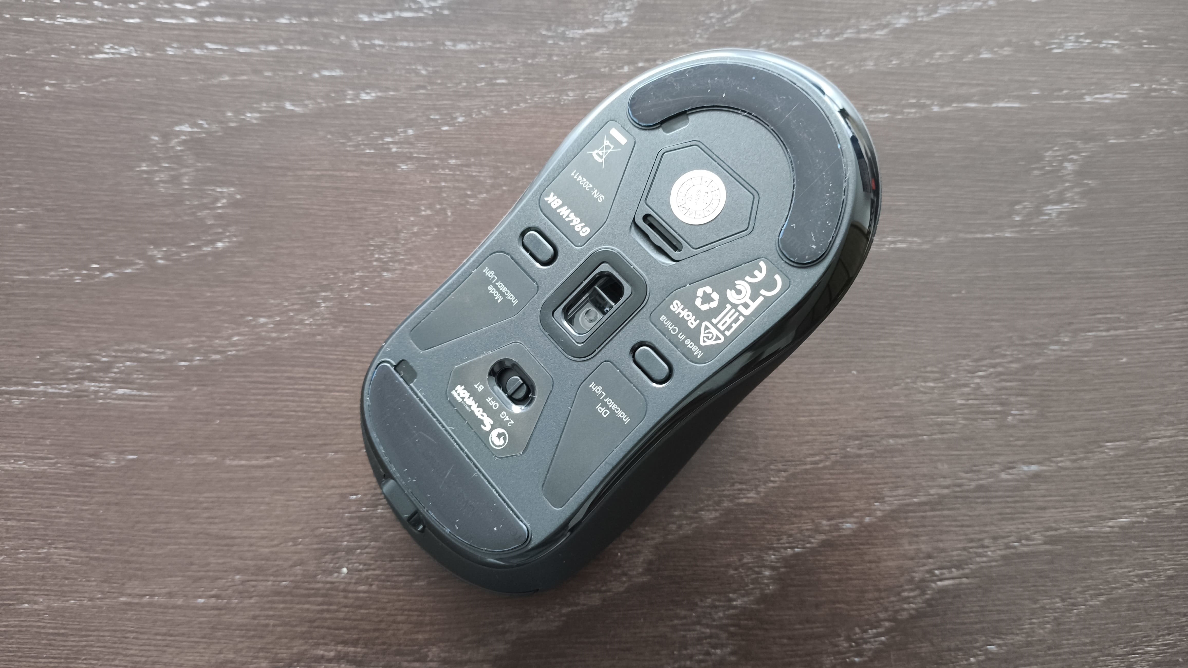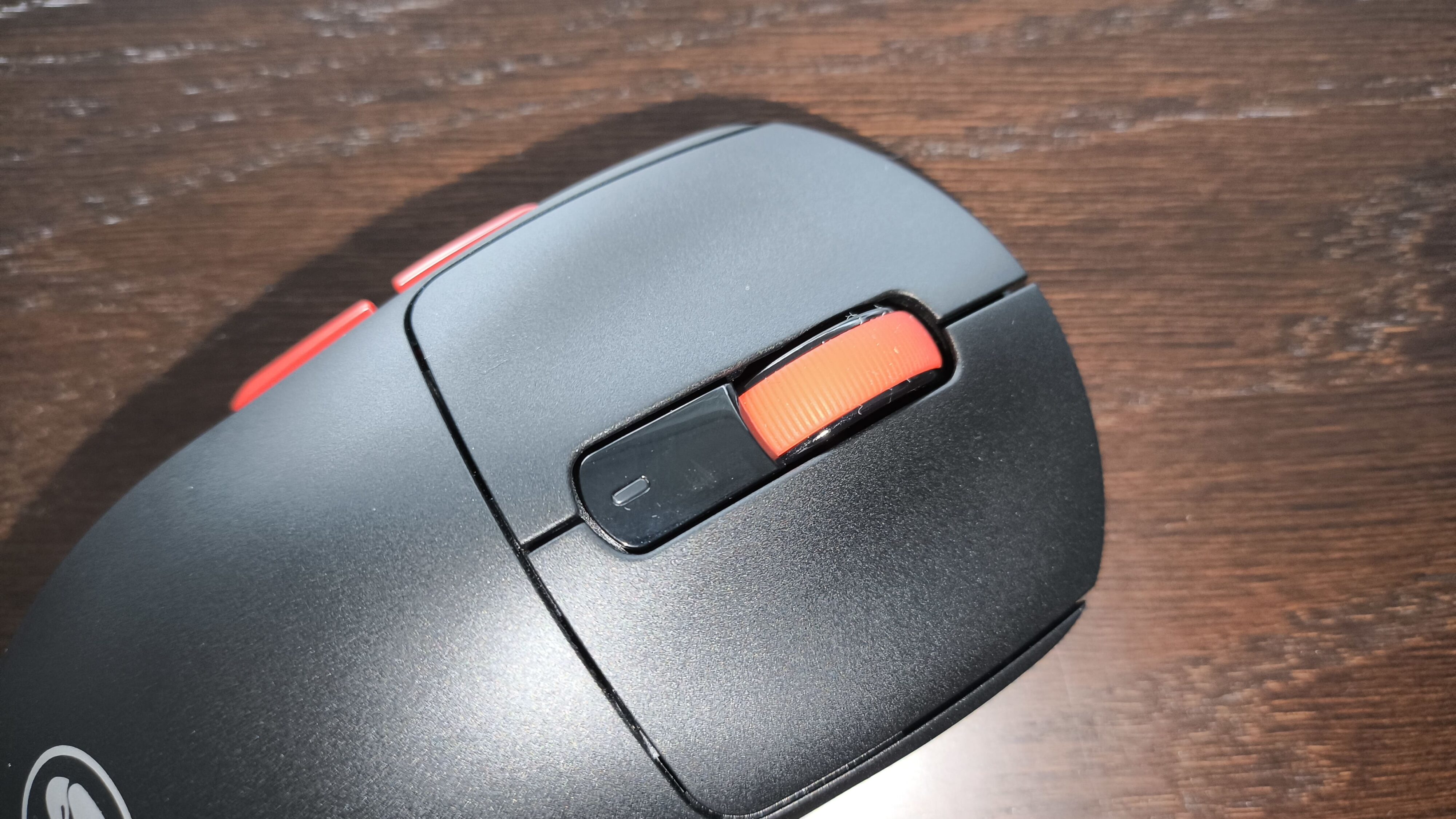 Myszka na wyposażeniu posiada też trzeci przycisk, który służy do parowania urządzenia w trybie Bluetooth. Choć funkcjonalność ta jest jak najbardziej przydatna w przypadku, gdy użytkownik zdecyduje się na połączenie bezprzewodowe, warto zastanowić się, czy takie rozwiązanie jest absolutnie konieczne. Z punktu widzenia wygody mogłoby to zostać zintegrowane w bardziej przejrzysty sposób, na przykład za pomocą jednego przełącznika trybów, który w prostszy sposób łączyłby funkcje 2.4 GHz oraz Bluetooth. Tego rodzaju rozwiązanie mogłoby poprawić estetykę i wygodę obsługi, eliminując dodatkowy przycisk, który może wprowadzać niepotrzebny chaos w interfejsie użytkownika.
