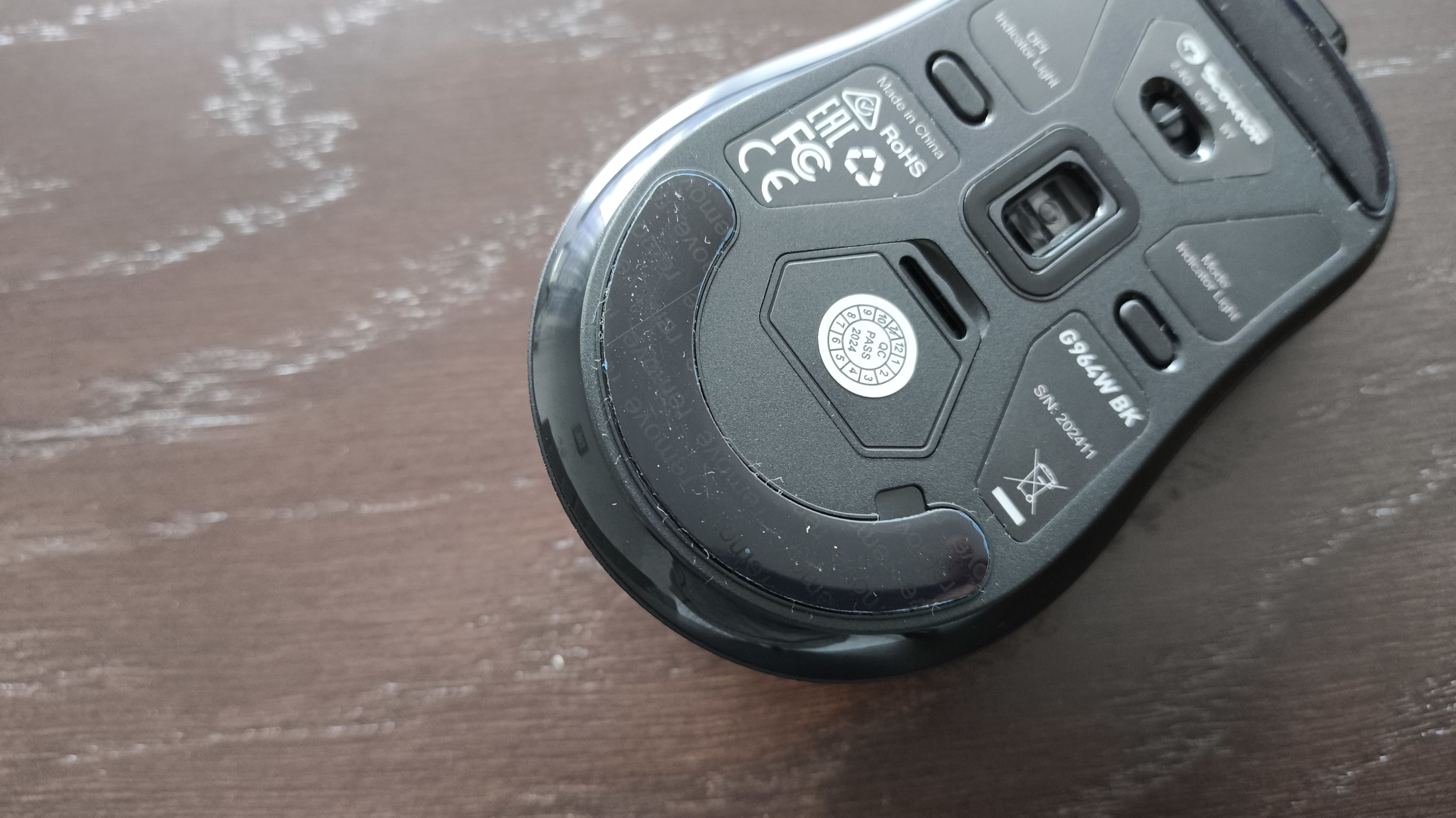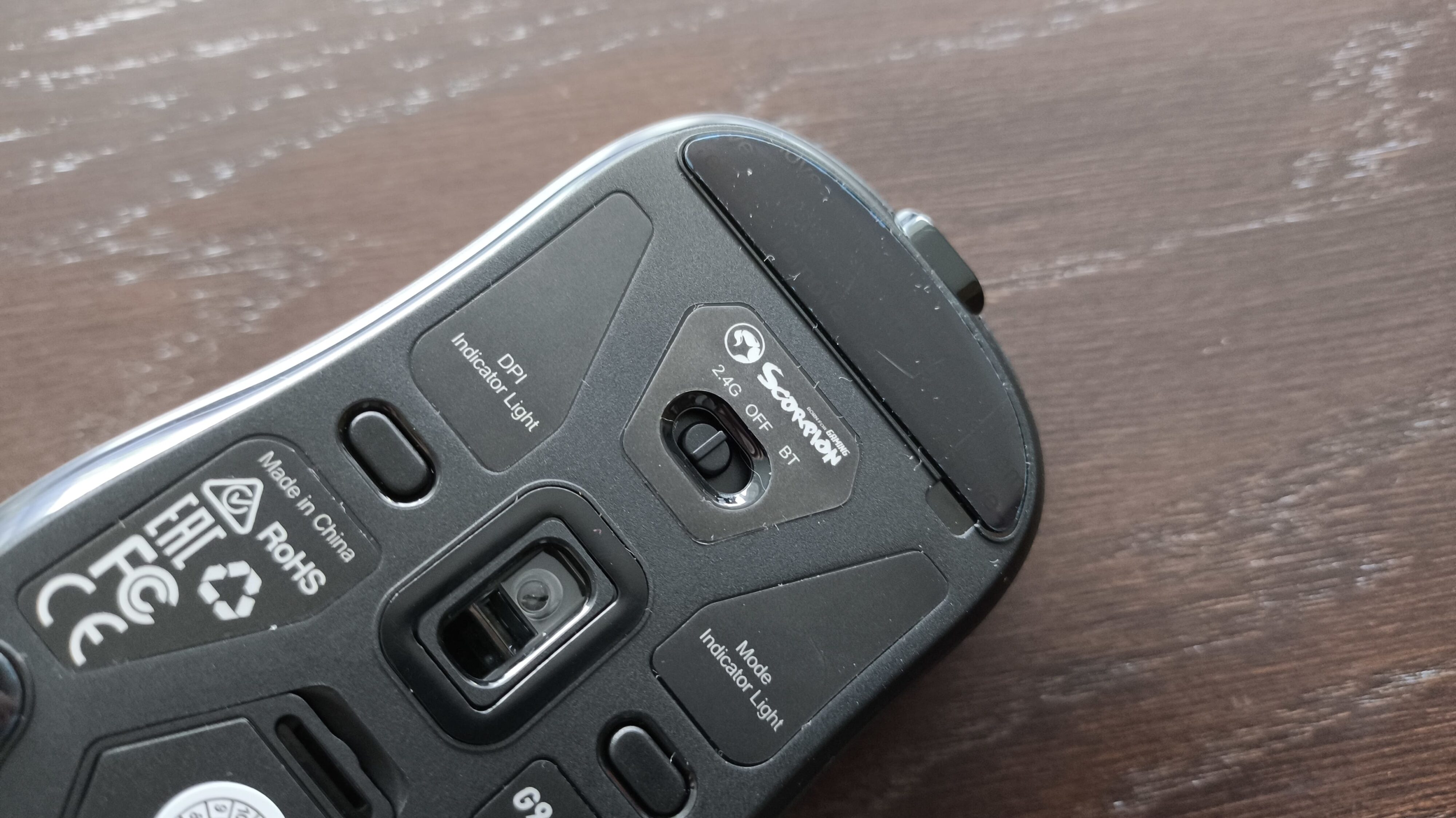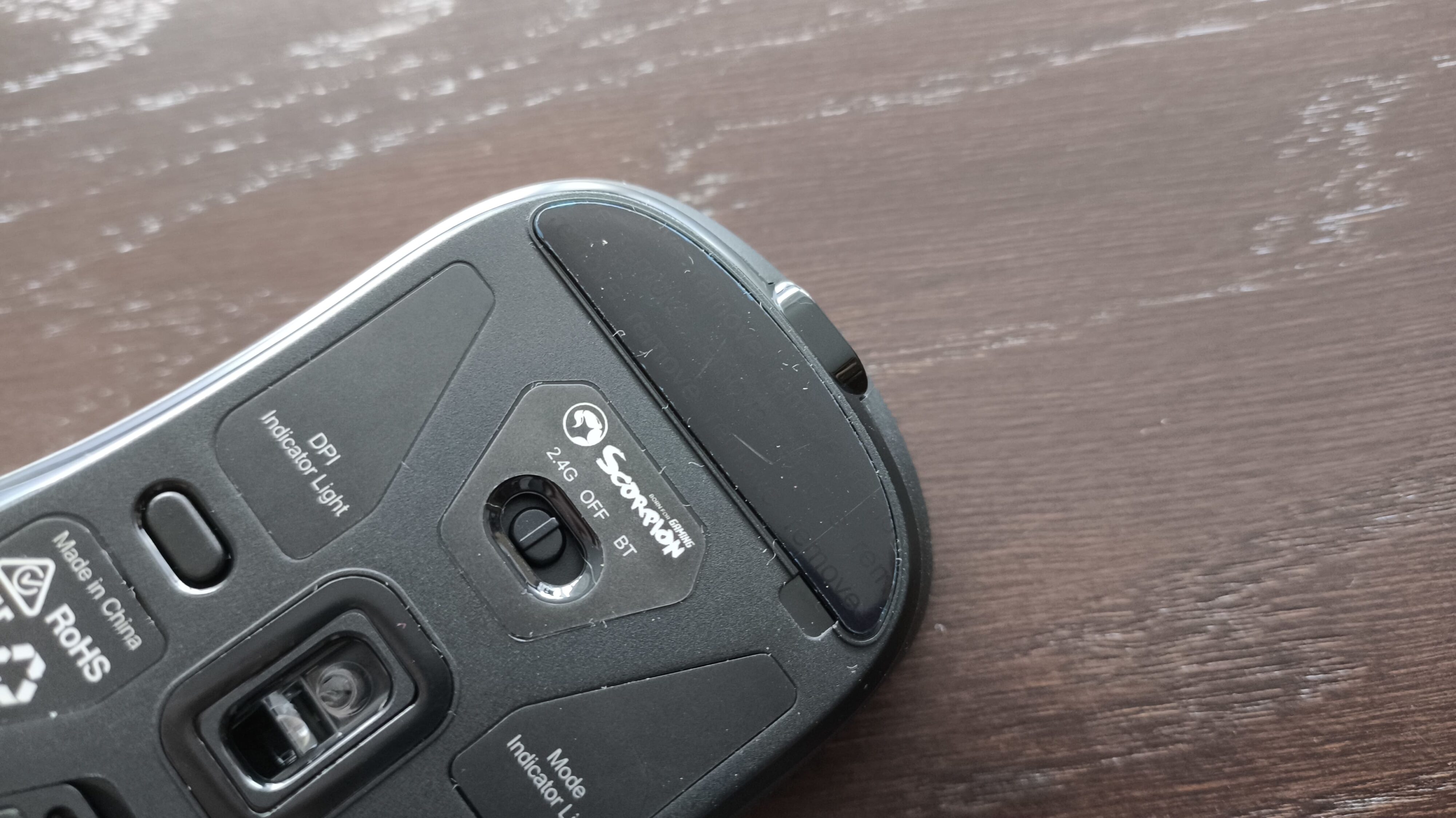 W dolnej części myszki Marvo Niro 60W znajdują się kluczowe elementy, które znacząco wpływają na wygodę użytkowania i funkcjonalność urządzenia. Przede wszystkim zauważymy przełącznik trybów pracy, który pozwala na przełączanie między trzema trybami – 2.4 GHz, Bluetooth (BT) oraz OFF. Jest to istotne, gdyż umożliwia elastyczność w połączeniach z różnymi urządzeniami, co daje użytkownikowi większą swobodę w zależności od preferencji i potrzeb.