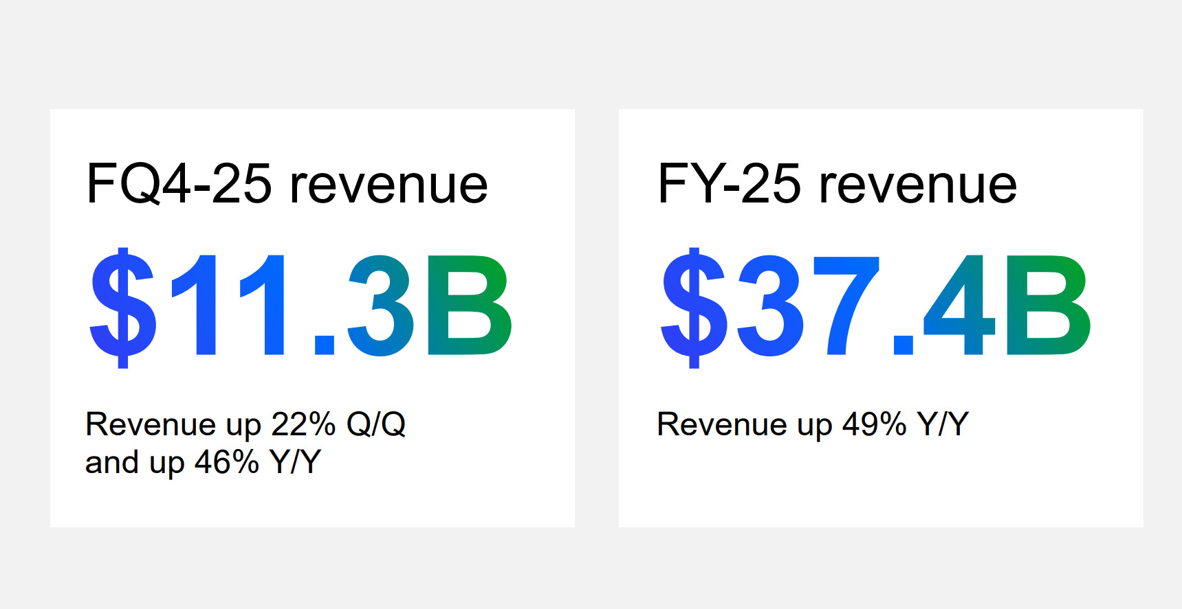 W całym roku fiskalnym 2025 firma wypracowała 37,38 mld USD przychodów, co oznacza ogromny wzrost względem 25,11 mld USD rok wcześniej. Zysk netto w ujęciu GAAP wyniósł 8,54 mld USD (7,59 USD na akcję), a w ujęciu non-GAAP 9,47 mld USD (8,29 USD na akcję). Przepływy operacyjne wyniosły 17,53 mld USD wobec 8,51 mld USD rok wcześniej.